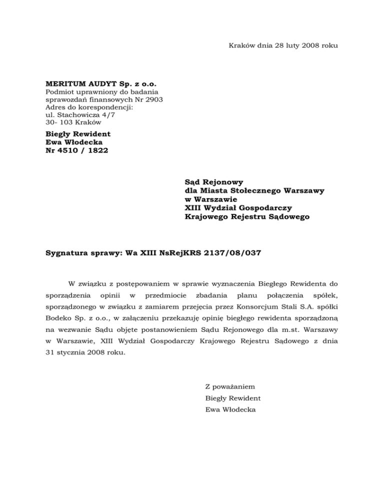 Kraków dnia 28 luty 2008 roku MERITUM AUDYT Sp. z o.o. Podmiot uprawniony do badania sprawozdań finansowych Nr 2903 Adres do korespondencji: ul. Stachowicza 4/7 30- 103 Kraków Biegły Rewident Ewa Włodecka Nr 4510 / 1822 Sąd Rejonowy dla Miasta Stołecznego Warszawy w Warszawie XIII Wydział Gospodarczy Krajowego Rejestru Sądowego Sygnatura sprawy: Wa XIII NsRejKRS 2137/08/037 W związku z postępowaniem w sprawie wyznaczenia Biegłego Rewidenta do sporządzenia opinii w przedmiocie zbadania planu połączenia spółek, sporządzonego w związku z zamiarem przejęcia przez Konsorcjum Stali S.A. spółki Bodeko Sp. z o.o., w załączeniu przekazuję opinię biegłego rewidenta sporządzoną na wezwanie Sądu objęte postanowieniem Sądu Rejonowego dla m.st. Warszawy w Warszawie, XIII Wydział Gospodarczy Krajowego Rejestru Sądowego z dnia 31 stycznia 2008 roku. Z poważaniem Biegły Rewident Ewa Włodecka OPINIA BIEGŁEGO REWIDENTA Z BADANIA PLANU POŁĄCZENIA poprzez przejęcie przez Konsorcjum Stali S.A. spółki przejmowanej Bodeko Spółka z o.o. Dla Sądu Rejonowego dla m. st. Warszawy w Warszawie Wydz. XIII Gospodarczy Krajowego Rejestru Sądowego Spółka przejmująca: KONSORCJUM STALI S.A. z siedzibą w Warszawie ul. Stężycka 11 Regon 001333637 NIP 5220004379 KRS 0000279883 Spółka przejmowana: „BODEKO” Sp. z o.o. z siedzibą w Zawierciu ul. Paderewskiego 120 Regon 277209952 NIP 6492051086 KRS 0000013469 2 I. Podstawa Badania: Badanie przeprowadzono na podstawie postanowienia Sądu Rejonowego dla m. st. Warszawy w Warszawie, XIII Wydział Gospodarczy Krajowego Rejestru Sądowego z dnia 31 stycznia 2008r, (sygnatura akt Wa XIII NsRejKRS 2137/08/037 o wyznaczenie biegłego rewidenta Ewy Włodeckiej nr ewidencyjny KIBR 4510/1822, działającej poprzez Meritum Audyt Spółkę z o.o. w Krakowie ul. Stachowicza 4/7 jako podmiot uprawniony do badania sprawozdań finansowych nr ewidencyjny 2903. II. Przedmiot badania: Przedmiotem badania jest 1) plan połączenia poprzez przejęcie przez Konsorcjum Stali SA z siedzibą w Warszawie ul. Stężycka 11, spółki przejmowanej Bodeko Spółka z o.o. z siedzibą w Zawierciu ul. Paderewskiego 120. Badanie planu połączenia przeprowadzono w zakresie jego poprawności i rzetelności. 2) Stwierdzenie, czy stosunek wymiany udziałów na akcje został ustalony należycie. 3) Wskazanie metody użytej dla określenia proponowanego w planie połączenia stosunku wymiany udziałów na akcje, wraz z oceną zasadności ich zastosowania (ocena w zakresie co do metod księgowych wyceny majątków spółek). 4) Wskazanie szczególnych trudności związanych z wyceną udziałów łączących się spółek, w szczególności związanych z rachunkowością spółek. Za sporządzenie planu przekształcenia odpowiedzialne są Zarządy spółek. Moim zadaniem, zgodnie z art.502 kodeksu spółek handlowych było poddanie badaniu powyższego planu połączenia i wydanie opinii w zakresie jego poprawności i rzetelności. Badanie to przeprowadziłam stosownie do: 3 · artykułu 502 oraz art. 503 ustawy z dnia 15 września 2000 r. kodeksu spółek handlowych (Dz. U. Nr 94, późniejszymi zmianami 1037 z późniejszymi zmianami) zwanego dalej KSH, · norm wykonywania zawodu biegłego rewidenta, wydanych przez Krajową Radę Biegłych Rewidentów w Polsce. III. Badanie polegało na następujących procedurach: 1. Sprawdzenie w zakresie poprawności i rzetelności informacji i obliczeń zawartych w dokumentach stanowiących plan połączenia wraz z załącznikami. W zakresie poprawności badano, czy spełniono wszelkie wymogi formalne i merytoryczne co do informacji zawartych w treści planu połączenia i załącznikach do tego planu. W zakresie rzetelności badano zgodność przedstawionych obliczeń z rzeczywistym przebiegiem operacji gospodarczych, w tym przypadku czy stosunek wymiany, ustalenie wartości majątku, informacje o stanie majątkowym w załączonych dokumentach są wyliczone bezbłędnie i w oparciu o rzeczywiste dane finansowe. Sprawdzono, czy załączone bilanse będące podstawą oświadczeń Zarządów o stanie księgowym spółek, sporządzono na podstawie właściwych dokumentów księgowych i przy zastosowaniu tych samych metod i w takim samym układzie jak ostatni bilans roczny. 2. Sprawdzenie wyliczeń zawartych w raporcie rzeczoznawcy majątkowego: „Wyceny przedsiębiorstwa Konsorcjum Stali S.A. i Bodeko Sp. z o.o. do ustalenia zasady przeliczenia udziałów Bodeko Sp. z o.o na akcje Konsorcjum Stali S.A. w związku z połączeniem przedsiębiorstw”, sporządzonego przez Rzeczoznawstwo Majątkowe s. c. Marek Juszczak, Sylwia Juszczak, Maciej Juszczak z siedzibą w Pruszkowie. Biegły sprawdzał, czy ustaleń dokonano w oparciu o poprawne dane bazowe oraz prognozy będące podstawą wyceny, czy wynikają z założeń opartych na danych historycznych, czy przyjęty model wyceny jest poprawny. 3. Wyliczenie wartości księgowej łączących z prezentowanymi metodami wyceny. 4 się spółek, celem porównania IV. USTALENIA: 1. Przeprowadzone badanie stanowi wystarczającą podstawę do wyrażenia niniejszej opinii: a) Plan połączenia spółek, sporządzony w związku z zamiarem przejęcia przez Konsorcjum Stali S.A. spółki Bodeko Sp. z o.o., został sporządzony prawidłowo i rzetelnie. Nie zgłaszając zastrzeżeń co do poprawności i rzetelności planu połączenia, biegły zwraca uwagę na prezentowane oświadczenie (Załącznik nr 4) „…że załączona wycena Spółki Przejmowanej i Spółki Przejmującej została sporządzona przez RZECZOZNAWSTWO MAJATKOWE s. c. Marek Juszczak, Sylwia Juszczak, Maciej Juszczak ( 05-800 Pruszków Al. Wojska Polskiego 11) na dzień 1 grudnia 2007r. …”. Należy uściślić, że wycena majątkowa została sporządzona na podstawie stanu księgowego z dnia 1.12.2007r, natomiast rzeczoznawcy majątkowi dokonali aktualizacji majątku, jak również uwzględnili wydarzenia po 1 grudnia 200
