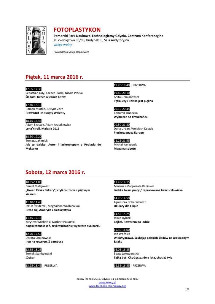 FOTOPLASTYKON Pomorski Park Naukowo-Technologiczny Gdynia, Centrum Konferencyjne al. Zwycięstwa 96/98, budynek III, Sala Audytoryjna wstęp wolny Prowadząca: Alicja Rapsiewicz Piątek, 11 marca 2016 r. 19.20-19.40 | PRZERWA 17.05-17.35 Sebastian Ody, Kacper Płocki, Nicole Płocka Śladami trzech wielkich bitew 17.40-18.10 Roman Miotke, Justyna Zorn Prowadził ich święty Walenty 19.40-20.10 Anita Demianowicz Pętla, czyli Polska jest piękna 20.15-20.45 Bohumil Trunečka Wybrzeże na dmuchańcu 18.15-18.45 Adam Szostek, Adam Araszkiewicz Long’n’roll. Malezja 2015 20.50-21.20 Daria Urban, Wojciech Kostyk Piechotą przez Europę 18.50-19.20 Tomasz Jakimiuk Jak to daleko. Auto- i jachtostopem z Podlasia do Meksyku 21.25-21.55 Michał Kankowski Mapa na sobotę Sobota, 12 marca 2016 r. 10.35-11.05 Daniel Małajowicz „Green Kayak Bakery”, czyli co zrobić z piątką w kieszeni 11.10-11.40 Jakub Świderski, Magdalena Wróblewska Przed się. Ameryka i biciturystyka 11.45-12.15 Krzysztof Michalski, Norbert Pokorski Kajaki zamiast sań, czyli wschodnie wybrzeże Svalbardu 13.45-14.15 Mariusz i Małgorzata Kaniowie Ludzka twarz pracy / zapracowana twarz człowieka 14.20-14.50 Agnieszka Doberschuetz Okulary dla Filipin 14.55-15.25 Jakub Rybicki Bajkał. Rowerem po lodzie 12.20-12.50 Dorota Chojnowska Iran na rowerze. Z bambusa 15.30-16.00 Jan Woźnica WikiWyprawa. Szukając polskich śladów na Jedwabnym Szlaku 12.55-13.25 Tomek Staniszewski iDakar 16.05-16.35 Beata Jakuszewska Tajką być! Choć przez dwa lata, chociaż tyle 13.25-13.45 | PRZERWA 16.35-16.55 | PRZERWA Kolosy (za rok) 2015, Gdynia, 11-13 marca 2016 roku www.kolosy.pl www.facebook.com/kolosy.org 1/2 16.55-17.25 Robert Gondek Namibia, Botswana - góry, przyroda, przestrzeń 19.30-20.00 Michał Jędrzejewski, Anna Jaśkaniec Cambodia Moto Tour 2015 17.30-18.00 Łukasz Supergan Pireneje. Najdłuższa grań 20.05-20.35 Marcin Miłoszewski Na STOPach przez świat. Chiny (i dalej) 18.05-18.35 Szczepan Ligęza Do źródeł rzeki, której nie ma 20.40-21.10 Cezary Wyszyński, Désirée van Thiel Zaginione Królestwo Myszek 18.40-19.10 Marek Strzelichowski Loara zaprasza Wisłę, czyli rejs z Krakowa do Orleanu 21.15-21.45 Michał Woroch, Maciej Kamiński Wheelchairtrip 19.10-19.30 | PRZERWA Niedziela, 13 marca 2016 r. 10.30-11.00 Patrycja Szczepkowska Bo bardzo chciałam 12.15-12.50 Zygmunt Leśniak, Małgorzata Jarmułowicz Słodko-słona Sabu albo indonezyjski koniec świata 11.05-11.35 Marcin Sanetra Svalbard. Cztery pory roku 12.55-13.25 Przemysław Śleziak Jak gringo stał się latino 11.40-12.10 Władysław Labuda 974 bezpłatne noclegi Prezentacjom w Pomorskim Parku Naukowo-Technologicznym Gdynia będzie towarzyszyła wystawa zdjęć Jana Siemińskiego „Zakątki Europy w krajobrazie. Minimal”. Ponadto w PPNT w sali kinowej na parterze oraz w salach D i E na I piętrze (łącznie 422 miejsca) przeprowadzimy bezpośrednią transmisję pokazów z Dużej Sali (Gdynia Arena) - w piątek od 17.00 do 22.20, w sobotę od 10.00 do 22.45 i w niedzielę od 10.00 do 15.40 (każdego dnia sale będą otwierane na 30 minut przed początkiem transmisji). Kolosy (za rok) 2015, Gdynia, 11-13 marca 2016 roku www.kolosy.pl www.facebook.com/kolosy.org 2/2