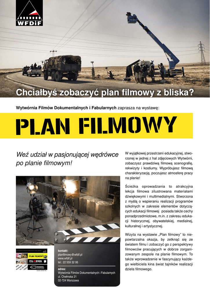 38 Chciałbyś zobaczyć plan filmowy z bliska? Wytwórnia Filmów Dokumentalnych i Fabularnych zaprasza na wystawę: Weź udział w pasjonującej wędrówce po planie filmowym! W wyjątkowej przestrzeni edukacyjnej, stworzonej w jednej z hal zdjęciowych Wytwórni, zobaczysz prawdziwą filmową scenografię, rekwizyty i kostiumy. Wypróbujesz filmową charakteryzację, poczujesz atmosferę pracy na planie! Ścieżka oprowadzania to atrakcyjna lekcja filmowa zilustrowana materiałami dźwiękowymi i multimedialnymi. Stworzona z myślą o wspieraniu realizacji programów szkolnych w zakresie elementów dotyczących edukacji filmowej posiada także cechy ponadprzedmiotowe, m.in. z zakresu edukacji historycznej, obywatelskiej, medialnej, kulturalnej i artystycznej. kontakt: [email protected] www.wfdif.pl tel.: 22 559 32 06 adres: Wytwórnia Filmów Dokumentalnych i Fabularnych ul. Chełmska 21 02-724 Warszawa Wizyta na wystawie „Plan filmowy” to niepowtarzalna okazja, by zetknąć się ze światem filmu i zobaczyć go z perspektywy filmowców pracujących w dobrze zorganizowanym zespole na planie filmowym. To także wprowadzenie w fascynujący każdego wielbiciela kina świat tajników realizacji dzieła filmowego.
