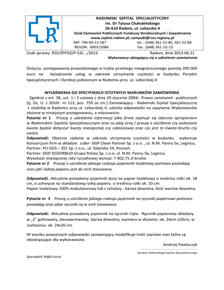 RADOMSKI SZPITAL SPECJALISTYCZNY im. Dr Tytusa Chałubińskiego 26-610 Radom, ul. Lekarska 4 Dział Zamówień Publicznych Funduszy Strukturalnych i Zaopatrzenia www.szpital.radom.pl; [email protected] NIP: 796-00-12-187 tel.: (048) 361-52-85, 361-52-84 REGON: 000315086 fax.: (048) 361-52-13 Znak sprawy: RSS/ZPFSiZ/P-53/.../2013 Radom, dnia 2013.06.21 Wykonawcy ubiegający się o udzielenie zamówienia Dotyczy: postępowania prowadzonego w trybie przetargu nieograniczonego poniżej 200 000 euro na świadczenie usług w zakresie utrzymanie czystości w budynku Poradni Specjalistycznych i Dyrekcji położonym w Radomiu przy ul. Lekarskiej 4 WYJAŚNIENIA DO SPECYFIKACJI ISTOTNYCH WARUNKÓW ZAMÓWIENIA Zgodnie z art. 38, ust. 1 i 2 ustawy z dnia 29 stycznia 2004r. Prawo zamówień publicznych (tj. Dz. U. z 2010r. nr 113, poz. 759 ze zm.) Zamawiający - Radomski Szpital Specjalistyczny z siedzibą w Radomiu przy ul. Lekarskiej 4, udziela odpowiedzi na zapytania Wykonawców złożone w niniejszym postępowaniu, a mianowicie: Pytanie nr 1 Proszę o udzielenie informacji jaka firma zajmuje się obecnie sprzątaniem w Radomskim Szpitalu Specjalistycznym oraz za jaką cenę ( proszę o uściślenie czy wskazana kwota będzie dotyczyć kwoty miesięcznej czy całościowej oraz czy jest to kwota brutto czy netto). Odpowiedź: Obecnie zadanie w zakresie utrzymania czystości w budynku wykonuje Konsorcjum firm w składzie: Lider- DGP Clean Partner Sp. z o.o. , ul. N.M. Panny 5e, Legnica, Partner: PU GOS – ZEC Sp. z o.o., ul. Gdyńska 54, Poznań, Partner: DGP DOZORBUD Grupa Polska Sp. z o.o. ul. N.M. Panny 5e, Legnica. Wysokość miesięcznej raty ryczałtowej wynosi: 7 902,75 zł brutto Pytanie nr 2 Proszę o uściślenie jakiego rodzaju pojemniki toaletowy państwo posiadają oraz jaki rodzaj papieru jest do nich stosowany. Odpowiedź. Aktualnie posiadamy pojemnik duży na papier toaletowy o średnicy rolki ok. 18 cm, o uchwycie na standardową rolkę papieru o średnicy rolki ok. 10 cm. Papier toaletowy 100% makulaturowy lub z celulozy , barwa dowolna, ilość warstw dowolna. Pytanie nr 3 Proszę o uściślenie jakiego rodzaju pojemnik na ręczniki papierowe państwo posiadają oraz jakie ręczniki są w nich stosowane. Odpowiedź: Aktualnie posiadamy pojemnik na ręczniki cięte. Ręczniki papierowy składany w „Z” gofrowany, dwuwarstwowy, barwa dowolna, wymiary w złożeniu: ok. 24cm x10cm, w rozłożeniu: ok. 24x20 cm. W wyniku powyższych odpowiedzi zamawiający modyfikuje treść zapisów siwz które są obowiązujące dla wykonawców. Andrzej Pawluczyk ……………..…..…………………………………………………… Dyrektor Radomskiego Szpitala Specjalistycznego Sporządził: Rafał Lesisz Po zmianach w dniu 2013.06.21 (………) OPIS PRZEDMIOTU ZAMÓWIENIA Zakres prac obejmuje wykonywanie następujących czynności we wszystkich pomieszczeniach bez gabinetów zabiegowych : codziennie: - sprzątanie, mycie i dezynfekcja gabinetów lekarskich , - sprzątanie pomieszczeń biurowych, socjalnych, szatni itp., - mycie podłóg korytarzy, pomieszczeń, schodów, wind itp., - mycie i dezynfekcja sanitariatów, dezynfekcja klamek, - maszynowe polerowanie powierzchni pokrytych tarketem padem białym lub padem z mikrofazy dla osiągnięcia efektu wizualnego wykonanej pracy, - usuwanie piasku i zanieczyszczeń z prowadnic drzwi dwóch wind osobowych, wewnętrznych za pomocą odkurzacza. jeden raz w miesiącu lub w zależności od potrzeb: - mycie lamperii, - mycie drzwi, - czyszczenie parapetów wewnętrznych, - mycie kratek wentylacyjnych. jeden raz na kwartał lub w zależności od potrzeb: - mycie okien- obustronne mycie szyb i ram, wewnętrznych profili, - mycie parapetów zewnętrznych, - mycie grzejników, - mycie elementów oświetlenia pomieszczeń. 2 razy w roku: - gruntowne mycie i zabezpieczenie powłoką ochronno - pielęgnującą powierzchni podłóg pokrytych tarketem. Zakres prac przy utrzymaniu czystości w gabinetach zabiegowych: codzienne: - mycie i dezynfekcja wyposażenia gabinetów zabiegowych – stołów zabiegowych , szafek, lamp, stolików, krzeseł itp., - mycie i dezynfekcja umywalek, utrzymanie w bieżącej czystości armatury, - mycie podłóg i parapetów. jeden raz w tygodniu - mycie grzejników, - mycie glazury ścian , - mycie drzwi, jeden raz w miesiącu lub w zależności od potrzeb. - mycie okien, obustronne mycie szyb i ram, wewnętrznych profili, - mycie parapetów zewnętrznych, - mycie elementów oświetlenia w pomieszczeniach, - mycie kratek wentylacyjnych. 2 razy w roku: - gruntowne mycie i zabezpieczenie powłoką ochronno - pielęgnującą powierzchni podłóg pokrytych tarketem. Rodzaje posadzek i ich wielkość : rodzaj posadzki: wielkość posadzki tarket - 1245,60 m2 terakota 428,17 m2 wykładzina PCV + płytki PCV 790,40 m2 lastryko Wykładzina dywanowa Razem: - 117,69 m2 40,37 m2 2622,23 m2 Wielkość powierzchni ze względu na ich funkcje: - gabinety lekarskie, sale operacyjne i gabinety zabiegowe - 665,72 m2 - pomieszczenia biurowe, socjalne, korytarze, klatki schodowe, windy - 1865,66 m2 - sanitariaty, brudowniki - 90,85 m2 Razem: 2622,23 m2 Budynek podzielony jest na trzy strefy czystości o symbolach: - zielona ( gabinety lekarskie, sale operacyjne i gabinety zabiegowe) - niebieska( pomieszczenia biurowe, socjalne, korytarze, klatki schodowe, windy) - czerwona ( sanitariaty, brudowniki) Wielkość powierzchni dla poszczególnych stref utrzymania czystości: Nazwa strefy Powierzchnia strefy strefa zielona - 665,72 m2 strefa niebieska - 1865,66 m2 strefa czerwona - 90,85 m2 Razem: 2622,23 m2 Wielkość powierzchni okien w budynku - ( szyba + rama – powierzchnia 1 strona), łącznie z oszkleniem drzwi wejściowych do budynku ( szyba + rama – powierzchnia 1 strona), drzwi na kondygnacjach ( szyba + rama – powierzchnia 1 strona), oszklenie kartoteki dla pacjentów( szyba – powierzchnia 1 strona) : 547,49 m2 Do oszacowani