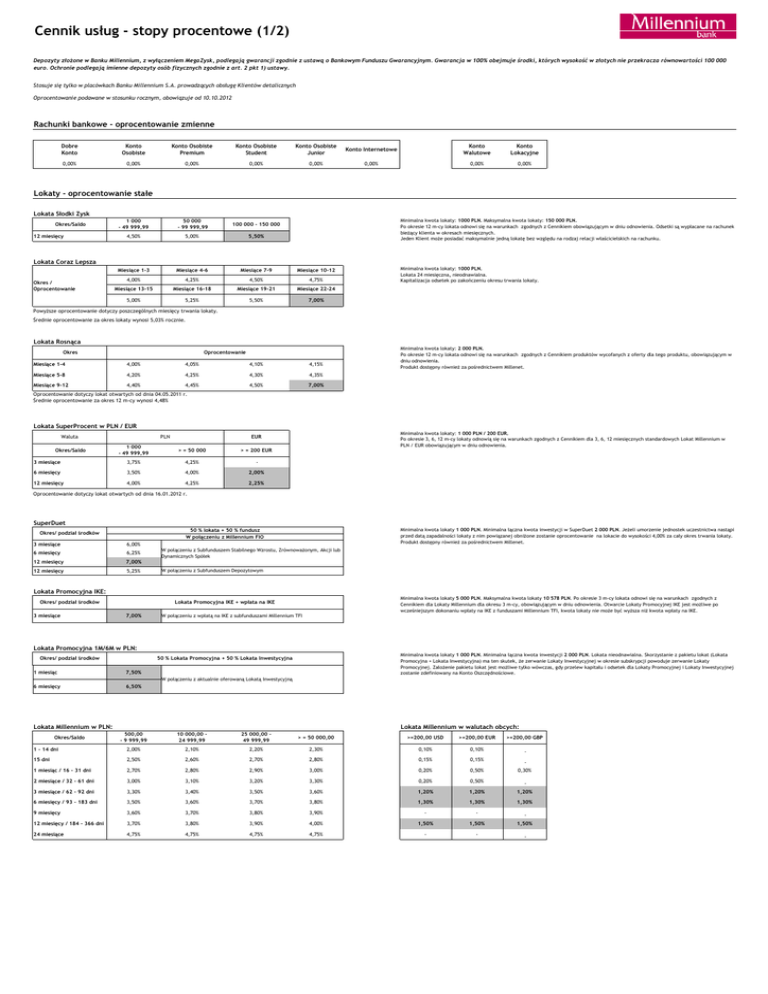 Cennik usług - stopy procentowe (1/2) Depozyty złożone w Banku Millennium, z wyłączeniem MegaZysk, podlegają gwarancji zgodnie z ustawą o Bankowym Funduszu Gwarancyjnym. Gwarancja w 100% obejmuje środki, których wysokość w złotych nie przekracza równowartości 100 000 euro. Ochronie podlegają imienne depozyty osób fizycznych zgodnie z art. 2 pkt 1) ustawy. Stosuje się tylko w placówkach Banku Millennium S.A. prowadzących obsługę Klientów detalicznych Oprocentowanie podawane w stosunku rocznym, obowiązuje od 10.10.2012 Rachunki bankowe - oprocentowanie zmienne Dobre Konto Konto Osobiste Konto Osobiste Premium Konto Osobiste Student Konto Osobiste Junior Konto Internetowe Konto Walutowe Konto Lokacyjne 0,00% 0,00% 0,00% 0,00% 0,00% 0,00% 0,00% 0,00% 1 000 - 49 999,99 50 000 - 99 999,99 100 000 - 150 000 4,50% 5,00% 5,50% Miesiące 1-3 Miesiące 4-6 Miesiące 7-9 Miesiące 10-12 4,00% 4,25% 4,50% 4,75% Miesiące 13-15 Miesiące 16-18 Miesiące 19-21 Miesiące 22-24 5,00% 5,25% 5,50% 7,00% 4,15% Lokaty - oprocentowanie stałe Lokata Słodki Zysk Okres/Saldo 12 miesięcy Minimalna kwota lokaty: 1000 PLN. Maksymalna kwota lokaty: 150 000 PLN. Po okresie 12 m-cy lokata odnowi się na warunkach zgodnych z Cennikiem obowiązującym w dniu odnowienia. Odsetki są wypłacane na rachunek bieżący klienta w okresach miesięcznych. Jeden Klient może posiadać maksymalnie jedną lokatę bez względu na rodzaj relacji właścicielskich na rachunku. Lokata Coraz Lepsza Okres / Oprocentowanie Minimalna kwota lokaty: 1000 PLN. Lokata 24 miesięczna, nieodnawialna. Kapitalizacja odsetek po zakończeniu okresu trwania lokaty. Powyższe oprocentowanie dotyczy poszczególnych miesięcy trwania lokaty. Średnie oprocentowanie za okres lokaty wynosi 5,03% rocznie. Lokata Rosnąca Oprocentowanie Okres Miesiące 1-4 4,00% 4,05% 4,10% Miesiące 5-8 4,20% 4,25% 4,30% 4,35% Miesiące 9-12 4,40% 4,45% 4,50% 7,00% Minimalna kwota lokaty: 2 000 PLN. Po okresie 12 m-cy lokata odnowi się na warunkach zgodnych z Cennikiem produktów wycofanych z oferty dla tego produktu, obowiązującym w dniu odnowienia. Produkt dostępny również za pośrednictwem Millenet. Oprocentowanie dotyczy lokat otwartych od dnia 04.05.2011 r. Średnie oprocentowanie za okres 12 m-cy wynosi 4,48% Lokata SuperProcent w PLN / EUR PLN Waluta Minimalna kwota lokaty: 1 000 PLN / 200 EUR. Po okresie 3, 6, 12 m-cy lokaty odnowią się na warunkach zgodnych z Cennikiem dla 3, 6, 12 miesięcznych standardowych Lokat Millennium w PLN / EUR obowiązującym w dniu odnowienia. EUR 1 000 - 49 999,99 > = 50 000 3 miesiące 3,75% 4,25% - 6 miesięcy 3,50% 4,00% 2,00% 12 miesięcy 4,00% 4,25% 2,25% Okres/Saldo > = 200 EUR Oprocentowanie dotyczy lokat otwartych od dnia 16.01.2012 r. SuperDuet Minimalna kwota lokaty 1 000 PLN. Minimalna łączna kwota inwestycji w SuperDuet 2 000 PLN. Jeżeli umorzenie jednostek uczestnictwa nastąpi przed datą zapadalności lokaty z nim powiązanej obniżone zostanie oprocentowanie na lokacie do wysokości 4,00% za cały okres trwania lokaty. Produkt dostępny również za pośrednictwem Millenet. 50 % lokata + 50 % fundusz W połączeniu z Millennium FIO Okres/ podział środków 3 miesiące 6,00% W połączeniu z Subfunduszem Stabilnego Wzrostu, Zrównoważonym, Akcji lub Dynamicznych Spółek 6 miesięcy 6,25% 12 miesięcy 7,00% 12 miesięcy 5,25% W połączeniu z Subfunduszem Depozytowym 7,00% W połączeniu z wpłatą na IKE z subfunduszami Millennium TFI Lokata Promocyjna IKE: Okres/ podział środków 3 miesiące Minimalna kwota lokaty 5 000 PLN. Maksymalna kwota lokaty 10 578 PLN. Po okresie 3 m-cy lokata odnowi się na warunkach zgodnych z Cennikiem dla Lokaty Millennium dla okresu 3 m-cy, obowiązującym w dniu odnowienia. Otwarcie Lokaty Promocyjnej IKE jest możliwe po wcześniejszym dokonaniu wpłaty na IKE z funduszami Millennium TFI, kwota lokaty nie może być wyższa niż kwota wpłaty na IKE. Lokata Promocyjna IKE + wpłata na IKE Lokata Promocyjna 1M/6M w PLN: Okres/ podział środków Minimalna kwota lokaty 1 000 PLN. Minimalna łączna kwota inwestycji 2 000 PLN. Lokata nieodnawialna. Skorzystanie z pakietu lokat (Lokata Promocyjna + Lokata Inwestycyjna) ma ten skutek, że zerwanie Lokaty Inwestycyjnej w okresie subskrypcji powoduje zerwanie Lokaty Promocyjnej. Założenie pakietu lokat jest możliwe tylko wówczas, gdy przelew kapitału i odsetek dla Lokaty Promocyjnej i Lokaty Inwestycyjnej zostanie zdefiniowany na Konto Oszczędnościowe. 50 % Lokata Promocyjna + 50 % Lokata Inwestycyjna 1 miesiąc 7,50% 6 miesięcy 6,50% W połączeniu z aktualnie oferowaną Lokatą Inwestycyjną Lokata Millennium w PLN: Lokata Millennium w walutach obcych: 500,00 - 9 999,99 10 000,00 24 999,99 25 000,00 49 999,99 > = 50 000,00 >=200,00 USD >=200,00 EUR >=200,00 GBP 1 - 14 dni 2,00% 2,10% 2,20% 2,30% 0,10% 0,10% - 15 dni 2,50% 2,60% 2,70% 2,80% 0,15% 0,15% - 1 miesiąc / 16 - 31 dni 2,70% 2,80% 2,90% 3,00% 0,20% 0,50% 0,30% Okres/Saldo 2 miesiące / 32 - 61 dni 3,00% 3,10% 3,20% 3,30% 0,20% 0,50% - 3 miesiące / 62 - 92 dni 3,30% 3,40% 3,50% 3,60% 1,20% 1,20% 1,20% 1,30% 6 miesięcy / 93 - 183 dni 3,50% 3,60% 3,70% 3,80% 1,30% 1,30% 9 miesięcy 3,60% 3,70% 3,80% 3,90% - - - 12 miesięcy / 184 - 366 dni 3,70% 3,80% 3,90% 4,00% 1,50% 1,50% 1,50% 24 miesiące 4,75% 4,75% 4,75% 4,75% - - - Cennik usług - stopy procentowe (2/2) Depozyty złożone w Banku Millennium, z wyłączeniem MegaZysk, podlegają gwarancji zgodnie z ustawą o Bankowym Funduszu Gwarancyjnym. Gwarancja w 100% obejmuje środki, których wysokość w złotych nie przekracza równowartości 100 000 euro. Ochronie podlegają imienne depozyty osób fizycznych zgodnie z art. 2 pkt 1) ustawy. Stosuje się tylko w placówkach Banku Millennium S.A. prowadzących obsługę Klientów detalicznych Oprocentowanie podawane w stosunku rocznym, obowiązuje od 10.10.2012 Inne produkty oszczędnościowe w PLN Konto Oszczędnościowe Codziennie Wię