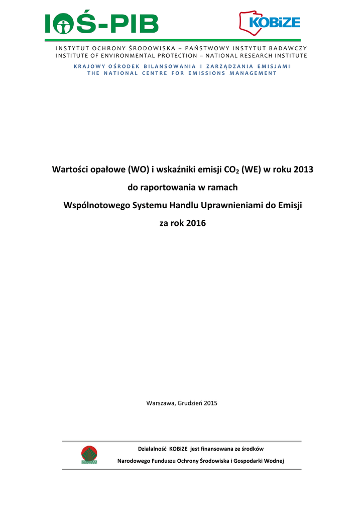 INSTYTUT OCHRONY ŚRODOWISKA – PAŃSTWOWY INSTYTUT BADAWCZY IN S TI TU TE O F E NV IR O N ME NT AL P RO T EC T ION – N AT ION AL R E S EA RC H I NS T IT UT E KRAJOWY OŚRODEK BILANSOWANIA I ZARZĄDZANIA EMISJAMI THE NATIONAL CENTRE FOR EMISSIONS MANAGEMENT Wartości opałowe (WO) i wskaźniki emisji CO2 (WE) w roku 2013 do raportowania w ramach Wspólnotowego Systemu Handlu Uprawnieniami do Emisji za rok 2016 Warszawa, Grudzień 2015 Działalność KOBiZE jest finansowana ze środków Narodowego Funduszu Ochrony Środowiska i Gospodarki Wodnej Prezentowane tabele zawierają dane na temat wartości opałowych (WO) i wskaźników emisji CO2 (WE) dla paliw wykorzystywanych w gospodarce krajowej w 2013 roku. W tabelach 1-13 zestawione zostały krajowe wartości WO i WE dla węgla dla poszczególnych rodzajów działalności (jeżeli wg danych statystycznych występowało w danym dziale zużycie tego paliwa). Wskaźniki emisji zestawione w tych tabelach odpowiadają wyłącznie podanej dla nich wartości opałowej. W tabeli 14 podane zostały wskaźniki emisji CO2 dla pozostałych paliw. Wartości tych wskaźników emisji oparte są na domyślnych wskaźnikach emisji C podawanych w wytycznych IPCC (2006 IPCC Guidelines for National Greenhouse Gas Inventories) i mogą być stosowane niezależnie od rodzaju działalności. Wartości opałowe w tabeli 14 (pochodzące z wytycznych IPCC) zostały podane w celach informacyjnych dla ułatwienia raportowania przez operatorów instalacji. Podmioty nie są zobligowane do stosowania wskaźnika emisji w połączeniu z podaną w tej tabeli wartością opałową. Wartości opałowe przedstawione w tabeli 14 nie są stosowane w krajowej inwentaryzacji emisji gazów cieplarnianych. Dodatkowo zamieszczona została tabela 15, w której podano wartości wskaźników emisji CO2 dla węgla kamiennego i brunatnego, obliczone na podstawie średnich krajowych wartości opałowych dla tych paliw (średnie wartości WO dla węgla kamiennego i brunatnego wyliczono na podstawie krajowego bilansu tych paliw dla roku 2013, przygotowanego w oparciu o dane zestawione wg metodyki Eurostatu). Wskaźniki emisji z tej tabeli mogą być wykorzystane przez operatorów instalacji tylko w przypadku, kiedy w danej instalacji zużywany był węgiel a w tabeli odpowiadającej danemu rodzajowi działalności (tab. 1-13) nie ma wartości WO i WE dla węgla (może to mieć miejsce w sytuacji, kiedy zużycie węgla w danej branży było tak niewielkie, że nie zostało wykazane w statystyce ogólnokrajowej). Emisji CO2 ze spalania biomasy (drewna opałowego i odpadów pochodzenia drzewnego, odpadów komunalnych biogenicznych i biogazu) nie wlicza się do sumy emisji ze spalania paliw, zgodnie z zasadami Wspólnotowego systemu handlu uprawnieniami do emisji oraz IPCC. Podejście to jest równoważne stosowaniu zerowego wskaźnika emisji dla biomasy. Współczynnik utlenienia jest już uwzględniony w wartości wskaźnika emisji danego paliwa. Wartości z tabel zawierających wskaźniki emisji i wartości opałowe dla węgla (tab. 1-13) należy wykorzystywać stosownie do podstawowego rodzaju działalności (PKD 2007) wpisywanego na sprawozdaniach G-02 i G-03. Dla poszczególnych rodzajów działalności w niniejszym opracowaniu dane są umieszczone następująco: Nr Rodzaj działalności tabeli Elektrownie i elektrociepłownie zawodowe 1 Elektrociepłownie przemysłowe 2 Ciepłownie 3 Koksownie 4 Produkcja żelaza i stali (grupy z działu 24 z wyjątkiem grup wymienionych poniżej – w tabeli 6) 5 Przemysł metali nieżelaznych (grupy: 24.4, 24.53, 24.54) 6 Przemysł chemiczny (dział 20 i 21) 7 Przemysł papierniczy i poligraficzny (dział 17 i 18) 8 Przemysł spożywczy (dział 10, 11 i 12) 9 Produkcja wyrobów z pozostałych mineralnych surowców niemetalicznych (dział 23) 10 Inne przemysły - z sekcji B (górnictwo i wydobywanie) działy: 07, 08, 09.9, z sekcji C (przetwórstwo przemysłowe) działy: 13-16, 22, 25-32 oraz sekcja F (budownictwo) działy: 41-43 11 Instytucje/handel/usługi 12 Rolnictwo, leśnictwo i rybołówstwo 13 Dla pozostałych paliw (innych niż węgiel) stosuje się wartości z tabeli 14, niezależnie od podstawowego rodzaju działalności (PKD). Wartości opałowe (WO) i wskaźniki emisji CO2 (WE) w roku 2013 do raportowania we Wspólnotowym Systemie Handlu Uprawnieniami do Emisji za rok 2016 Tabela 1. Elektrownie i elektrociepłownie zawodowe RODZAJ PALIWA Węgiel kamienny Węgiel brunatny Tabela 2. Elektrociepłownie przemysłowe RODZAJ PALIWA Węgiel kamienny Tabela 3. Ciepłownie RODZAJ PALIWA Węgiel kamienny Węgiel brunatny Tabela 4. Koksownie RODZAJ PALIWA Węgiel kamienny WO MJ/kg 21,34 8,23 WE CO2 kg/GJ 93,80 110,55 WO MJ/kg 22,72 WE CO2 kg/GJ 94,71 WO MJ/kg 21,67 8,36 WE CO2 kg/GJ 94,96 109,59 WO MJ/kg 29,40 WE CO2 kg/GJ 93,52 Tabela 5. Produkcja żelaza i stali (grupy z działu 24 z wyjątkiem wymienionych w tab. 6) RODZAJ PALIWA WO WE CO2 MJ/kg kg/GJ Węgiel kamienny 26,74 93,92 Tabela 6. Przemysł metali nieżelaznych (grupy 24.4, 24.53, 24.54) RODZAJ PALIWA WO MJ/kg Węgiel kamienny 22,60 Tabela 7. Przemysł chemiczny (dział 20 i 21) RODZAJ PALIWA Węgiel kamienny Tabela 8. Przemysł papierniczy i poligraficzny (dział 17 i 18) RODZAJ PALIWA Węgiel kamienny Tabela 9. Przemysł spożywczy (dział 10, 11 i 12) RODZAJ PALIWA Węgiel kamienny WE CO2 kg/GJ 94,73 WO MJ/kg 22,56 WE CO2 kg/GJ 94,74 WO MJ/kg 22,56 WE CO2 kg/GJ 94,74 WO MJ/kg 22,58 WE CO2 kg/GJ 94,74 Tabela 10. Produkcja wyrobów z pozostałych mineralnych surowców niemetalicznych (dział 23) RODZAJ PALIWA WO WE CO2 MJ/kg kg/GJ Węgiel kamienny 22,56 94,74 Węgiel brunatny 8,29 109,91 Tabela 11. Inne przemysły RODZAJ PALIWA WO WE CO2 MJ/kg kg/GJ Węgiel kamienny 22,56 94,74 Węgiel brunatny 8,29 109,91 WO MJ/kg 26,01 8,05 WE CO2 kg/GJ 94,04 111,16 WO MJ/kg 26,01 8,05 WE CO2 kg/GJ 94,04 111,17 Tabela 12. Instytucje/handel /usługi RODZAJ PALIWA Węgiel kamienny Węgiel brunatny Tabe
