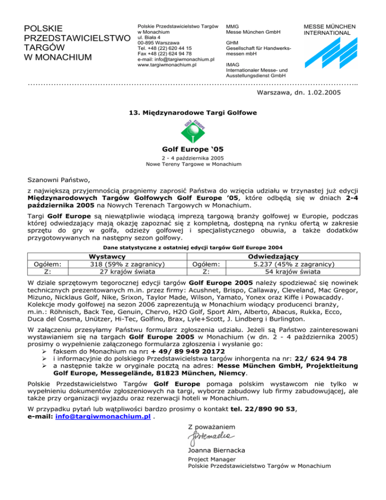 POLSKIE PRZEDSTAWICIELSTWO TARGÓW W MONACHIUM Polskie Przedstawicielstwo Targów w Monachium ul. Biała 4 00-895 Warszawa Tel. +48 (22) 620 44 15 Fax +48 (22) 624 94 78 e-mail: [email protected] www.targiwmonachium.pl MMG Messe München GmbH MESSE MÜNCHEN INTERNATIONAL GHM Gesellschaft für Handwerksmessen mbH IMAG Internationaler Messe- und Ausstellungsdienst GmbH ……………………………………………………………………………………………………………….. Warszawa, dn. 1.02.2005 13. Międzynarodowe Targi Golfowe Golf Europe ‘05 2 - 4 października 2005 Nowe Tereny Targowe w Monachium Szanowni Państwo, z największą przyjemnością pragniemy zaprosić Państwa do wzięcia udziału w trzynastej już edycji Międzynarodowych Targów Golfowych Golf Europe ’05, które odbędą się w dniach 2-4 października 2005 na Nowych Terenach Targowych w Monachium. Targi Golf Europe są niewątpliwie wiodącą imprezą targową branży golfowej w Europie, podczas której odwiedzający mają okazję zapoznać się z kompletną, dostępną na rynku ofertą w zakresie sprzętu do gry w golfa, odzieży golfowej i specjalistycznego obuwia, a także dodatków przygotowywanych na następny sezon golfowy. Dane statystyczne z ostatniej edycji targów Golf Europe 2004 Ogółem: Z: Wystawcy 318 (59% z zagranicy) 27 krajów świata Ogółem: Z: Odwiedzający 5.237 (45% z zagranicy) 54 krajów świata W dziale sprzętowym tegorocznej edycji targów Golf Europe 2005 należy spodziewać się nowinek technicznych prezentowanych m.in. przez firmy: Acushnet, Brispo, Callaway, Cleveland, Mac Gregor, Mizuno, Nicklaus Golf, Nike, Srixon, Taylor Made, Wilson, Yamato, Yonex oraz Kiffe i Powacaddy. Kolekcje mody golfowej na sezon 2006 zaprezentują w Monachium wiodący producenci branży, m.in.: Röhnisch, Back Tee, Genuin, Chervo, H2O Golf, Sport Alm, Alberto, Abacus, Rukka, Ecco, Duca del Cosma, Unützer, Hi-Tec, Golfino, Brax, Lyle+Scott, J. Lindberg i Burlington. W załączeniu przesyłamy Państwu formularz zgłoszenia udziału. Jeżeli są Państwo zainteresowani wystawianiem się na targach Golf Europe 2005 w Monachium (w dn. 2 - 4 października 2005) prosimy o wypełnienie załączonego formularza zgłoszenia i wysłanie go: ¾ faksem do Monachium na nr: + 49/ 89 949 20172 ¾ i informacyjnie do polskiego Przedstawicielstwa targów inhorgenta na nr: 22/ 624 94 78 ¾ a następnie także w oryginale pocztą na adres: Messe München GmbH, Projektleitung Golf Europe, Messegelände, 81823 München, Niemcy. Polskie Przedstawicielstwo Targów Golf Europe pomaga polskim wystawcom nie tylko w wypełnieniu dokumentów zgłoszeniowych na targi, wyborze zabudowy lub firmy zabudowującej, ale także przy organizacji wyjazdu oraz rezerwacji hoteli w Monachium. W przypadku pytań lub wątpliwości bardzo prosimy o kontakt tel. 22/890 90 53, e-mail: [email protected] . Z poważaniem Joanna Biernacka Project Manager Polskie Przedstawicielstwo Targów w Monachium Poniżej znajdą Państwo najważniejsze informacje oraz ofertę dotyczącą wystawiennictwa na targach Golf Europe 2005. Obszary tematyczne, w których wystawcy targów Golf Europe ’05 mogą zaprezentować swoją ofertę wyposażenie do gry w golfa: turystyka golfowa; - piłeczki - kije – torby - wózki – akcesoria moda golfowa: literatura fachowa; wydawnictwa i media branżowe; - odzież – rękawiczki – czapki - inne; obuwie golfowe; akcesoria golfowe; golf indoor/ driving ranges; CENY POWIERZCHNI WYSTAWIENNICZEJ NETTO* Ceny powierzchni wystawienniczej netto -stoisko szeregowe -stoisko narożne -stoisko czołowe** -stoisko blokowe (wyspowe)** w przypadku wynajmu powierzchni 16-69 m2 115 EUR/m2 (stoisko z jednej strony otwarte) 118 EUR/m2 (stoisko z dwóch stron otwarte) 120 EUR/m2 (stoisko z trzech stron otwarte) 120 EUR/m2 (stoisko z czterech stron otwarte) *Do powyższych cen należy doliczyć 16 % VAT (VAT obowiązujący na terenie Niemiec). Powyższe ceny nie obejmują kosztów zabudowy stoiska, a jedynie samą powierzchnię wystawienniczą. ** Stoiska czołowe i wyspowe możliwe są jedynie w przypadku wynajmu większych powierzchni wystawienniczych, powyżej 70 m2. Ceny powierzchni wystawienniczej netto -stoisko szeregowe -stoisko narożne -stoisko czołowe** -stoisko blokowe (wyspowe)** w przypadku wynajmu powierzchni powyżej 70 m2 115 EUR/m2 (stoisko z jednej strony otwarte) 115 EUR/m2 (stoisko z dwóch stron otwarte) 115 EUR/m2 (stoisko z trzech stron otwarte) 115 EUR/m2 (stoisko z czterech stron otwarte) *Do powyższych cen należy doliczyć 16 % VAT (VAT obowiązujący na terenie Niemiec). Powyższe ceny nie obejmują kosztów zabudowy stoiska, a jedynie samą powierzchnię wystawienniczą. ** Stoiska czołowe i wyspowe możliwe są jedynie w przypadku wynajmu większych powierzchni wystawienniczych, powyżej 70 m2. Uwaga: Minimalna powierzchnia stoiska wymagana przez organizatora : 16 m2 Oficjalny termin nadsyłania zgłoszeń do Monachium upływa dn. 15 marca 2005. Organizator targów deklaruje, że zgłoszenia będą przyjmowane aż do wyczerpania wolnej powierzchni. DODATKOWE KOSZTY – USŁUGI OBOWIĄZKOWE DLA KAŻDEGO WYSTAWCY ¾ opłata zgłoszeniowa w wysokości 110 EUR netto od każdego wystawcy lub podwystawcy, opłata zgłoszeniowa obejmuje obowiązkowy wpis podstawowy do katalogu wystawców: wpis w indeksie alfabetycznym wystawców (nazwa firmy, adres, telefon, fax, e-mail + www, b/c logo firmy lub marki, nr stoiska i hali) oraz w indeksie produktów i marek + wpis do internetowego katalogu wystawców na stronie www.golf-europe.com + wpis do elektronicznego systemu informacji dla odwiedzających na targach ryczałt za podłączenie elektryczności oraz zużycie prądu lub inne usługi zamawiane u organizatora 15 EUR netto /m2 ¾ (ryczałt płatny przed targami wraz z należnością za powierzchnię wystawienniczą) ¾ PRZY obowiązkowa opłata na rzecz Niemieckiego Zrzeszenia Przemysłu Targowego (A