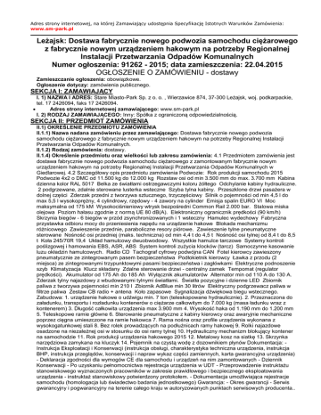 Adres strony internetowej, na której Zamawiający udostępnia Specyfikację Istotnych Warunków Zamówienia: www.sm-park.pl Leżajsk: Dostawa fabrycznie nowego podwozia samochodu ciężarowego z fabrycznie nowym urządzeniem hakowym na potrzeby Regionalnej Instalacji Przetwarzania Odpadów Komunalnych Numer ogłoszenia: 91262 - 2015; data zamieszczenia: 22.04.2015 OGŁOSZENIE O ZAMÓWIENIU - dostawy Zamieszczanie ogłoszenia: obowiązkowe. Ogłoszenie dotyczy: zamówienia publicznego. SEKCJA I: ZAMAWIAJĄCY I. 1) NAZWA I ADRES: Stare Miasto-Park Sp. z o. o. , Wierzawice 874, 37-300 Leżajsk, woj. podkarpackie, tel. 17 2426094, faks 17 2426094. Adres strony internetowej zamawiającego: www.sm-park.pl I. 2) RODZAJ ZAMAWIAJĄCEGO: Inny: Spółka z ograniczoną odpowiedzialnością. SEKCJA II: PRZEDMIOT ZAMÓWIENIA II.1) OKREŚLENIE PRZEDMIOTU ZAMÓWIENIA II.1.1) Nazwa nadana zamówieniu przez zamawiającego: Dostawa fabrycznie nowego podwozia samochodu ciężarowego z fabrycznie nowym urządzeniem hakowym na potrzeby Regionalnej Instalacji Przetwarzania Odpadów Komunalnych. II.1.2) Rodzaj zamówienia: dostawy. II.1.4) Określenie przedmiotu oraz wielkości lub zakresu zamówienia: 4.1 Przedmiotem zamówienia jest dostawa fabrycznie nowego podwozia samochodu ciężarowego z zamontowanym fabrycznie nowym urządzeniem hakowym na potrzeby Regionalnej Instalacji Przetwarzania Odpadów Komunalnych w Giedlarowej. 4.2 Szczegółowy opis przedmiotu zamówienia Podwozie: Rok produkcji samochodu 2015 Podwozie 4x2 o DMC od 11.500 kg do 12.000 kg Rozstaw osi od min 3.500 mm do max. 3.700 mm Kabina dzienna kolor RAL 5017 Belka ze światłami ostrzegawczymi koloru żółtego Odchylanie kabiny hydrauliczne. 2 podgrzewane, zdalnie sterowane lusterka wsteczne Szyba tylna kabiny. Przeszklone drzwi pasażera w dolnej części Zderzak przedni z tworzywa sztucznego, trzyczęściowy Silnik o pojemności od min 4,5 l do max 5,5 l wysokoprężny, 4 cylindrowy, rzędowy - 4 zawory na cylinder Emisja spalin EURO VI Moc maksymalna od 175 kM Wysokociśnieniowy wtrysk bezpośredni Common Rail 2.000 bar. Stalowa miska olejowa Poziom hałasu zgodnie z normą UE 80 dB(A). Elektroniczny ogranicznik prędkości (90 km/h) Skrzynia biegów - 6 biegów w przód zsynchronizowanych i 1 wsteczny Hamulec wydechowy Fabryczna przystawka odbioru mocy do przeniesienia napędu na urządzenie hakowe Blokada mechanizmu różnicowego Zawieszenie przednie, paraboliczne resory piórowe. Zawieszenie tylne pneumatyczne sterowane Nośność osi przedniej (maks. techniczna) od min 4,4 t do 4,5 t Nośność osi tylnej od 8,4 t do 8,5 t Koła 245/70R 19,4 Układ hamulcowy dwuobwodowy. Wszystkie hamulce tarczowe Systemy kontroli poślizgowej i hamowania EBS, ASR, ABS System kontroli zużycia klocków (tarcz) Samoczynne kasowanie luzu okładzin hamulcowych. Radio CD Tachograf cyfrowy podwójna CAN Fotel kierowcy zawieszony pneumatycznie ze zintegrowanym pasem bezpieczeństwa Podłokietnik kierowcy Ławka z przodu (2 miejsca) ze zintegrowanymi trzypunktowymi pasami bezpieczeństwa i zagłówkami Elektryczne podnoszenie szyb Klimatyzacja Klucz składany Zdalne sterowanie drzwi - centralny zamek Tempomat (regulator prędkości). Akumulator od 175 Ah do 185 Ah Wyłącznik akumulatorów Alternator min od 110 A do 130 A. Zderzak tylny najazdowy z wbudowanymi tylnymi światłami. Światła pozycyjne i dzienne LED Zbiornik paliwa z tworzywa pojemności min 210 l Zbiornik AdBlue min 30 litrów Elektryczny podgrzewacz paliwa w filtrze paliwa Zestaw CB radio + antena Koło zapasowe Sygnalizacja dźwiękowa biegu wstecznego. Zabudowa: 1. urządzenie hakowe o udźwigu min. 7 ton (teleskopowane hydraulicznie). 2. Przeznaczona do załadunku, transportu i rozładunku kontenerów o ciężarze całkowitym do 7.000 kg (masa ładunku wraz z kontenerem) 3. Długość całkowita urządzenia max 3.900 mm 4. Wysokość haka od 1.190 mm do 1.200 mm 5. Teleskopowe ramie główne 6. Sterowanie pneumatyczne z kabiny kierowcy oraz awaryjnie mechaniczne poprzez cięgna umieszczone na ramie hakowca 7. Rama nośna oraz profile urządzenia wykonana z wysokogatunkowej stali 8. Bez rolek prowadzących na podłużnicach ramy hakowej 9. Rolki najazdowe osadzone na niezależnej osi w stosunku do osi ramy tylnej 10. Hydrauliczny mechanizm blokujący kontener na samochodzie 11. Rok produkcji urządzenia hakowego 2015 12. Metalowy kosz na siatkę 13. Skrzynka narzędziowa zamykana na kluczyk 14. Pojemnik na czystą wodę z dozownikiem płynów Dokumentacja: Instrukcja Eksploatacji i Konserwacji (instrukcja obsługi, charakterystyka techniczna urządzenia, instrukcja BHP, instrukcja przeglądów, konserwacji i napraw wykaz części zamiennych, karta gwarancyjna urządzenia) - Deklaracja zgodności dla wymogów CE dla samochodu i urządzeń na nim zamontowanych - Dziennik Konserwacji - Po uzyskaniu pełnomocnictwa rejestracja urządzenia w UDT - Przeprowadzenie instruktażu stanowiskowego wyznaczonych pracowników w zakresie prawidłowego i bezpiecznego eksploatowania urządzenia - instruktaż stanowiskowy potwierdzony protokołem. - Dokumentacja umożliwiająca rejestracje samochodu (homologacja lub świadectwo badania jednostkowego) Gwarancja: - Okres gwarancji - Serwis gwarancyjny i pogwarancyjny na terenie całego kraju w autoryzowanych punktach serwisowych producenta.. II.1.6) Wspólny Słownik Zamówień (CPV): 34.14.45.10-6. II.1.7) Czy dopuszcza się złożenie oferty częściowej: nie. II.1.8) Czy dopuszcza się złożenie oferty wariantowej: nie. II.2) CZAS TRWANIA ZAMÓWIENIA LUB TERMIN WYKONANIA: Okres w dniach: 28. SEKCJA III: INFORMACJE O CHARAKTERZE PRAWNYM, EKONOMICZNYM, FINANSOWYM I TECHNICZNYM III.1) WADIUM Informacja na temat wadium: 9.1 Przystępując do niniejszego postępowania każdy Wykonawca zobowiązany jest wnieść wadium w wysokości 5 000,00 zł (słownie: pięć tysięcy złotych 00/100 zł). 9.2 Wadium należy wnieść w jednej lub kilku następujących form