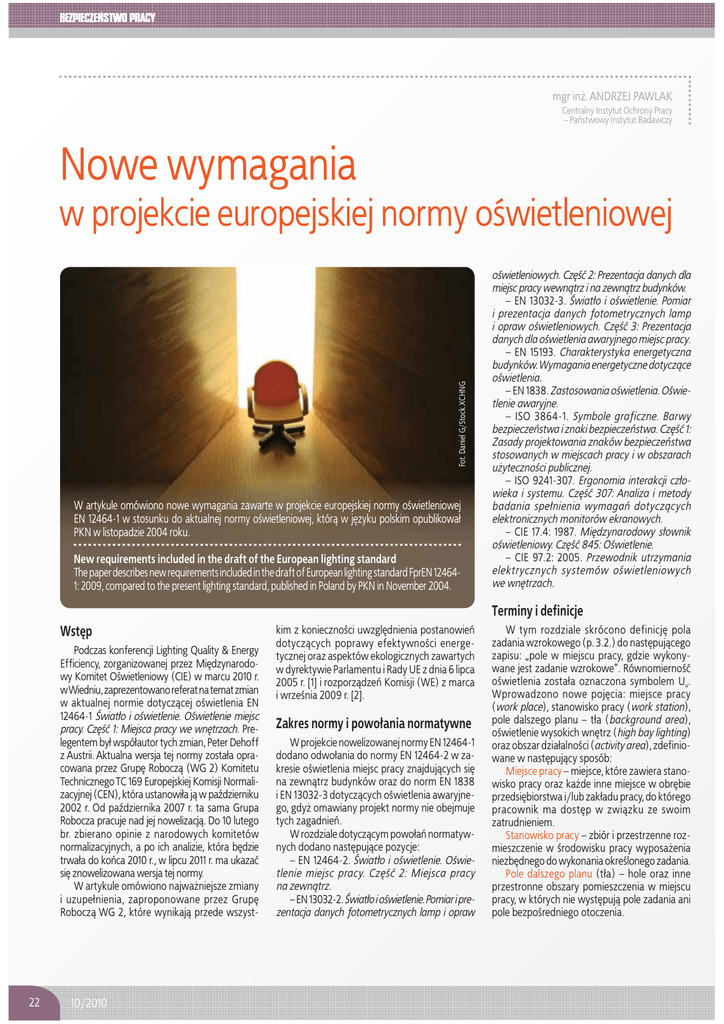 mgr in¿. ANDRZEJ PAWLAK Centralny Instytut Ochrony Pracy – Pañstwowy Instytut Badawczy Nowe wymagania Fot. Daniel G/Stock.XCHNG w projekcie europejskiej normy owietleniowej W artykule omówiono nowe wymagania zawarte w projekcie europejskiej normy owietleniowej EN 12464-1 w stosunku do aktualnej normy owietleniowej, któr¹ w jêzyku polskim opublikowa³ PKN w listopadzie 2004 roku. New requirements included in the draft of the European lighting standard The paper describes new requirements included in the draft of European lighting standard FprEN 124641: 2009, compared to the present lighting standard, published in Poland by PKN in November 2004. owietleniowych. Czêæ 2: Prezentacja danych dla miejsc pracy wewn¹trz i na zewn¹trz budynków. – EN 13032-3. wiat³o i owietlenie. Pomiar i prezentacja danych fotometrycznych lamp i opraw owietleniowych. Czêæ 3: Prezentacja danych dla owietlenia awaryjnego miejsc pracy. – EN 15193. Charakterystyka energetyczna budynków. Wymagania energetyczne dotycz¹ce owietlenia. – EN 1838. Zastosowania owietlenia. Owietlenie awaryjne. – ISO 3864-1. Symbole graficzne. Barwy bezpieczeñstwa i znaki bezpieczeñstwa. Czêæ 1: Zasady projektowania znaków bezpieczeñstwa stosowanych w miejscach pracy i w obszarach u¿ytecznoci publicznej. – ISO 9241-307. Ergonomia interakcji cz³owieka i systemu. Czêæ 307: Analiza i metody badania spe³nienia wymagañ dotycz¹cych elektronicznych monitorów ekranowych. – CIE 17.4: 1987. Miêdzynarodowy s³ownik owietleniowy. Czêæ 845: Owietlenie. – CIE 97.2: 2005. Przewodnik utrzymania elektrycznych systemów owietleniowych we wnêtrzach. Terminy i definicje Wstêp Podczas konferencji Lighting Quality & Energy Efficiency, zorganizowanej przez Miêdzynarodowy Komitet Owietleniowy (CIE) w marcu 2010 r. w Wiedniu, zaprezentowano referat na temat zmian w aktualnej normie dotycz¹cej owietlenia EN 12464-1 wiat³o i owietlenie. Owietlenie miejsc pracy. Czêæ 1: Miejsca pracy we wnêtrzach. Prelegentem by³ wspó³autor tych zmian, Peter Dehoff z Austrii. Aktualna wersja tej normy zosta³a opracowana przez Grupê Robocz¹ (WG 2) Komitetu Technicznego TC 169 Europejskiej Komisji Normalizacyjnej (CEN), która ustanowi³a j¹ w padzierniku 2002 r. Od padziernika 2007 r. ta sama Grupa Robocza pracuje nad jej nowelizacj¹. Do 10 lutego br. zbierano opinie z narodowych komitetów normalizacyjnych, a po ich analizie, która bêdzie trwa³a do koñca 2010 r., w lipcu 2011 r. ma ukazaæ siê znowelizowana wersja tej normy. W artykule omówiono najwa¿niejsze zmiany i uzupe³nienia, zaproponowane przez Grupê Robocz¹ WG 2, które wynikaj¹ przede wszyst- 22 10/2010 kim z koniecznoci uwzglêdnienia postanowieñ dotycz¹cych poprawy efektywnoci energetycznej oraz aspektów ekologicznych zawartych w dyrektywie Parlamentu i Rady UE z dnia 6 lipca 2005 r. [1] i rozporz¹dzeñ Komisji (WE) z marca i wrzenia 2009 r. [2]. Zakres normy i powo³ania normatywne W projekcie nowelizowanej normy EN 12464-1 dodano odwo³ania do normy EN 12464-2 w zakresie owietlenia miejsc pracy znajduj¹cych siê na zewn¹trz budynków oraz do norm EN 1838 i EN 13032-3 dotycz¹cych owietlenia awaryjnego, gdy¿ omawiany projekt normy nie obejmuje tych zagadnieñ. W rozdziale dotycz¹cym powo³añ normatywnych dodano nastêpuj¹ce pozycje: – EN 12464-2. wiat³o i owietlenie. Owietlenie miejsc pracy. Czêæ 2: Miejsca pracy na zewn¹trz. – EN 13032-2. wiat³o i owietlenie. Pomiar i prezentacja danych fotometrycznych lamp i opraw W tym rozdziale skrócono definicjê pola zadania wzrokowego (p. 3.2.) do nastêpuj¹cego zapisu: „pole w miejscu pracy, gdzie wykonywane jest zadanie wzrokowe”. Równomiernoæ owietlenia zosta³a oznaczona symbolem Uo. Wprowadzono nowe pojêcia: miejsce pracy (work place), stanowisko pracy (work station), pole dalszego planu – t³a (background area), owietlenie wysokich wnêtrz (high bay lighting) oraz obszar dzia³alnoci (activity area), zdefiniowane w nastêpuj¹cy sposób: Miejsce pracy – miejsce, które zawiera stanowisko pracy oraz ka¿de inne miejsce w obrêbie przedsiêbiorstwa i/lub zak³adu pracy, do którego pracownik ma dostêp w zwi¹zku ze swoim zatrudnieniem. Stanowisko pracy – zbiór i przestrzenne rozmieszczenie w rodowisku pracy wyposa¿enia niezbêdnego do wykonania okrelonego zadania. Pole dalszego planu (t³a) – hole oraz inne przestronne obszary pomieszczenia w miejscu pracy, w których nie wystêpuj¹ pole zadania ani pole bezporedniego otoczenia. Owietlenie wysokich wnêtrz (strefy wysokie) – system owietleniowy, w którym wysokoæ zamontowania opraw przekracza 6 metrów. Obszar dzia³alnoci – obszar w miejscu pracy, w którym wykonywana jest dana dzia³alnoæ. Kryteria projektowania owietlenia W rozdziale dotycz¹cym otoczenia wietlnego dodano okrelaj¹cy je nowy, ósmy parametr – zmiennoæ wiat³a (poziom i barwa wiat³a) oraz uwagê, z której wynika, ¿e oprócz owietlenia wystêpuj¹ czynniki zaliczane do ergonomicznych, wp³ywaj¹ce na wydolnoæ wzrokow¹ pracownika, takie jak: – w³aciwoci wykonywanego zadania (rozmiar, kszta³t, umiejscowienie, wspó³czynniki odbicia detalu i t³a) – zdolnoæ wzrokowa pracownika (ostroæ widzenia, zdolnoæ widzenia przestrzennego oraz rozró¿niania barw) – specjalnie udoskonalone i zaprojektowane rodowisko wietlne niepowoduj¹ce olnienia, o dobrym rozró¿nianiu barw, a tak¿e system optycznych i dotykowych wskaników o wysokim kontracie, które mog¹ wp³yn¹æ na poprawê widocznoci oraz orientacji przestrzennej. Uwzglêdnienie tych czynników mo¿e wp³yn¹æ na poprawê wydolnoci wzrokowej bez potrzeby zwiêkszania poziomu natê¿enia owietlenia. W rozdziale dotycz¹cym rozk³adu luminancji zmieniono zakresy u¿ytecznych wspó³czynników odbicia podstawowych powierzchni wnêtrza. Wartoci te wg projektu wynosz¹ dla: sufitu 0,7-0,9 (poprzednio 0,6-0,9), ciany 0,5-0,8 (poprzednio 0,3-0,8) i pod³ogi 0,2-0,4 (poprzednio 0,1-0,5)