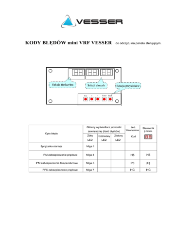 KODY BŁĘDÓW mini VRF VESSER Sekcja funkcyjna Sekcji danych do odczytu na panelu sterującym. Sekcja przycisków Główny wyświetlacz jednostki Opis błędu Sprężarka startuje zewnętrznej (ilość błysków) Żółty Czerwony Zielony LED LED LED Jed. Wewnętrzna Sterownik j.zewn. Kod Miga 1 IPM zabezpieczenie prądowe Miga 3 H5 H5 IPM zabezpieczenie temperaturowe Miga 5 P8 P8 PFC zabezpieczenie prądowe Miga 7 HC HC Kody błędów Mini VRF Opis błędu Żółty Czerwony Zielony Jed.Wewn. J.zewn. Miga 8 P8 P8 Miga 9 PL PL Zabezpieczenie wysokiego napęcia Miga 10 PH PH Zabezpieczenie niskiego ciśnienia Miga 11 E3 E3 Zabezpieczenie wysokiego ciśnienia Miga 12 E8 E8 Zabezpieczenie wyłącznika wysokiego ciśnienia Miga 13 E1 E1 Błąd kondensatora mocy Miga 14 PU PU Zabezpieczenie prądowe Miga 15 E5 E5 Miga 16 EE EE Miga 17 HE HE Miga 18 H7 H7 Miga 19 U2 U2 Błąd wykrywania fazy sprężarki Miga 20 U1 U1 Zabezpieczenie prądowe sprężarki Miga 21 L9 L9 Miga 22 H3 H3 Miga 23 E4 E4 Miga 31 F0 F0 PFC zabezpieczenie temperaturowe Zabezpieczenie niskiego napęcia Błąd karty pamięci Zabezpieczenie magnet. sprężarki Błąd synchronizacji sprężarki Brak fazy sprężarki Zabezpieczenie przeciążeniowe sprężarki Zabezpieczenie temperatury tłoczenia sprężarki Ubytek lub brak czynnika Normalna praca Miga 1 Ograniczenie częstotliwości dla zabezpieczenia prądowego Miga 2 Odzysk oleju Miga 3 F7 F7 Miga 4 H1 H1 Rozmrażanie F8 Kody błędów Mini VRF Opis błędu Ograniczenie częstotliwości dla zabezpieczenia temperaturowego IPM Ograniczenie częstotliwości dla zabezpieczenia temperaturowego PFC Ograniczenie częstotliwości dla zabezpieczenia przeciążeniowego sprężarki Ograniczenie częstotliwości dla zabezpieczenia temp. tłoczenia sprężarki Ograniczenie częstotliwości dla zabezpieczenia niskiego ciśnienia Ograniczenie częstotliwości dla Żółty Czerwony Zielony Jed.Wewn. J.zewn. Miga 5 EU EU Miga 6 EU EU Miga 8 LU Miga 9 F9 Miga 10 Pn Miga 11 F6 F6 Błąd czujnika temperatury tłoczenia Miga 12 F5 F5 Błąd czujnika temperatury zewnętrznej Miga 13 F3 F3 zabezpieczenia wysokiego ciśnienia Błąd czujnika temperatury ssania Miga 15 Błąd czujnika temperatury skraplacza Miga 16 dc A7 A7 Miga 17 bC Błąd czujnika niskiego ciśnienia Miga 18 dL Błąd czujnika wysokiego ciśnienia Miga 19 e1 Zabezpieczenie silnika wentylatora Miga 20 Błąd czujnika dochładzania H6 Płyta sterująca podłączona Miga 1 Wskaźnik kontrolny podłączony Miga 2 Podłączony komputer Miga 4 Jednostka wewnętrzna 1 podłączona Miga 5 Jednostka wewnętrzna 2 podłączona Miga 6 Jednostka wewnętrzna 3 podłączona Miga 7 Jednostka wewnętrzna 4 podłączona Miga 8 Jednostka wewnętrzna 5 podłączona Miga 9 H6 Kody błędów Mini VRF Żółty Opis błędu Czerwony Zielony Jednostka wewnętrzna 6 podłączona Miga 10 Jednostka wewnętrzna 7 podłączona Miga 11 Jednostka wewnętrzna 8 podłączona Miga 12 Jednostka wewnętrzna 9 podłączona Miga 13 Jed.Wewn. J.Zewn. Zabezpieczenie przeciwzamrożeniowe j. wewn. E2 E2 Błąd czujnika temperatury wewnętrznej F1 F1 Błąd czujnika temperatury parownika F2 F2 b5 b5 b7 b7 E7 E7 Błąd czujnika temperatury cieczy dla modułu BU Błąd czujnika temperatury gazu dla modułu BU Konflikt trybów pracy Jedn.Wewn. Błąd komunikacji E6 1A A Jedn.Wewn. E6 1B B BU 1 Jedn.Wewn. E6 1C C Jedn.Wewn. D E6 1D Jedn.Wewn. E E6 1E Jedn.Wewn. E6 2A A Jedn.Wewn. B BU 2 E6 2C Jedn.Wewn. D E6 2D Jedn.Wewn. E6 2E Jedn.Wewn. A Jedn.Wewn. B Jedn.Wewn. 3 E6 2B Jedn.Wewn. C E BU E6 C Jedn.Wewn. D Indoor unit E E6 3A E6 3B E6 3C E6 3D E6 3E Kody błędów Mini VRF Żółty Opis błędu Czerwony Zielony Jed.Wewn. J.Zewn. Błąd komunikacji między główną płytą P6 a sterującą Błąd komunikacji między główną płytą CE a sterownikiem j.zewnetrznej Błąd czujnika rozprężonego gazu w jed. wewn. Fn Błąd czujnika wilgotności jed.wewn. L1 Błąd przepełnienia wodą jed. wewn. E9 Błąd ustawień przełączników systemowych Odzysk czynnika chłodniczego Sekcja funkcyjna Stan pracy urządzenia Sekcji danych Stop jednostek wewnętrznych, które ustanowiły połączenie komunikacyjne z jednostką zewnętrzną. Np. jeśli 7 jednostek uzyskało komunikację wyświetlacz pokaże “7”. ② Wyświetli adres jednostek wg połączeń kolejno np.“1b” oznacza jednostkę B wewnętrzną 1B. Wg oznaczeń nr modułu BU:1/2/3/4,Nr jednostki: A/B/C) C5 Fo Fo Sekcja przycisków Wyświetlacz Sekcji Funkcyjnej ① W tej sekcji wyświetlona zostanie ilość C5 Wyświetlacz Sekcji Danych ① Jeśli sekcja funkcyjna wyświetla nr jdnostek, sekcja danych pokaże temperaturę zewnętrzną. Np. “35” oznacza 35℃. ② Jeśli sekcja funkcyjna wyświetla adres jednostki wewnętrznej, sekcja danych pokaże wydajność jednostki wewnętrznej np. “35” oznacza 3500W. Kod trybu pracy: Kod Normal UE UP UC Tryb pracy Wyrównywanie ciśnienia Ściąganie Chłodzenie Kod Tryb pracy UH Grzanie F7 Odzysk oleju H1 Określa sprężarki. wyświetli prędkość pracy Jeśli zatrzymana “0”. Maksymalna wartość to 60 określająca pracę z pełną wydajnością. Odszranianie Jeśli w systemie wystąpi jeden błąd, wyświetlony zostanie kod tego błędu. Jeśli Nieprawidowe wystąpi kilka, zostaną one wyświetlane sekwencyjnie co 2 sek. działanie ① Jeśli błąd wystąpi w jednostce zewnętrznej nie zostanie wyświetlony ② Jeśli błąd wystąpi w jednostce wewnętrznej zostanie wyświetlony jej numer