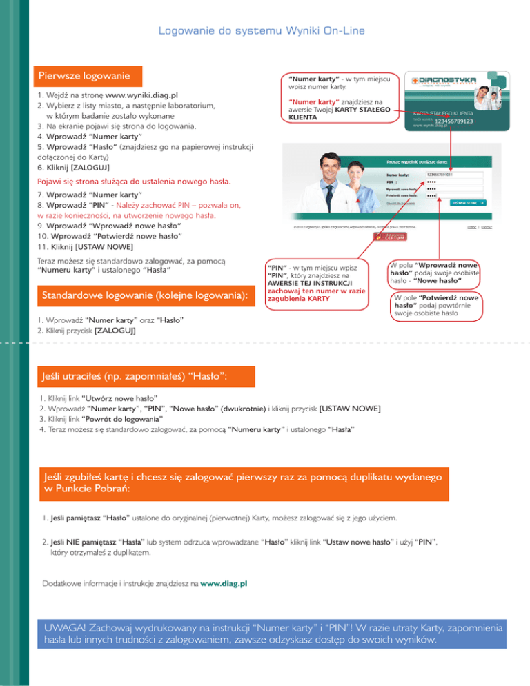 Logowanie do systemu Wyniki On-Line Pierwsze logowanie 1. Wejdź na stronę www.wyniki.diag.pl 2. Wybierz z listy miasto, a następnie laboratorium, w którym badanie zostało wykonane 3. Na ekranie pojawi się strona do logowania. 4. Wprowadź “Numer karty” 5. Wprowadź “Hasło” (znajdziesz go na papierowej instrukcji dołączonej do Karty) 6. Kliknij [Zaloguj] “Numer karty” - w tym miejscu wpisz numer karty. “Numer karty” znajdziesz na awersie Twojej KARTY STAŁEGO KLIENTA Pojawi się strona służąca do ustalenia nowego hasła. Wprowadź nowe hasło: 7. Wprowadź “Numer karty” 8. Wprowadź “PIN” - Należy zachować PIN – pozwala on, w razie konieczności, na utworzenie nowego hasła. 9. Wprowadź “Wprowadź nowe hasło” 10. Wprowadź “Potwierdź nowe hasło” 11. Kliknij [Ustaw nowe] Teraz możesz się standardowo zalogować, za pomocą “Numeru karty” i ustalonego “Hasła” Standardowe logowanie (kolejne logowania): Potwierdź nowe hasło: “PIN” - w tym miejscu wpisz “PIN”, który znajdziesz na AWERSIE TEJ INSTRUKCJI zachowaj ten numer w razie zagubienia karty 1. Wprowadź “Numer karty” oraz “Hasło” 2. Kliknij przycisk [Zaloguj] W polu “Wprowadź nowe hasło” podaj swoje osobiste hasło - “Nowe hasło” W pole “Potwierdź nowe hasło” podaj powtórnie swoje osobiste hasło Jeśli utraciłeś (np. zapomniałeś) “Hasło”: 1. Kliknij link “Utwórz nowe hasło” 2. Wprowadź “Numer karty”, “PIN”, “Nowe hasło” (dwukrotnie) i kliknij przycisk [USTAW NOWE] 3. Kliknij link “Powrót do logowania” 4. Teraz możesz się standardowo zalogować, za pomocą “Numeru karty” i ustalonego “Hasła” Jeśli zgubiłeś kartę i chcesz się zalogować pierwszy raz za pomocą duplikatu wydanego w Punkcie Pobrań: 1. Jeśli pamiętasz “Hasło” ustalone do oryginalnej (pierwotnej) Karty, możesz zalogować się z jego użyciem. 2. Jeśli NIE pamiętasz “Hasła” lub system odrzuca wprowadzane “Hasło” kliknij link “Ustaw nowe hasło” i użyj “PIN”, który otrzymałeś z duplikatem. Dodatkowe informacje i instrukcje znajdziesz na www.diag.pl UWAGA! Zachowaj wydrukowany na instrukcji “Numer karty” i “PIN”! W razie utraty Karty, zapomnienia hasła lub innych trudności z zalogowaniem, zawsze odzyskasz dostęp do swoich wyników.