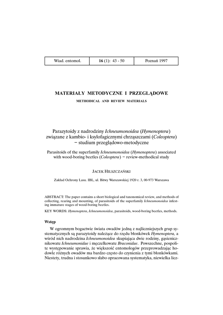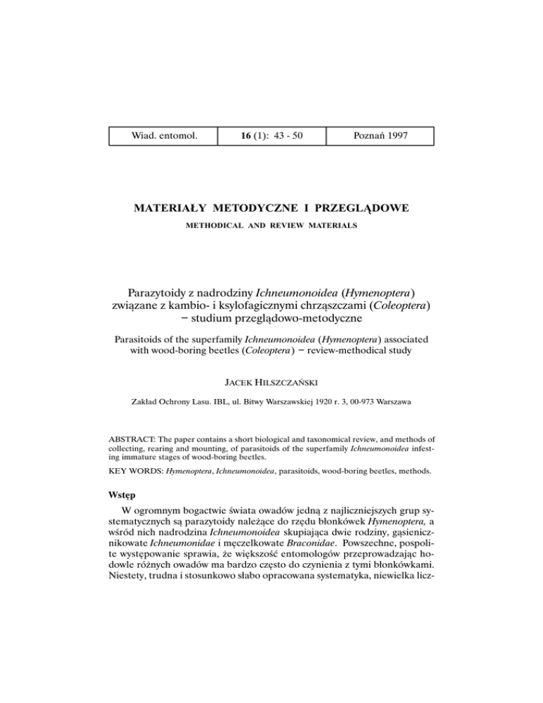Wiad. entomol. 16 (1): 43 - 50 Poznań 1997 MATERIA£Y METODYCZNE I PRZEGL¥DOWE METHODICAL AND REVIEW MATERIALS Parazytoidy z nadrodziny Ichneumonoidea (Hymenoptera) związane z kambio- i ksylofagicznymi chrząszczami (Coleoptera) - studium przeglądowo-metodyczne Parasitoids of the superfamily Ichneumonoidea (Hymenoptera) associated with wood-boring beetles (Coleoptera) - review-methodical study JACEK HILSZCZAŃSKI Zakład Ochrony Lasu. IBL, ul. Bitwy Warszawskiej 1920 r. 3, 00-973 Warszawa ABSTRACT: The paper contains a short biological and taxonomical review, and methods of collecting, rearing and mounting, of parasitoids of the superfamily Ichneumonoidea infesting immature stages of wood-boring beetles. KEY WORDS: Hymenoptera, Ichneumonoidea, parasitoids, wood-boring beetles, methods. Wstęp W ogromnym bogactwie świata owadów jedną z najliczniejszych grup systematycznych są parazytoidy należące do rzędu błonkówek Hymenoptera, a wśród nich nadrodzina Ichneumonoidea skupiająca dwie rodziny, gąsienicznikowate Ichneumonidae i męczelkowate Braconidae. Powszechne, pospolite występowanie sprawia, że większość entomologów przeprowadzając hodowle różnych owadów ma bardzo często do czynienia z tymi błonkówkami. Niestety, trudna i stosunkowo słabo opracowana systematyka, niewielka licz- 44 J. HILSZCZAŃSKI ba specjalistów oraz brak polskojęzycznych kluczy do oznaczania tej grupy owadów zniechęcają wielu entomologów. Z drugiej strony nieumiejętne postępowanie z odłowionymi lub wyhodowanymi okazami sprawia, że wiele niejednokrotnie cennych materiałów zostaje zmarnowanych. Niniejsza praca ma na celu przybliżenie biologii, metod hodowli, zbioru i preparowania jednej z grup troficznych wchodzących w skład Ichneumonoidea - parazytoidów związanych z chrząszczami rozwijającymi się w drewnie. Zarys biologii Błonkówki należące do grupy Hymenoptera Apocrita swój rozwój larwalny odbywają żerując na przedimaginalnych, rzadziej imaginalnych stadiach innych owadów rzadziej pajęczaków. Zasiedlone przez larwy wielu gatunków chrząszczy pnie i gałęzie drzew oraz krzewów stanowią jedną z nisz ekologicznych penetrowanych przez wyspecjalizowaną grupę parazytoidów. Samice tych gatunków porażają przebywające w żerowiskach larwy, rzadziej przedpoczwarki i poczwarki, a wyjątkowo imagines chrząszczy należących do takich rodzin jak Cerambycidae, Buprestidae, Scolytidae, Anobiidae, Curculionidae, Melandryidae i Elateridae. Proces wyszukiwania i porażania ukrytego pod korą lub w drewnie żywiciela jest dosyć skomplikowany, w tym celu parazytoidy wykształciły wiele interesujących przystosowań. Znaczna grupa gatunków, szczególnie gąsienicznikowatych, stosuje metodę wyszukiwania ofiar, przypominającą zasadę działania sonaru. Polega ona na przekazywaniu do podłoża za pomocą czułków drgań wytwarzanych w ciele samicy. Odbierane następnie sygnały dźwiękowe umożliwiają wykrycie ukrytej larwy (HENAUT, 1990). Inną prostszą metodą jest odbieranie za pomocą czułków dźwięków (drgań) wytwarzanych przez żerującą larwę. Jak wynika z badań R ICHERSON'a i BORDEN'a (1972) jedną ze wskazówek pozwalającą odnależć żywiciela może być także promieniowenie podczerwone powstające w wyniku metabolizmu ofiary. U części gatunków podstawowe znaczenie przy wyszukiwaniu ofiar odgrywają bodźce zapachowe (H ILSZCZAŃSKI, 1994). Do porażenia ofiary, czyli złożenia jaja, służy tzw. pokładełko. Samice parazytoidów wbijają lub przeciskają pokładełko przez warstwę kory lub drewna dzielącą je od miejsca przebywania żywiciela. Inną metodę w dotarciu do żywiciela obrały samice gatunku Histeromerus mystacinus WESM., które przegryzają się przez chodniki larwalne głównie dużych zmorszników, docierając bezpośrednio do celu. Potrzeba scharakteryzowania powiązań pomiędzy parazytoidem a żywicielem zaowocowała licznymi klasyfikacjami, z których najprostsza do zastosowania, a jednocześnie użyteczna, dzieli parazytoidy na koinobionty i idiobionty (ASKEW , SHAW , 1986). Podstawowym zastosowanym w tym podziale ICHNEUMONOIDEA ZWIĄZANE Z KAMBIO- I KSYLOFAGICZNYMI CHRZĄSZCZAMI 45 kryterium jest informacja czy porażony przez samicę parazytoida żywiciel kontynuuje rozwój, co zachodzi w przypadku koinobiontów, czy też zabity lub całkowicie sparaliżowany za pomocą wstrzykniętego jadu stanowi nieruchome źródło pokarmu, jak ma to miejsce u idiobiontów. W następstwie obranych strategii rozwoju, koinobionty głównie z uwagi na bezpieczeństwo potomstwa żyjącego kosztem aktywnych larw chrząszczy, należą do endoparazytoidów. Ich rozwój jest stosunkowo powolny, a zasoby przyszłego pokarmu, czyli wielkość porażanej ofiary nie mają dla nich dużego znaczenia, gdyż rośnie ona wraz z larwą najeźdźcy. Idiobionty natomiast należą do ektoparazytoidów, a ich larwy odbywają stosunkowo szybki rozwój na nieruchomym, nierozwijającym się żywicielu. Bardzo ważną sprawą jest w ich przypadku wybór odpowiednio dużego żywiciela, zapewniającego pełny rozwój potomstwa. Z fizjologicznego punktu widzenia życie wewnątrz ciała żywiciela wymaga przezwyciężenia jego specyficznego systemu obrony jaką jest układ immunologczny, co spowodowało bardzo wąską specjalizację koinobiontów. Liczba potencjalnych żywicieli ograniczona jest u nich zazwyczaj do jednego lub kilku spokrewnionych gatunków. W przypadku idiobiontów, bardziej pierwotnych w sensie filogenetycznym, spektrum żywicieli „zjadanych” od zewnątrz jest często bardzo szerokie i może zawierać do kilkudziesięciu gatunków owadów należących nierzadko do różnych rodzin i rzędów. Większość gatunków porażających kambio- i ksylofagiczne chrząszcze to parazytoidy indywidualne, rozwijające się na żywicielu pojedynczo. Grupowy rozwój spotykany jest rzadziej, głównie u Braconidae i wynika ze składania prz