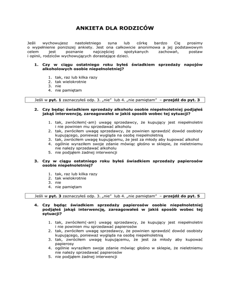 ANKIETA DLA RODZICÓW Jeśli wychowujesz nastoletniego syna lub córkę bardzo Cię prosimy o wypełnienie poniŜszej ankiety. Jest ona całkowicie anonimowa a jej podstawowym celem jest poznanie najczęściej spotykanych zachowań, postaw i opinii, rodziców wychowujących dorastające dzieci. 1. Czy w ciągu ostatniego roku byłeś świadkiem sprzedaŜy napojów alkoholowych osobie niepełnoletniej? 1. 2. 3. 4. tak, raz lub kilka razy tak wielokrotnie nie nie pamiętam Jeśli w pyt. 1 zaznaczyłeś odp. 3. „nie” lub 4. „nie pamiętam” – przejdź do pyt. 3 2. Czy będąc świadkiem sprzedaŜy alkoholu osobie niepełnoletniej podjąłeś jakąś interwencję, zareagowałeś w jakiś sposób wobec tej sytuacji? 1. tak, zwróciłem(-am) uwagę sprzedawcy, Ŝe kupujący jest niepełnoletni i nie powinien mu sprzedawać alkoholu 2. tak, zwróciłem uwagę sprzedawcy, Ŝe powinien sprawdzić dowód osobisty kupującego, poniewaŜ wygląda na osobę niepełnoletnią 3. tak, zwróciłem uwagę kupującemu, Ŝe jest za młody aby kupować alkohol 4. ogólnie wyraziłem swoje zdanie mówiąc głośno w sklepie, Ŝe nieletniemu nie naleŜy sprzedawać alkoholu 5. nie podjąłem Ŝadnej interwencji 3. Czy w ciągu ostatniego roku byłeś świadkiem sprzedaŜy papierosów osobie niepełnoletniej? 1. 2. 3. 4. tak, raz lub kilka razy tak wielokrotnie nie nie pamiętam Jeśli w pyt. 3 zaznaczyłeś odp. 3. „nie” lub 4. „nie pamiętam” – przejdź do pyt. 5 4. Czy będąc świadkiem sprzedaŜy papierosów osobie niepełnoletniej podjąłeś jakąś interwencję, zareagowałeś w jakiś sposób wobec tej sytuacji? 1. tak, zwróciłem(-am) uwagę sprzedawcy, Ŝe kupujący jest niepełnoletni i nie powinien mu sprzedawać papierosów 2. tak, zwróciłem uwagę sprzedawcy, Ŝe powinien sprawdzić dowód osobisty kupującego, poniewaŜ wygląda na osobę niepełnoletnią 3. tak, zwróciłem uwagę kupującemu, Ŝe jest za młody aby kupować papierosy 4. ogólnie wyraziłem swoje zdanie mówiąc głośno w sklepie, Ŝe nieletniemu nie naleŜy sprzedawać papierosów 5. nie podjąłem Ŝadnej interwencji 5. Czy w ciągu ostatniego roku zdarzyło się Twój syn/córka wrócił do domu pod wpływem alkoholu? 1. 2. 3. 4. tak, jeden lub dwa razy tak, 3 - 5 razy tak, 6 i więcej razy nie nigdy Jeśli w pyt. 5 zaznaczyłeś odp. 4. „nie nigdy” – przejdź do pyt. 7 6. Jak zareagowałeś (-aś) na ostatni powrót syna/córki do domu pod wpływem alkoholu ? 1. udawałem, Ŝe tego nie zauwaŜyłem i nic nie zrobiłem (-am) 2. kazałem mu/jej natychmiast połoŜyć się spać a następnego dnia powiedziałem, Ŝe czuję się rozczarowany i bardzo zawiedziony 3. solidnie mu/jej nagadałem i zabroniłem przez jakiś czas wychodzenia z domu i/lub oglądania telewizji 4. uderzyłem go/ją i wyzwałem(-am) od najgorszych 5. wyrzuciłem go/ją z domu i kazałem wrócić kiedy wytrzeźwieje 6. przez kilka dni/tygodni w ogóle się do niego/niej nie odzywałem (-am) 7. inne – opisz krótko swoje zachowanie w takiej sytuacji …………………………………………………………………………………………………………………………. ………………………………………………………………………………………………………………………… 7. Czy kiedykolwiek w Ŝyciu odbyłeś z synem/córką powaŜną rozmowę, podczas której ustaliliście jasne zasady i konsekwencje związane z piciem alkoholu ? 1. tak 2. nie 3. nie pamiętam 8. Czy w związku z piciem alkoholu przez Twojego syna/córkę zrobiłeś lub powiedziałeś mu/jej coś takiego, czego teraz Ŝałujesz? 1. 2. 3. 4. 5. zdecydowanie tak raczej tak raczej nie zdecydowanie nie trudno powiedzieć 9. Czy słyszałeć(-aś) coś na temat szkolnego programu profilaktyki, jego podstawowych celów i załoŜeń? 1. 2. 3. 4. 5. nie, nic nie słyszałem (-am) kilka ogólników ale nic konkretnego tak, rozmawialiśmy o tym z moim dzieckiem tak, rozmawialiśmy o tym z nauczycielem tak, słyszałem z innych źródeł 10. Czy szkoła, w której uczy się Twoje dziecko podjęła jakąś współpracę z rodzicami w zakresie problemów związanych z piciem alkoholu lub paleniem papierosów ? 1. tak 2. nie 3. nie wiem Jeśli w pyt. 10 zaznaczyłeś odp. 2. „nie” lub 3. „nie wiem” – przejdź do pyt. 12 11. Na czym polega ta współpraca szkoły z rodzicami w zakresie profilaktyki problemów alkoholowych i tytoniowych ? 1. podejmowaniu badań pozwalających oszacować rzeczywiste rozmiary wspomnianych powyŜej problemów i dzieleniu się z rodzicami ich wynikami 2. organizowaniu i prowadzenie debat z rodzicami na temat skali zjawiska i metod radzenia sobie z trudnymi i ryzykownymi zachowaniami naszych dzieci 3. wprowadzeniu – po uzgodnieniu tego z rodzicami – systemu kontraktów szkolnych dla uczniów naruszających zasady obowiązujące w tym zakresie w szkole 4. wprowadzeniu – po uzgodnieniu tego z rodzicami – cyklicznych badań wśród losowo wybranych uczniów w szkole dotyczących stanu trzeźwości oraz testów wykrywających obecność narkotyków w organizmie 5. organizowaniu spotkań dla rodziców ze specjalistami ds. uzaleŜnień 12. Czy pozwalasz swojemu dorastającemu synowi / córce na wypicie niewielkich ilości alkoholu ? 1. 2. 3. 4. nie, nigdy tak ale tylko podczas szczególnych uroczystości (świąt rodzinnych) tak, bez szczególnych okazji ale tylko w domu w obecności rodziców tak, podczas uzgodnionych ze mną wcześniej spotkań towarzyskich ze znajomymi 5. daję synowi / córce prawo do samodzielnego decydowania w tej kwestii mając pełne zaufanie do jego/jej postępowania _______________________________________________________________________ METRYCZKA 1. Płeć 2. Kim jesteś? 1. kobieta 2. męŜczyzna 3.Twoje wykształcenie 1. 2. 3. 4. podstawowe zawodowe średnie wyŜsze 1. ojcem 2. matką 3. przysposobionym rodzicem 4. Ile lat ma Twoje dziecko? …………