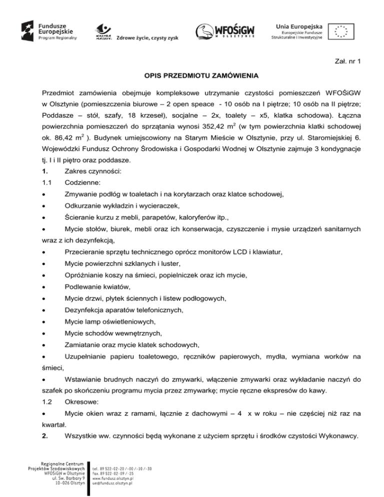 Zał. nr 1 OPIS PRZEDMIOTU ZAMÓWIENIA Przedmiot zamówienia obejmuje kompleksowe utrzymanie czystości pomieszczeń WFOŚiGW w Olsztynie (pomieszczenia biurowe – 2 open speace - 10 osób na I piętrze; 10 osób na II piętrze; Poddasze – stół, szafy, 18 krzeseł), socjalne – 2x, toalety – x5, klatka schodowa). Łączna powierzchnia pomieszczeń do sprzątania wynosi 352,42 m2 (w tym powierzchnia klatki schodowej ok. 86,42 m2 ). Budynek umiejscowiony na Starym Mieście w Olsztynie, przy ul. Staromiejskiej 6. Wojewódzki Fundusz Ochrony Środowiska i Gospodarki Wodnej w Olsztynie zajmuje 3 kondygnacje tj. I i II piętro oraz poddasze. 1. Zakres czynności: 1.1 Codzienne: Zmywanie podłóg w toaletach i na korytarzach oraz klatce schodowej, Odkurzanie wykładzin i wycieraczek, Ścieranie kurzu z mebli, parapetów, kaloryferów itp., Mycie stołów, biurek, mebli oraz ich konserwacja, czyszczenie i mysie urządzeń sanitarnych wraz z ich dezynfekcją, Przecieranie sprzętu technicznego oprócz monitorów LCD i klawiatur, Mycie powierzchni szklanych i luster, Opróżnianie koszy na śmieci, popielniczek oraz ich mycie, Podlewanie kwiatów, Mycie drzwi, płytek ściennych i listew podłogowych, Dezynfekcja aparatów telefonicznych, Mycie lamp oświetleniowych, Mycie schodów wewnętrznych, Zamiatanie oraz mycie klatek schodowych, Uzupełnianie papieru toaletowego, ręczników papierowych, mydła, wymiana worków na śmieci, Wstawianie brudnych naczyń do zmywarki, włączenie zmywarki oraz wykładanie naczyń do szafek po skończeniu programu mycia przez zmywarkę; mycie ręczne ekspresów do kawy. 1.2 Okresowe: Mycie okien wraz z ramami, łącznie z dachowymi – 4 x w roku – nie częściej niż raz na kwartał. 2. Wszystkie ww. czynności będą wykonane z użyciem sprzętu i środków czystości Wykonawcy. Wykonawca stosować będzie środki czystości o bezspornej dobrej jakości, dopuszczone do użytkowania i obrotu na rynku polskim, zgodnie z aktualnie obowiązującymi przepisami, właściwe do zainstalowanych pojemników i dozowników. Wskazane środki mają być odpowiednie do poszczególnych powierzchni, gwarantujące bezpieczeństwo (antypoślizgowe, niepodrażniające skóry, oczu, dróg oddechowych), o jakości zapewniającej wymagany poziom sprzątanych obiektów. Wszystkie dostarczane środki oraz artykuły wykorzystywane do realizacji usługi muszą 3. posiadać karty charakterystyki, które mają być dostarczone Zamawiającemu na jego żądanie. Artykuły wykorzystywane do realizacji zamówienia muszą spełniać następujące min. kryteria: a) Papier toaletowy – minimum 2 –warstwowy, wykonany w 100% z celulozy, biały, gofrowany, dzielony, miękki, w rolkach o średnicy 19 cm; b) Mydło do mycia rąk kompatybilne z urządzeniem Mini MERIDA TOP o poj. 400 ml., ABS, okienko niebieskie – z dodatkiem lanoliny/kolagenu o właściwościach nawilżających i pielęgnujących oraz przyjemnym zapachu, pH w zakresie od 7 do 9; c) Ręczniki papierowe – minimum 2-warstwowe, wykonane w 100% z celulozy, o niskim stopniu pylności, białe, miękkie, składane w z-z; d) Płyn do mycia naczyń – zawierający substancje usuwające tłuszcz i wszelkiego rodzaju inne silne zabrudzenia, niepodrażniający skóry rąk, o przyjemnym zapachu; e) Tabletki, sól oraz płyn do zmywarek gastronomicznych – tabletki o właściwościach minimum: Skuteczna czyszczenie, funkcja namaczania, usuwanie plam z herbaty, funkcja nabłyszczająca, ochrona przed osadami z kamienia, usuwanie tłuszczu; Płyn – funkcja nabłyszczająca i płukanie, z zawartością kwasku cytrynowego. f) Gąbki do zmywania naczyń – o wymiarach nie mniejszych niż 85x55x25 mm posiadające szorstką powłokę do czyszczenia trwałych zabrudzeń; g) Płyn do zmywania powierzchni trwałych – o właściwościach myjących, o przyjemnym zapachu. h) Odświeżacze do toalet oraz kostki, zawieszki do toalet – zawieszki, kostki zapachowe o min. 40g, higieniczna czystość i świeżość; odświeżacze pochłaniające zapachy. 4. Wykonawca ponosi pełną odpowiedzialność za pracowników i przestrzeganie przez nich warunków bhp, ppoż. 5. Wykonawca ponosi odpowiedzialność za szkody powstałe w związku z realizacją zamówienia oraz innych działań osób zatrudnionych przez Wykonawcę, w tym za uszkodzenie lub zniszczenie wszelkiej własności publicznej lub prywatnej pomieszczeniach objętych usługą sprzątania. Wykonawca zapewni odpowiednią ilość osób z odpowiednimi kwalifikacjami i uprawnieniami (np. wysokościowe do mycia okien dachowych – jeśli dotyczy) do codziennego wykonania usługi w godzinach: Poniedziałek – od 16.00 – 19.30; Wtorek – piątek – od 15.30 – 19.00. Szczegółowych informacji w zakresie realizacji zamówienia udziela: Pani Katarzyna Taźbierska – [email protected]