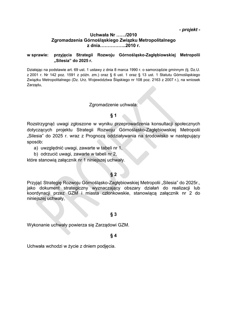 Uchwała Nr ……/2010 Zgromadzenia Górnośląskiego Związku Metropolitalnego z dnia……………..2010 r. w sprawie: przyjęcia Strategii „Silesia” do 2025 r. Rozwoju Górnośląsko-Zagłębiowskiej - projekt - Metropolii Działając na podstawie art. 69 ust. 1 ustawy z dnia 8 marca 1990 r. o samorządzie gminnym (tj. Dz.U. z 2001 r. Nr 142 poz. 1591 z późn. zm.) oraz § 6 ust. 1 oraz § 13 ust. 1 Statutu Górnośląskiego Związku Metropolitalnego (Dz. Urz. Województwa Śląskiego nr 108 poz. 2163 z 2007 r.), na wniosek Zarządu, Zgromadzenie uchwala: §1 Rozstrzygnąć uwagi zgłoszone w wyniku przeprowadzenia konsultacji społecznych dotyczących projektu Strategii Rozwoju Górnośląsko-Zagłębiowskiej Metropolii „Silesia” do 2025 r. wraz z Prognozą oddziaływania na środowisko w następujący sposób: a) uwzględnić uwagi, zawarte w tabeli nr 1, b) odrzucić uwagi, zawarte w tabeli nr 2, które stanowią załącznik nr 1 niniejszej uchwały. §2 Przyjąć Strategię Rozwoju Górnośląsko-Zagłębiowskiej Metropolii „Silesia” do 2025r., jako dokument strategiczny wyznaczający obszary działań do realizacji lub koordynacji przez GZM i miasta członkowskie, stanowiącą załącznik nr 2 do niniejszej uchwały, §3 Wykonanie uchwały powierza się Zarządowi GZM. §4 Uchwała wchodzi w życie z dniem podjęcia. UZASADNIENIE (Uchwała Nr ……/2010) Podjęcie niniejszej uchwały stanowi realizację uchwały nr 20/2008 Zgromadzenia GZM z dnia 24.06.2008 w sprawie przystąpienia do opracowania Strategii Rozwoju Metropolii Górnośląskiej na lata 2009 – 2025 (w kolejnych uchwałach istnieją rozbieżności w nazewnictwie określającym Metropolię, gdyż zostało ono formalnie zmienione w trakcie opracowywania dokumentu). Kończy ona dwuletni okres prac nad pierwszym dokumentem strategicznym obejmującym obszar 14 miast Metropolii „Silesia”. Podstawowym celem dokumentu jest wspieranie procesu kreowania obszaru metropolitalnego konkurencyjnego w skali krajowej i międzynarodowej oraz sukcesywna poprawa warunków życia jego mieszkańców. Przyjęte ustalenia strategiczne uwzględniają problematykę określoną w uchwale nr 22/2008 Zgromadzenia GZM z dnia 30.09.2008 r. w sprawie obszarów strategicznych dla rozwoju Metropolii Górnośląskiej. Przebieg prac nad przedmiotowym dokumentem realizowany był zgodnie z harmonogramem ostatecznie przyjętym uchwałą nr 32/2009 Zgromadzenia GZM z dnia 19.01.2009 r. Zgodnie z wymogiem ustawy z dnia 3 października 2008 r. o udostępnianiu informacji o środowisku i jego ochronie, udziale społeczeństwa w ochronie środowiska oraz o ocenach oddziaływania na środowisko (Dz. U. Nr 199, poz. 1227): − uzyskano opinie organów właściwych w sprawach opiniowania w ramach strategicznej oceny oddziaływania na środowisko tj. Regionalnej Dyrekcji Ochrony Środowiska w Katowicach i Państwowego Wojewódzkiego Inspektora Sanitarnego w Katowicach, − przeprowadzono konsultacje społeczne. Uwagi złożone w trakcie procesu opiniowania i konsultacji zostały wstępnie rozstrzygnięte przez Zarząd i przedłożone w niniejszym projekcie uchwały do rozpatrzenia przez Zgromadzenie. Uwagi rekomendowane przez Zarząd uwzględniono w treści przedmiotowego dokumentu. Tym samym projekt Strategii Rozwoju Górnośląsko-Zagłębiowskiej Metropolii „Silesia” do 2025 r. wraz z: − Raportem o stanie Górnośląsko-Zagłębiowskiej Metropolii „Silesia” (stan na styczeń 2009 r.), − Prognozą oddziaływania na środowisko Strategii Rozwoju GórnośląskoZagłębiowskiej Metropolii „Silesia”, − Sprawozdaniem pt. Konsultacje społeczne do Strategii Rozwoju GórnośląskoZagłębiowskiej Metropolii „Silesia” i Prognozy oddziaływania na środowisko, mógł zostać przedłożony Zgromadzeniu do uchwalenia. Załącznik nr 1 do uchwały Zgromadzenia Górnośląskiego Związku Metropolitalnego nr …………. z dnia …………………. Tabela 1 Uwagi do akceptacji zgłoszone w procesie konsultacji społecznych projektu Strategii Rozwoju GórnośląskoZagłębiowskiej Metropolii „Silesia” do 2025 r. – zwanej dalej projektem Strategii Rozwoju Lp. Treść uwagi Rozstrzygnięcie Sposób rozstrzygnięcia Uzupełnić wskaźniki, które pozwalałyby monitorować rozwój społeczeństwa obywatelskiego (np.: wzrost poziomu zaufania, liczba NGOs, liczba usług zlecanych przez samorządy NGOsom organizacjom pozarządowym); Zweryfikować i uzupełnić w stosownym zakresie ustalenia z opracowanej już Strategii społecznej dla województwa śląskiego; Prowadzić badania społeczne pozwalające na rozpoznanie potrzeb i nastrojów opinii mieszkańców w zakresie życia w Metropolii „Silesia”; zagadnienie już ujęte projekcie Treść uwagi mieści się w przyjętym działaniu (D21) w ramach Priorytetu A; zagadnienie już ujęte projekcie Ustanowienie funduszu stypendialnego i mieszkaniowego, jako ekonomicznej zachęty do podnoszenia poziomu wykształcenia i zatrzymywania młodych mieszkańców w Metropolii; Stworzenie Metropolitalnego Obserwatorium Inicjatyw Społecznych, jako instrumentu długofalowego kreowania społeczeństwa obywatelskiego; zagadnienie już ujęte projekcie Treść uwagi ujęta w projekcie dokumentu, gdyż w procesie prac uwzględniono odniesienia do stosownych dokumentów regionalnych; Treść uwagi mieści się już w przyjętym kierunku działań w projekcie dokumentu (priorytet A: zarządzanie i pozycja Metropolii „Silesia” „Cykliczne badania opinii mieszkańców Metropolii w wybranym zakresie tematycznym”); Treść uwagi wpisuje się w przyjęte działanie (D5) w ramach priorytetu B; Wyraźnie wykazać korzyści, jakie będą wynikać z tego dokumentu dla mieszkańców (większa operacjonalizacja dokumentu); zagadnienie już ujęte projekcie Uwagi zgłoszone podczas spotkania w dniu 21.10.2009 r. 1. 2. 3. 4. 5. 6. zagadnienie już ujęte projekcie zagadnienie już ujęte projekcie 1 Treś