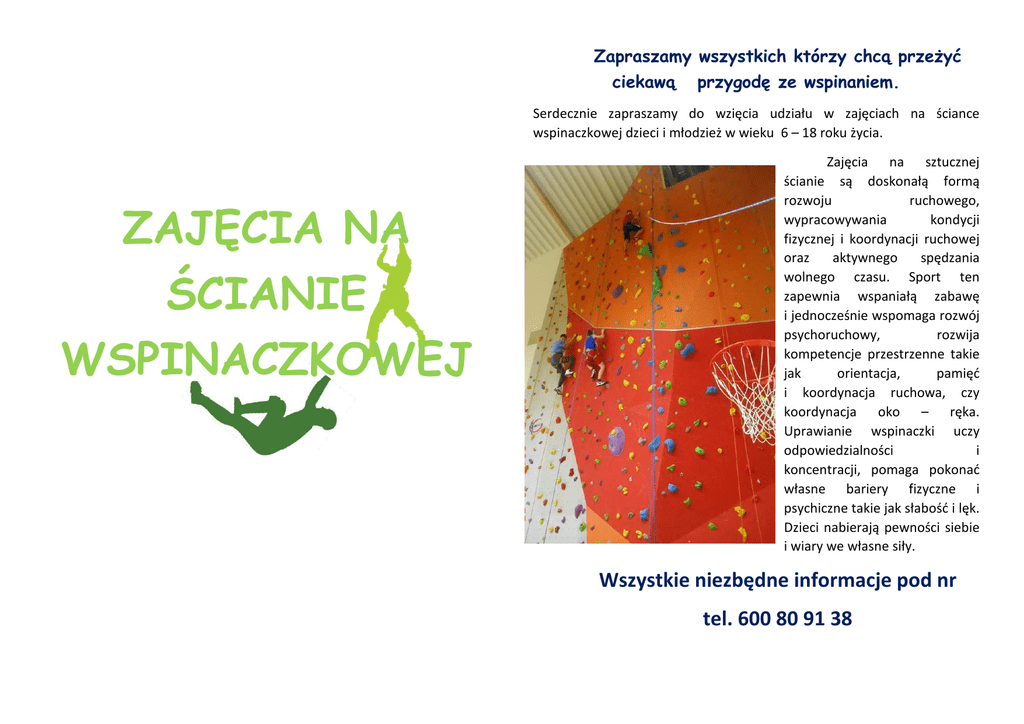 Zapraszamy wszystkich którzy chcą przeżyć ciekawą przygodę ze wspinaniem. Serdecznie zapraszamy do wzięcia udziału w zajęciach na ściance wspinaczkowej dzieci i młodzież w wieku 6 – 18 roku życia. ZAJĘCIA NA ŚCIANIE WSPINACZKOWEJ Zajęcia na sztucznej ścianie są doskonałą formą rozwoju ruchowego, wypracowywania kondycji fizycznej i koordynacji ruchowej oraz aktywnego spędzania wolnego czasu. Sport ten zapewnia wspaniałą zabawę i jednocześnie wspomaga rozwój psychoruchowy, rozwija kompetencje przestrzenne takie jak orientacja, pamięć i koordynacja ruchowa, czy koordynacja oko – ręka. Uprawianie wspinaczki uczy odpowiedzialności i koncentracji, pomaga pokonać własne bariery fizyczne i psychiczne takie jak słabość i lęk. Dzieci nabierają pewności siebie i wiary we własne siły. Wszystkie niezbędne informacje pod nr tel. 600 80 91 38