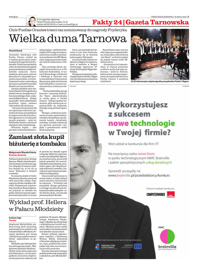 Polska Gazeta Krakowska | 19 marca 2012 | 5 www.gk.pl Dziś reporter dyżurny Paweł Chwał czeka w godz. 11-12 telefon 14 631 94 16; e-mail: [email protected] Fakty 24|Gazeta Tarnowska Chór Puellae Orantes trzeci raz nominowany do nagrody Fryderyka PawełChwał Tarnowski, dziewczęcy chór Puellae Orantes znalazł się w wąskim gronie pięciu nominowanychdotegorocznychFryderyków.Tojużtrzeciepodejście chórudotejprestiżowejnagrody przyznawanejprzezpolskieśrodowisko muzyczne. Tarnowiankiniesąbezszans,mimoże jako jedyne z całej piątki są zespołem amatorskim, a ich konkurentamiwwalceostatuetkęsą tak znane marki jak Poznańskie Słowiki czy Camerata Silesia. Uznanieczłonków1200-osobowejAkademiiFonograficznej zdobył ostatni, dwupłytowy albumtarnowskiegochóru„Łukaszewski&Bembinow. Kolędy ipastorałki”,któryzebrałbardzo pochlebne opinie zarówno od krytyków, jak i słuchaczy. – Już sama nominacja jest dla nas ogromnym sukcesem i powodemdodumy,tymbardziejże do tegorocznej edycji Fryderyków zgłoszono aż 112 albumów muzyki poważnej – mówi ks. Władysław Pachota, założyciel i dyrygent chóru katedralnego. Wcześniej krążek – jako pierwszywhistoriipolskiejmu- zykipoważnej–zdobyłtytułzłotejpłytyDVD,ajegorecenzjazamieszczona została w prestiżowymwydawnictwieBBCMusic, czym mogą się poszczycić jedynie nieliczni wykonawcy z Polski. Chór, promując album, wystąpił z koncertami m.in. w Filharmonii Krakowskiej, w teatrach Słowackiego w Krakowie i Solskiego w Tarnowie oraz na warszawskim Uniwersytecie Muzycznym,gdziesłuchaczami byli wykładowcy i znawcy muzyki poważnej, zwłaszcza chóralnej. –Trochęobawialiśmysiętego koncertu – przyznaje Aleksandra Topor, odpowiedzialna za emisję głosu w Puellae Orantes. – Jednak zupełnie niesłusznie, gdyż dziewczyny zaprezentowały się doskonale, zbierając masę pochwał i gratulacji. Występu,azwłaszczazachowanianascenie,gratulowałtarnowskimchórzystkomsamkierownik katedry chóralistyki, twierdząc, że każda z dziewcząt ma ogromny potencjał i mogłaby z powodzeniem zrobić światową karierę. Zamiastzłotakupił biżuterięztombaku MałgorzataWięcek-Cebula Brzesko, Bochnia Policjancizatrzymali19-letniego Rumuna.Młodyczłowieksprzedał mieszkańcowi Brzeska sygnetiobrączkę.Powizycieujubilera okazało się, że nic nie są warte. Wykonano je bowiem ztombaku. Do oszustwa doszło w Uszwi. Mieszkaniec Brzeska zatrzymał swój samochód, widząc stojącego przy drodze młodego człowieka. Przypuszczał, że potrzebujeonpomocy.Rumunfaktycznie przyznał, że zabrakło mu paliwa.Podczasrozmowyzaproponował mężczyźnie, że za 300 zł sprzeda mu okazały sygnet i obrączkę. Miały być wykonane zezłotawysokiejpróby.Mężczyzna kupił precjoza, postanowił jednak sprawdzić ich wartość. Odjubileradowiedziałsię,żezarówno sygnet, jak i obrączka zostaływykonaneztombaku.Oincydencienatychmiastpowiadomiłbocheńskąpolicję. Oszust został zatrzymany na terenie miasta. 19-latek usłyszał zarzut oszustwa. Grozi mu do 8 lat więzienia. – To kolejny taki przypadek, dlatego apelujemy o rozwagę i ostrożność przy dokonywaniutakichzakupów–radzi Ewelina Buda, rzeczniczka prasowapolicjiwBrzesku. Wykład prof. Hellera w Pałacu Młodzieży Łukasz Jaje Tarnów Ksiądz prof. Michał Heller, wybitny teolog, fizyk i kosmolog, poprowadzi jutro wykład w sali teatralnejPałacuMłodzieży.Początek spotkania pod nazwą „Podróż do początków wszechświata” zaplanowano na godzinę 11. Wykładks.prof.MichałaHellera zainauguruje projekt „MłodzieżowyInkubatorNaukowy”. Wybór osoby, która rozpocznie przedsięwzięcie, nie jest przypadkowy. Duchowny objął honorowy patronat naukowy nad projektem.Wramach„Młodzieżowego Inkubatora Naukowego”odbędziesięcyklspotkań z wykładowcami uczelni wyższych. Młodzież pozna tajniki naukścisłych,humanistycznych oraz dziedzin artystycznych. Kolejne wykłady organizowane wspólnie z Państwową Wyższą Szkołą Zawodową wTarnowieodbędąsięw:kwietniu, maju, październiku i listopadzie tego roku oraz od stycznia do marca 2013 roku. Pierwszedwanaściemiesięcy projektupodsumujesympozjum zudziałemks.prof.MichałaHellera. Otym,czytarnowskichórdostanie w tym roku Fryderyka, przekonamy się 26 kwietnia podczas gali w Warszawie. 23 marca Puellae Orantes zaśpiewa na Węgrzech między innymi w katedrze w Szeged, uświetniając tegoroczne obchodyDniPrzyjaźniWęgierskoPolskiej. WystęputarnowianekwysłuchająprezydenciPolskiiWęgier orazszerokiegremiumkorpusu dyplomatycznego. REKLAMA Na przełomie maja i czerwca chórrozpoczynanagraniakolejnej, ósmej płyty zatytułowanej „Ave Maria”, na której znajdzie się między innymi utwór Michała Lorenca. – Kompozytor już zapowiedział, że chętnie przyjedzie osobiście wysłuchać jego wykonania – mówi ks. Pachota. Jednocześnie trwają przygotowania do wspólnego koncertu Puellae Orantes z zespołem AudioFeels. FOT.MAMMOTH Wielka duma Tarnowa 23.03 dziewczęta zaśpiewają dla prezydentów Polski i Węgier 1414869/00