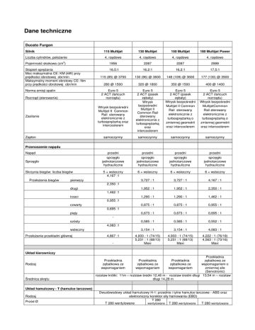 Dane techniczne Ducato Furgon Silnik 115 Multijet 130 Multijet 150 Multijet 180 Multijet Power 4, rzędowo 4, rzędowo 4, rzędowo 4, rzędowo Pojemność skokowa (cm ) 1956 2287 2287 2999 Stopień sprężania Moc maksymalna CE: KM (kW) przy prędkości obrotowej obr/min Maksymalny moment obrotowy CE: Nm przy prędkości obrotowej obr/min 16,5:1 16,2:1 16,2:1 17,5:1 115 (85) @ 3700 130 (96) @ 3600 148 (109) @ 3600 177 (130) @ 3500 280 @ 1500 320 @ 1800 350 @ 1500 400 @ 1400 Euro 5 2 ACT (łańcuch rozrządu) Euro 5 2 ACT (pasek zębaty) Wtrysk bezpośredni Multijet II Common Rail sterowany elektronicznie z turbosprężarką oraz intercoolerem Euro 5 2 ACT (pasek zębaty) Wtrysk bezpośredni Multijet II Common Rail sterowany elektronicznie z turbosprężarką o zmiennej geometrii oraz intercoolerem Euro 5 2 ACT (łańcuch rozrządu) Wtrysk bezpośredni MultijetCommon Rail sterowany elektronicznie z turbosprężarką o zmiennej geometrii oraz intercoolerem samoczynny samoczynny samoczynny samoczynny przedni sprzęgło jednotarczowe hydrauliczne przedni sprzęgło jednotarczowe hydrauliczne przedni sprzęgło jednotarczowe hydrauliczne przedni sprzęgło jednotarczowe hydrauliczne 5 + wsteczny 4,167 :1 6 + wsteczny 6 + wsteczny 6 + wsteczny 3,727 : 1 3,727 : 1 4,167 : 1 1,952 : 1 1,952 : 1 2,350 : 1 1,290 : 1 1,290 : 1 1,462 : 1 0,875 : 1 0,875 : 1 0,955 : 1 0,673 : 1 0,673 : 1 0,695 : 1 0,585 : 1 0,585 : 1 0,552 : 1 3,154 : 1 3,154 : 1 4,083 : 1 4,933 : 1 (74/15) 5,231 : 1 (68/13) Maxi 4,933 : 1 (74/15) 5,231 : 1 (68/13) Maxi 4,222 : 1 (76/18) 4,563 : 1 (73/16) Maxi Liczba cylindrów, położenie 3 Norma emisji spalin Rozrząd (sterowanie) Wtrysk bezpośredni Multijet II Common Rail sterowany elektronicznie z turbosprężarką oraz intercoolerem Zasilanie Zapłon Przenoszenie napędu Napęd Sprzęgło Skrzynia biegów: liczba biegów Przełożenia biegów pierwszy 2,350 :1 drugi 1,462 :1 trzeci 0,955 :1 czwarty 0,695 :1 piąty szósty 4,083 :1 wsteczny Przełożenie przekładni głównej 4,867 :1 - Układ kierowniczy Rodzaj Średnica skrętu Przekładnia zębatkowa ze wspomaganiem o zmiennej sile (Servotronic) rozstaw krótki: 11m – rozstaw średni 12,46 m - rozstaw średni-długi 13,54 m – rozstaw długi 14,28 m Przekładnia zębatkowa ze wspomaganiem Przekładnia zębatkowa ze wspomaganiem Przekładnia zębatkowa ze wspomaganiem Układ hamulcowy - T (hamulce tarczowe) Rodzaj Przód Ø Dwuobwodowy układ hamulcowy H-1: przednie i tylne hamulce tarczowe - ABS oraz elektroniczny korektor siły hamowania (EBD) T 280 T 280 wentylowane T 280 wentylowane wentylowane T 280 wentylowane T 300 - Maxi T 300 wentylowane - Maxi T 300 wentylowane Maxi T 280 T 280 T 280 T 280 11" 11" 11" 11" wentylowane Tył Ø Wspomaganie hamulców Zawieszenie Przednie Tylne niezależne zawieszenia kół typu McPherson z wahaczami przytwierdzonymi do belki pomocniczej, sprężynami spiralnymi oraz amortyzatorami teleskopowymi i drążkiem stabilizatora sztywny most rurowy z parabolicznymi resorami piórowymi, amortyzatorami teleskopowymi, elastycznymi bocznymi odbojnikami Koła Ogumienie 215/70 R 15 C (225/70 R 15 C opcjonalnie) - Maxi: 225/75 R 16 C Instalacja elektryczna 12v Pojemność akumulatora (Ah) 95 95 95 110 Maksymalna masa uciągu (kg) 2000 2500 2500 2500 Pojemność zbiornika paliwa: l 90 90 90 90 145-155 152-162 161-171 6,8 (**) 7,1 - 7,4 7,1 - 7,4 8 - 8,4 179 (**) 186 – 195 186 – 195 209 – 222 Masy – Pojemność zbiornika paliwa Osiągi 135-140 Prędkość maksymalna (*) Zużycie NEDC (l/100 km) (*) Emisja CO2 NEDC (g/km) (*) (*) minimalne i maksymalne wartości w zależności od modelu oraz wersji (**) Dla wersji Kombi Rozstaw krótki i standardowa wysokość dachu: Zużycie NEDC (l/100 km) 6,4 - Emisja CO2 NEDC (g/100 Km) 169 Wymiary i masy Wymiary zewnętrzne (mm) Furgon Wymiary wewnętrzne przedziału ładunkowego (mm) Rozstaw osi Długość Wysokość Szerokość Długość Wysokość Szerokość Szerokość nadkola Przedział ładunkowy (m3) L1H1 3000 4963 2254 2050 2670 1662 1870 1422 8 L1H2 3000 4963 2524 2050 2670 1932 1870 1422 9,5 L2H1 3450 5413 2254 2050 3120 1662 1870 1422 10 L2H2 3450 5413 2524 2050 3120 1932 1870 1422 11,5 L3H2 4035 5998 2524 2050 3705 1932 1870 1422 13 L3H3 4035 5998 2764 2050 3705 2172 1870 1422 15 L4H2 4035 6363 2524 2050 4070 1932 1870 1422 15 L4H3 4035 6363 2764 2050 4070 2172 1870 1422 17 Wymiary zewnętrzne (mm) Kabina Podwójna Kabina Rozstaw osi Długość Wysokość Szerokość L1 3000 4908 2254 2050 L2 3450 5358 2254 2050 L3 3800 5708 2254 2050 L4 4035 5943 2254 2050 L5 4035 6308 2254 2050 L3 3800 5708 2254 2050 L4 4035 5943 2254 2050 L5 4035 6308 2254 2050 Legenda L – rozstaw osi H – wysokość dachu Maksymalne dopuszczalne obciążenie osi (kg) Ducato Ducato Maxi DMC Oś przednia Oś tylna Koła 3000 1630 1650 15" 3300 1750 1900 15" 3500 1850 2000 15" 3500 2100 2400 16" 4000 2100 2400 16"