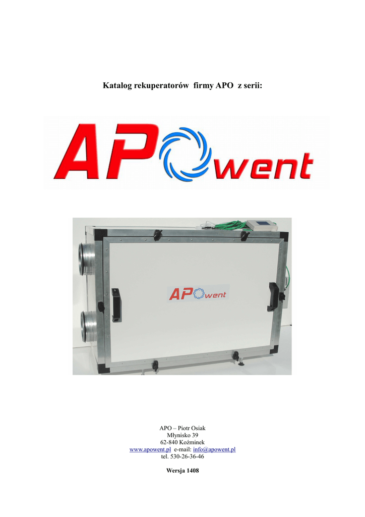 Katalog rekuperatorów firmy APO z serii: APO – Piotr Osiak Młynisko 39 62-840 Koźminek www.apowent.pl e-mail: [email protected] tel. 530-26-36-46 Wersja 1408 WSTĘP Z przyjemnością przedstawiamy Państwu ofertę produkowanych przez Naszą firmę central nawiewno-wywiewnych z odzyskiem ciepła zwanych potocznie Rekuperatorami. Projektując te urządzenia za główny cel postawiliśmy sobie zbudować rekuperator, który będzie bardzo energooszczędny, cichy oraz uzyskiwał wysoki odzysk ciepła. Dane techniczne zamieszczone w katalogu potwierdzają, ze ten cel udało nam się osiągnąć. Najważniejsze cechy naszych rekuperatorów: • • • • • • • • • Urządzenia zaprojektowane pod kątem wydajności oraz energooszczędności; Bardzo niskie zużycie prądu co oznacza niskie koszty ekspolatacji (a trzeba pamiętać że rekuperator pracuje cały czas); Bardzo ciche wentylatory firmy EBM w wykonaniu EC z najnowszymi wirnikami RadiCal; Wysoki odzysk ciepła dzięki zastosowaniu aluminiowego wymiennika przeciwprądowego; Aluminiowy by-pass z niezawodnym siłownikiem firmy Belimo; Obudowa z płyty z wypełnieniem XPS doskonale tłumiąca dźwięki oraz zapewniająca izolację termiczną; Profile aluminowe; Dostepne sterowniki mikroprocesorowe automatyzujące pracę centrali; również w wersji z kolorowym dotykowym wyświetlaczem; Obsługa Gruntowego Wymiennika Ciepła. Mamy nadzieję że dołączą Państwo do grona zadowolonych użytkowników Naszych rekuperatorów z serii APOwent. Z wyrazami szacunku Firma APO Wersje central Każdy z oferowanych modeli jest dostępny w dwóch wersjach wykonania: wariant PRAWY oraz LEWY. Stojąc przodem do frontu urządzenia, strona po której umiejscowiony jest króciec z opisem CZERPNIA określa wersję centrali. Poniżej opis wyprowadzeń dla każdej z wersji. Model H Model V APOwent 300 AEC Najmniejsza z oferowanych przez nas jednostek. Idealna dla niedużych domów z instalacjami o niewielkim oporze. Poprzez optymalny dobór podzespołów udało nam się osiągnąć bardzo niskie zużycie energii elektrycznej nie przekraczające 100 Wat przy pracy na maksymalnej wydajności centrali. Podczas codziennego użytkowania z mocą ok 50% zużycie waha się w granicach 30-40 Wat. Dla porównania więcej energii potrafi zużyć w ciągu doby Państwa telewizor niż Nasza jednostka wentylująca Wasz dom. Dane techniczne: Wydajność Maksymalne zużycie energii Wymiary filtra 350 m3/h 100W 270x410x50mm Spręż dyspozycyjny na wykresie poniżej: Spręż dyspozycyjny APOwent300 500 400 Pa 300 200 100 0 0 50 100 150 200 250 300 350 m3/h Sprawność wymiany ciepła: Sprawność wymiany ciepła Sprawność wymiany % 94 92 90 88 86 84 82 100 150 200 250 300 Wydajność m3/h Oblicz enia podane w g. programu doboru w ymiennika f irmy Klingenburg dla temp. zew -10 temp. w yw iew 21 w ilgotność odpow iednio 80 i 50% 350 Zużycie energii elektrycznej rekuperatora: Zużycie mocy [W] 100 80 60 40 20 0 20 30 40 50 60 70 Moc rekuperatora [%] Wersja pozioma H Wersja pionowa V Rysunki poglądowe bez zachowania skali 80 90 100 APOwent 450 AEC Najbardziej popularny model dostosowany wydajnością do większości średniej wielkości budynków. Płynna regulacja mocy pozwala na precyzyjne dostosowanie do danej instalacji (możliwość określenia mocy maksymalnej oraz pełna regulacja wydajności dla każdego z zaprogramowanych biegów). Kompaktowa budowa, większy wymiennik oraz wentylatory w wersji RadiCal firmy EBM to podstawowe zalety tej jednostki. Dane techniczne: Wydajność Maksymalne zużycie energii Wymiary filtra 600 m3/h 198W 300x470x50mm Spręż dyspozycyjny na wykresie poniżej: Pa Spręż dyspozycyjny rekuperatora APOwent 450 600 500 400 300 200 100 0 0 100 200 300 400 500 600 m3/h Sprawność wymiany ciepła: Sprawność wymiany ciepła Sprawność wymiany % 92 90 88 86 84 82 100 150 200 250 300 Wydajność m3/h 350 400 Oblic z enia podane w g. programu doboru w y miennika f irmy Klingenburg dla temp. z ew -10 temp. w y w iew 21 w ilgotnoś ć odpow iednio 80 i 50% 450 Zużycie energii elektrycznej rekuperatora: Zużycie mocy [W] 250 200 150 100 50 0 20 30 40 50 60 70 Moc rekuperatora [%] Wymiary zewnętrzne (bez stopek i mocowania pokrywy): Wersja pozioma H Wersja pionowa V Rysunki poglądowe bez zachowania skali 80 90 100 APOwent 600AEC Największa jednostka do zastosowań domowych, dla budynków o powierzchni ponad 250 m2. Jak w każdym modelu tu również zastosowaliśmy aluminiowy wymiennik przeciwprądowy, wentylatory EC, automatyczny, aluminiowy by-pass oraz duże filtry zapewniające skuteczną filtrację i mniejsze opory. Dane techniczne: Wydajność Maksymalne zużycie energii Wymiary filtra Spręż dyspozycyjny na wykresie poniżej: 800 m3/h 350W 350x580x50mm Spręż dyspozycyjny rekuperatora APOwent 600 1000 800 Pa 600 400 200 0 0 100 200 300 400 500 600 700 800 m3/h Sprawność wymiany ciepła: Sprawność wymiany ciepła Sprawność wymiany % 92 90 88 86 84 82 100 200 300 400 500 600 700 Wydajność m3/h Obliczenia podane w g. programu doboru w y miennika f irmy Klingenburg dla temp. zew -10 temp. w yw iew 21 w ilgotność odpow iednio 80 i 50% 750 Zużycie energii elektrycznej rekuperatora: Zużycie mocy [W] 400 300 200 100 0 20 30 40 50 60 70 Moc rekuperatora [%] Wymiary zewnętrzne (bez stopek i mocowania pokrywy): Wersja pozioma H Wersja pionowa V Rysunki poglądowe bez zachowania skali 80 90 100 Sterowniki Każdą centrale APOwent można zestawić z jednym, z dwóch dostępnych sterowników: MS14 sterownik mikroprocesorowy z wyświetlaczem graficznym i sterowaniem przyciskami; MS20 sterownik wyposażony w kolorowy dotykowy wyświetlacz, ułatwiający jego obsługę; Każdy sterownik realizuje identyczne funkcje zapewniając; • • • • • • • • • • • płynną regulację mocy centrali; pełen tygodniowy harmonogram pracy; możliwość ręcznej zmiany obrotów niezależnie od zaplanowanego harmonogramu. autom