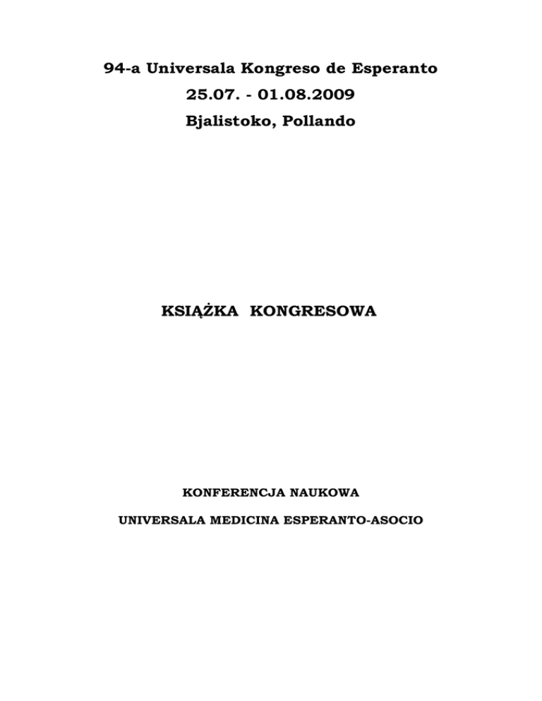 SCIENCA KONFERENCO DE UMEA Białystok 2009 94-a Universala Kongreso de Esperanto 25.07. - 01.08.2009 Bjalistoko, Pollando KSIĄŻKA KONGRESOWA KONFERENCJA NAUKOWA UNIVERSALA MEDICINA ESPERANTO-ASOCIO 1 SCIENCA KONFERENCO DE UMEA Białystok 2009 Copyright by ZOZ Ośrodek UMEA Shinoda-Kuracejo Kraków 2009 Skład komputerowy i projekt okładki Anna Krzywda Wydawnictwo: Zakład Opieki Zdrowotnej Ośrodek UMEA Shinoda-Kuracejo 31-851 Kraków os. Albertyński 1-2 e-mail: [email protected] ISBN 83-915811-9-5 2 SCIENCA KONFERENCO DE UMEA Białystok 2009 3 SCIENCA KONFERENCO DE UMEA Białystok 2009 SZANOWNI PAŃSTWO, W imieniu całej społeczności akademickiej Uniwersytetu Medycznego w Białymstoku chciałbym powitać Wszystkich, którzy przyjechali do Białegostoku, aby spotkać się na Konferencji Naukowej Medyków Esperantystów, organizowanej w ramach 94-go Światowego Kongresu Esperanto w Aula Magna Pałacu Branickich. Mam nadzieję, że konferencja będzie okazją do wymiany wiedzy i doświadczeń oraz zainspiruje do dalszego rozwoju zawodowego. Korzystając z okazji, że będziecie Państwo naszymi gośćmi zapraszam do zwiedzenia naszej wyjątkowej siedziby – Pałacu Branickich i Parku Pałacowego oraz specjalnej wystawy „Zamenhofowie i Medycyna”, przedstawiającej wkład rodziny Zamenhofów w rozwój nauk medycznych. Życzę miłego pobytu i zapraszam ponownie do naszego miasta i na Uniwersytet Medyczny w Białymstoku. 4 SCIENCA KONFERENCO DE UMEA Białystok 2009 ESTIMATAJ GESINJOROJ, Nome de la tuta akademia societo de la Medicina Universitato en Bjalistoko mi volus saluti Ĉiujn, kiuj alvenis Bjalistokon por renkontiĝi dum la Scienca Konferenco de Esperantistaj Medicinistoj organizitan enkadre de la 94-a Universala Kongreso de Esperanto en Aula Magna de Branickich Palaco. Mi esperas, ke tiu ĉi konferenco donos eblecon interŝanĝi scion kaj spertojn kaj ankaŭ iniciatos plian fakan disvolvon. Kaptante tiun ĉi okazon, ke Vi Gesinjoroj estos niaj gastoj mi invitas viziti nian unikan sidejon – Palacon de Branickich kaj la Palacan Parkon kaj ankaŭ specialan ekspozicion “Zamenhof-anoj kaj Medicino”, prezentantan la rolon de Zamenhof familio en la disvolvo de medicinaj sciencoj. Mi deziras agrablan restadon kaj ankoraŭ foje invitas al nia urbo kaj al la Medicina Universitato en Bjalistoko. 5 SCIENCA KONFERENCO DE UMEA Białystok 2009 UNIWERSYTET MEDYCZNY W BIAŁYMSTOKU Prace zmierzające do utworzenia Akademii Medycznej w Białymstoku podjęto w początkach 1949 roku. Założycielem uczelni był doktor Jerzy Sztachelski. Akademię Medyczną w Białymstoku powołano mocą rozporządzenia Rady Ministrów z dnia 3 lutego 1950 r. Organizatorem i pierwszym Rektorem Akademii był profesor Tadeusz Kielanowski. 22 marca 2008 r. weszła w życie ustawa o nadaniu Akademii Medycznej w Białymstoku nazwy Uniwersytet Medyczny w Białymstoku. Nazwa ta podkreśla uniwersytecki poziom kształcenia i badań naukowych. Uniwersytet Medyczny w Białymstoku spełnia wymagane kryteria ustawowe związane z liczbą posiadanych uprawnień do nadawania stopnia naukowego doktora. Zmiana nazwy jest więc potwierdzeniem stanu faktycznego i podkreśleniem rangi naszej Alma Mater w medycznym środowisku naukowym. Siedzibą Uczelni jest Pałac Branickich, obiekt historyczny z XVIII wieku, najokazalszy i najcenniejszy gmach zabytkowy w Białymstoku. W przyległym Collegium Primum zlokalizowano pierwsze zakłady podstawowych nauk medycznych. W drugim roku istnienia Uczelnia uzyskała uprawnienia do nadawania stopni naukowych. W roku 1953 powołano pierwsze kliniki. W 1954 r. oddano do użytku budynek Collegium Universum, który pomieścił większość zakładów nauk podstawowych. W 1955 roku rozpoczęto wydawanie czasopisma naukowego Roczniki Akademii Medycznej w Białymstoku, które ukazują się do chwili obecnej. W roku 1956 ukazało się kilka numerów miesięcznika Medyk Białostocki. W roku 2000 wznowiono wydawanie tego czasopisma. W 1962 roku oddano do użytku gmach 6 SCIENCA KONFERENCO DE UMEA Białystok 2009 Państwowego Szpitala Klinicznego. W 1968 roku powołano Oddział Stomatologii. W 1977 roku utworzono Wydział Farmaceutyczny z Oddziałem Analityki Medycznej. Początkowo dokonano naboru jedynie na Oddział Analityki Medycznej tego wydziału. Naboru na studia farmaceutyczne dokonano w roku 1987. W 1982 roku przekazano gmach Collegium Pathologicum. W 1988 roku rozpoczął działalność Dziecięcy Szpital Kliniczny. W roku 1999 przekazano do użytku budynek Collegium Novum. W tym samym roku powołano także Oddział Pielęgniarstwa. Wydział Pielęgniarstwa i Ochrony Zdrowia został powołany mocą Uchwały Senatu AMB z 30 maja 2003 r., a w 2008 r. zmienił nazwę na Wydział Nauk o Zdrowiu. Obecnie w skład kadry naukowej Uczelni wchodzi 91 profesorów, 98 doktorów habilitowanych oraz 541 pozostałych nauczycieli akademickich. Reprezentują oni nieomal wszystkie specjalności nauk lekarskich, stomatologii, farmacji i analityki medycznej. Blisko 90% obecnie zatrudnionych profesorów i doktorów habilitowanych to absolwenci Uczelni. Kadra inżynieryjno-techniczna, administracyjna i obsługi liczy 501 osób. Ponad 30 absolwentów uczelni, profesorów i doktorów habilitowanych pełni kierownicze funkcje w innych akademiach medycznych, instytutach i placówkach służby zdrowia, w kraju i za granicą. Uczelnia składa się z 63 zakładów podstawowych nauk medycznych, 47 klinik, 3 studiów, 9 samodzielnych pracowni i 2 katedr. Na Uczelni studiuje łącznie ok. 4000 studentów - w języku polskim i angielskim. Doświadczony personel naukowy Uniwersytetu Medycznego w Białymstoku gwarantuje wysoki poziom teoretycznego i praktycznego kształcenia studentów, korzystając z profesjonalnie wyposażonych sal wykładowych i seminaryjnych. Trzy filary, na których opiera się Uniwersytet to: Wydział Lekarski z Oddziałem Stomatologii i Oddziałem Nauczania w Języku Angielskim, Wydział Farmaceutyczn