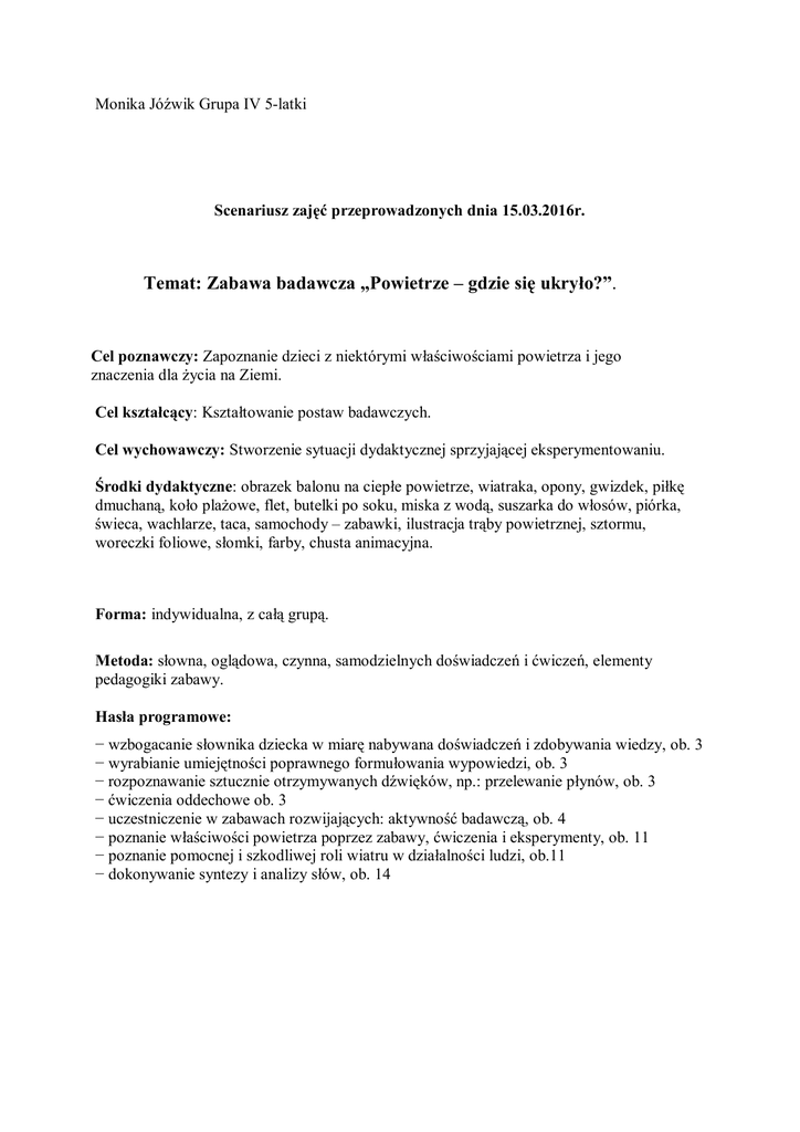 Monika Jóźwik Grupa IV 5-latki Scenariusz zajęć przeprowadzonych dnia 15.03.2016r. Temat: Zabawa badawcza „Powietrze – gdzie się ukryło?”. Cel poznawczy: Zapoznanie dzieci z niektórymi właściwościami powietrza i jego znaczenia dla życia na Ziemi. Cel kształcący: Kształtowanie postaw badawczych. Cel wychowawczy: Stworzenie sytuacji dydaktycznej sprzyjającej eksperymentowaniu. Środki dydaktyczne: obrazek balonu na ciepłe powietrze, wiatraka, opony, gwizdek, piłkę dmuchaną, koło plażowe, flet, butelki po soku, miska z wodą, suszarka do włosów, piórka, świeca, wachlarze, taca, samochody – zabawki, ilustracja trąby powietrznej, sztormu, woreczki foliowe, słomki, farby, chusta animacyjna. Forma: indywidualna, z całą grupą. Metoda: słowna, oglądowa, czynna, samodzielnych doświadczeń i ćwiczeń, elementy pedagogiki zabawy. Hasła programowe: − wzbogacanie słownika dziecka w miarę nabywana doświadczeń i zdobywania wiedzy, ob. 3 − wyrabianie umiejętności poprawnego formułowania wypowiedzi, ob. 3 − rozpoznawanie sztucznie otrzymywanych dźwięków, np.: przelewanie płynów, ob. 3 − ćwiczenia oddechowe ob. 3 − uczestniczenie w zabawach rozwijających: aktywność badawczą, ob. 4 − poznanie właściwości powietrza poprzez zabawy, ćwiczenia i eksperymenty, ob. 11 − poznanie pomocnej i szkodliwej roli wiatru w działalności ludzi, ob.11 − dokonywanie syntezy i analizy słów, ob. 14 Wstęp: 1. Powitanie Powitanie w kręgu poprzez podawanie sobie nadmuchanego balona i wypowiadanie swojego imienia z podziałem na sylaby. 2. „Nos”- zagadka słowna: „Może być prosty lub garbaty, orli lub zadarty. Nim wąchasz, oddychasz, a gdy w nim łaskocze to po prostu kichasz”. 3. „Zatkaj nos” - zabawa badawcza - dzieci dotykają swoje nosy, opisują ich kształt, a następnie zatykają nosy. N. Zadaje pytania: - Czego nie możemy robić kiedy mamy zatkany nos? - Czym oddychamy? - Co by się stało gdybyśmy dłużej trzymali zatkane nosy? • Wniosek: BEZ POWIETRZA NIE MOŻNA ŻYĆ! Rozwinięcie: 4. „Co to jest powietrze?”- burza mózgów. - Co mogę zrobić z tym balonem? - (Nauczycielka dmucha balon.) Dlaczego ten balon rośnie? - (A przy wypuszczaniu powietrza pyta). A teraz maleje? Co było w balonie? (powietrze) - Gdzie jest powietrze, które wyleciało z balona? (wokół nas) - Jakie jest powietrze? (Dzieci łapią rączkami powietrze.) Nauczycielka pyta? - Czy widzicie na dłoni powietrze, jaki ma kolor? (powietrze jest nie widoczne) - A teraz powąchajmy powietrze, czy czujecie coś? (powietrze jest bezwonne) - A teraz łapiemy buźkami powietrze, czy ma jakiś smak? (nie ma) - A do czego jest nam potrzebne powietrze? (dzieci mogą zrobić kilka głębokich wdechów i wydechów, aby stwierdzić, że powietrze jest potrzebne do życia, oddychania) •Wniosek: - Powietrze jest bezbarwne, bez smaku, bez zapachu! N. informuje dzieci, że przez cały dzień będą tropili powietrze. 5. „Po co nam powietrze?” – zapoznanie dzieci ze sposobami praktycznego wykorzystania powietrza przez człowieka. N. pokazuje dzieciom prezentację - obrazek balonu na ciepłe powietrze, wiatraka, opony, gwizdek, piłkę dmuchaną, koło plażowe, flet. Dzieci opisują przedmioty, ich zastosowanie. - Co by się stało z tymi przedmiotami, gdyby powietrza nie było? - Czy przedmioty te byłyby użyteczne? 6. Doświadczenia: - CZY POWIETRZE MOŻNA ZOBACZYĆ? Dzieci siedzą na dywanie tworząc duże koło, nauczycielka na środku kładzie miskę z wodą, butelkę i słomki. Następnie wybrane dzieci poprzez zanurzenie w wodzie butelki obserwują wydobywające się bąbelki. (Wybrane dziecko po kolei głośno mówi co robi i co się dzieje; przedszkolaki próbują wyciągnąć proste wnioski z doświadczenia). Następnie wybrane dzieci otrzymują słomkę, wsadzają do wody i dmuchją. Dzieci odpowiadają na pytania: - Co znajduje się w butelce? - Co dzieje się z powietrzem w butelce podczas zanurzania jej w wodzie? - Co dzieje się gdy dmuchamy w słomkę zanurzaną w wodzie? - Z otworu szyjki wylatują „bąbelki”. - Butelka napełnia się wodą. - Czym są te bąbelki? - Bąbelki to pęcherzyki powietrza, które wylatują z butelki. •Wniosek: – tak powietrze jest w wodzie, bo widoczne są pęcherzyki. Powietrze jest wszędzie – wypełnia całą powierzchnię wokół nas. Jest w roślinach, w wodzie, w ziemi. Otacza naszą kulę ziemską i ta warstwa nazywa się "atmosferą". Żeby się przekonać o jego istnieniu trzeba poobserwować jego działanie na rzeczy wokół nas ( dmuchanie na wiatraczek) - CZY POWIETRZE MOŻNA OGRZAĆ? Nauczycielka sama wykonuje doświadczenie. Na początek włącza suszarkę i kieruję ją w stronę każdego przedszkolaka, jednocześnie pyta: - Jakie czujecie powietrze z suszarki? (ciepłe, gorące) - A gdy otworzę okno, to jakie powietrze wpadnie do sali, jakie poczujemy? (chłodne, zimne) - Zatem, jakie powietrze jest zimą a jakie latem? - CZY POWIETRZE MOŻE SIĘ PORUSZAĆ? Nauczycielka wręcza dzieciom piórka. Dzieci dmuchają na piórka leżące na ich dłoniach. Odpowiadają na pytanie: - Co dzieje się z piórkami? - Co je porusza? - CZY POWIETRZE MOŻNA USŁYSZEĆ? Dzieci dowiadują się, że powietrze wdmuchiwane w niektóre instrumenty muzyczne ulega przekształceniu i słyszymy muzykę. Zabawa z butelkami - dzieci dmuchają przy wlocie butelki, tak aby wydobyć dźwięk. Gwizdek - nauczycielka dmucha w gwizdek. Dzieci przekonują się, że słychać wydobywające się powietrze w formie gwizdu. Dzieci słuchają objaśnień, iż powietrze można usłyszeć w przyrodzie ( świszczący wiatr)wykorzystanie nagrania płyty CD - CZY POWIETRZE JEST CIĘŻKIE? (wypowiedzi dzieci) Tak powietrze ma swój ciężar. W encyklopedii dla dzieci znalazłam informacje, że w średnio dużym pokoju jest 45 kg powietrza. Spróbujmy je zważyć (doświadczenie z ważeniem baloników – na wadze ważymy dwa 
