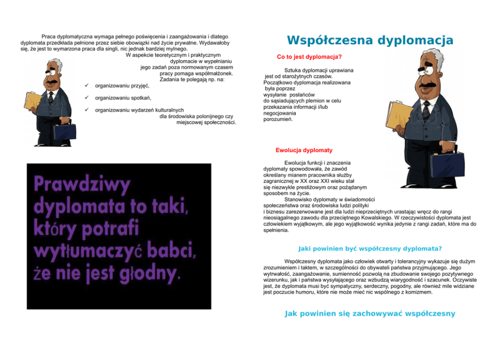 Praca dyplomatyczna wymaga pełnego poświęcenia i zaangażowania i dlatego dyplomata przedkłada pełnione przez siebie obowiązki nad życie prywatne. Wydawałoby się, że jest to wymarzona praca dla singli, nic jednak bardziej mylnego. W aspekcie teoretycznym i praktycznym dyplomacie w wypełnianiu jego zadań poza normowanym czasem pracy pomaga współmałżonek. Zadania te polegają np. na: organizowaniu przyjęć, organizowaniu spotkań, organizowaniu wydarzeń kulturalnych dla środowiska polonijnego czy miejscowej społeczności. Współczesna dyplomacja Co to jest dyplomacja? Sztuka dyplomacji uprawiana jest od starożytnych czasów. Początkowo dyplomacja realizowana była poprzez wysyłanie posłańców do sąsiadujących plemion w celu przekazania informacji i/lub negocjowania porozumień. Ewolucja dyplomaty Ewolucja funkcji i znaczenia dyplomaty spowodowała, że zawód określany mianem pracownika służby zagranicznej w XX oraz XXI wieku stał się niezwykle prestiżowym oraz pożądanym sposobem na życie. Stanowisko dyplomaty w świadomości społeczeństwa oraz środowiska ludzi polityki i biznesu zarezerwowane jest dla ludzi nieprzeciętnych urastając wręcz do rangi nieosiągalnego zawodu dla przeciętnego Kowalskiego. W rzeczywistości dyplomata jest człowiekiem wyjątkowym, ale jego wyjątkowość wynika jedynie z rangi zadań, które ma do spełnienia. Jaki powinien być współczesny dyplomata? Współczesny dyplomata jako człowiek otwarty i tolerancyjny wykazuje się dużym zrozumieniem i taktem, w szczególności do obywateli państwa przyjmującego. Jego wytrwałość, zaangażowanie, sumienność pozwolą na zbudowanie swojego pozytywnego wizerunku, jak i państwa wysyłającego oraz wzbudzą wiarygodność i szacunek. Oczywiste jest, że dyplomata musi być sympatyczny, serdeczny, pogodny, ale również mile widziane jest poczucie humoru, które nie może mieć nic wspólnego z komizmem. Jak powinien się zachowywać współczesny dyplomata? Ważne jest, aby współczesny dyplomata nie rozmawiał o wszystkim ze wszystkimi, ale z drugiej strony nie może doprowadzić do zbudowania wokół siebie muru obronnego. Co spowodować może jedynie posądzenie go o bycie tajnym agentem. Misja dyplomatyczna polega na: reprezentowaniu swojego kraju, ochronie jego interesów oraz obywateli państwa wysyłającego zgodnie z prawem międzynarodowym i prawem państwa przyjmującego; działaniu na rzecz promocji Polski, a zwłaszcza polskiej kultury, nauki i gospodarki; nadzorowaniu działalności wszystkich placówek zagranicznych w państwie przyjmującym; popieraniu przyjaznych stosunków między Rzeczpospolitą Polską a państwem przyjmującym; współdziałaniu w zakresie niezbędnym do wykonywania zadań przez członków służby zagranicznej; analizie sytuacji politycznej, gospodarczej, kulturalnej i społecznej państwa przyjmującego. Co jest wymagane od współczesnego dyplomaty? bystrość umysłu, pewnego rodzaju ,,przebiegłość’’, która pozwoli mu przewidzieć bieg wydarzeń, pracownik służby dyplomatyczno konsularnej zna co najmniej dwa Stając na przykład w roli języki obce oraz negocjatora, mile widziana jest wykazuje się u niego znajomość opanowaniem, ponieważ tzw. rzadkich języków w głównej mierze od obcych; podstawowym niego zależy osiągnięcie językiem jest oczywiście sukcesu w negocjacjach. angielski i/lub francuski, z kolei prezencja dyplomaty nie sprowadza się wyłącznie do elegancji połączonej z dobrym smakiem i wyrafinowanym strojem, ale również do poprawnej aparycji; strój musi być dostosowany do sytuacji i warunków, w których znajduje się dyplomata. Co jest wymagane od pracownika służby dyplomatycznokonsularnej? Praca na etacie pracownika służby dyplomatyczno – konsularnej wymaga pełnego poświęcenia, o 8 godzinnym dniu pracy tylko od poniedziałku do piątku można zapomnieć. W etat dyplomaty wpisane są na stałe bankiety, uroczystości państwowe, kulturalne oraz spotkania nieoficjalne. Dyplomaci obciążeni są dodatkowo dyżurami na placówce w dni wolne od pracy i święta oraz muszą się stawiać w tzw. nagłych przypadkach, czyli np. wypadku autokaru z obywatelami kraju pochodzenia albo w razie konieczności udzielenia pomocy obywatelom kraju pochodzenia w innych nagłych wypadkach, bez względu na porę dnia.