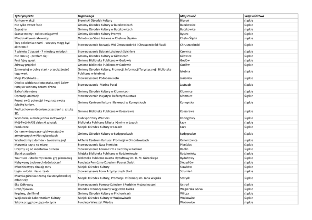 Tytuł projektu Fantom w akcji Nie tylko sweet focie Zagrajmy Szanse mamy - sukces osiągamy! Młodzi aktywni ratownicy Trzy pokolenia z nami - wszyscy mogą być aktorami ! 7 wieków 7 życzeń - 7 miesięcy młodych Nie łam się - przełam się ! Fest fajny quest Zdrowy projekt! Zainwestuj w dobry start - przecież jesteś tego wart. Moja Pocztówka ... Okolica widziana z lotu ptaka, czyli Zalew Porajski widziany oczami drona Bałkańskie rytmy Operacja-animacja Poznaj swój potencjał i wyznacz swoją ścieżkę kariery. Pod Lachowym Groniem przestrzeń z sztuką 3D. Wymówka, a może jednak motywacja? Mój-Twój-NASZ dziarski zakątek Producenci Co nam w duszy gra- cykl warsztatów artystycznych w Pietrzykowicach Wychodzimy z domów - tworzymy grę! Marzenia szyte na miarę Uczymy się od mentorów biznesu Śląski przepiśnik Your turn - Stwórzmy razem grę planszową Nabywamy życiowych doświadczeń Młodzieżotypy obalają mity Login: młodzi. Hasło: teatr Muzyka góralska szansą dla szczyrkowskiej młodzieży Eko Odkrywcy Ura(t/d)owani Kręcimy, ale filmy! Wojkowickie Laboratorium Kultury Szkoła przygotowująca do życia Organizacja Bieruński Ośrodek Kultury Gminny Ośrodek Kultury w Buczkowicach Gminny Ośrodek Kultury w Buczkowicach Gminny Ośrodek Kultury Promyk Ochotnicza Straż Pożarna w Chełmie Śląskim Miejscowść Bieruń Buczkowice Buczkowice Bystra Chełm Śląski Województwo śląskie śląskie śląskie śląskie śląskie Stowarzyszenie Rozwoju Wsi Chruszczobród i Chruszczobród Piaski Chruszczobród śląskie Stowarzyszenie Działań Lokalnych Spichlerz Gminny Ośrodek Kultury w Gilowicach Gminna Biblioteka Publiczna w Godowie Gminna Biblioteka Publiczna w Godowie Gminny Ośrodek Kultury, Promocji, Informacji Turystycznej i Biblioteka Publiczna w Istebnej Stowarzyszenie Podobamisietu Czernica Gilowice Godów Godów śląskie śląskie śląskie śląskie Istebna śląskie Jasienica śląskie Stowarzyszenie Marina Poraj Jastrząb śląskie Gminny Ośrodek Kultury w Kłomnicach Stowarzyszenie Inicjatyw Twórczych Dratwa Kłomnice Kłomnice śląskie śląskie Gminne Centrum Kultury i Rekreacji w Konopiskach Konopiska śląskie Gminna Biblioteka Publiczna w Koszarawie Koszarawa śląskie Klub Sportowy Warriors Biblioteka Publiczna Miasta i Gminy w Łazach Miejski Ośrodek Kultury w Łazach Koziegłowy Łazy Łazy śląskie śląskie śląskie Gminny Ośrodek Kultury w Łodygowicach Łodygowice śląskie ARTeria Centrum Kultury i Promocji w Ornontowicach Stowarzyszenie Nasz Pierściec Stowarzyszenie Forum Firm z siedzibą w Radlinie Miejska Biblioteka Publiczna w Radzionkowie Biblioteka Publiczna miasta Rydułtowy im. H. M. Góreckiego Fundacja Pomóżmy Dzieciom Poznać Świat Miejski Ośrodek Kultury Stowarzyszenie Form Artystycznych Sfart Ornontowice Pierściec Radlin Radzionków Rydułtowy Skrzydlów Sławków Strumień śląskie śląskie śląskie śląskie śląskie śląskie śląskie śląskie Miejski Ośrodek Kultury, Promocji i Informacji im. Jana Więzika Szczyrk śląskie Stowarzyszenie Pomocy Dzieciom i Rodzinie Można Inaczej Ośrodek Promocji Gminy Węgierska Górka Gminny Ośrodek Kultury w Pilchowicach Miejski Ośrodek Kultury w Wojkowicach Fundacja Warsztat Wiedzy Ustroń Węgierska Górka Wilcza Wojkowice Wojkowice śląskie śląskie śląskie śląskie śląskie Mnie ta ziemia od innych droższa - znam historię swojej gminy Gmina Żarnowiec i jej tajemnicze zakątki Niesamowite opowieści Gminna Biblioteka Publiczna Żarnowiec śląskie Gminny Ośrodek Kultury, Sportu i Turystyki w Żarnowcu Stowwarzyszenie Kół Gospodyń Wiejskich Gminy Żarnowiec Żarnowiec Żarnowiec śląskie śląskie