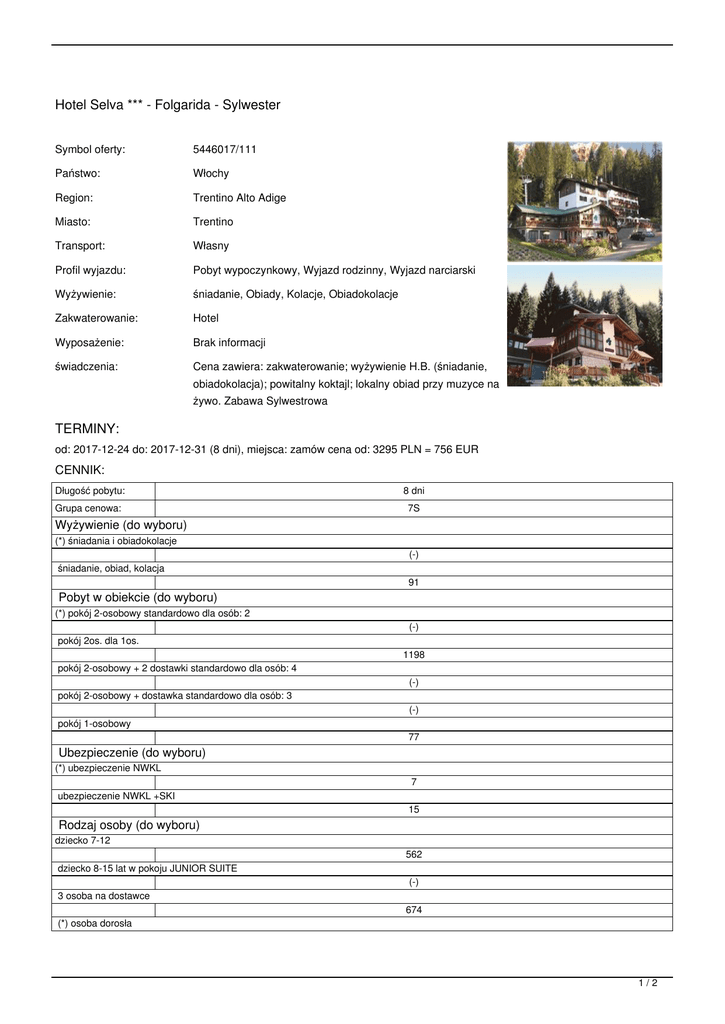 Hotel Selva *** - Folgarida - Sylwester Symbol oferty: 5446017/111 Państwo: Włochy Region: Trentino Alto Adige Miasto: Trentino Transport: Własny Profil wyjazdu: Pobyt wypoczynkowy, Wyjazd rodzinny, Wyjazd narciarski Wyżywienie: śniadanie, Obiady, Kolacje, Obiadokolacje Zakwaterowanie: Hotel Wyposażenie: Brak informacji świadczenia: Cena zawiera: zakwaterowanie; wyżywienie H.B. (śniadanie, obiadokolacja); powitalny koktajl; lokalny obiad przy muzyce na żywo. Zabawa Sylwestrowa TERMINY: od: 2017-12-24 do: 2017-12-31 (8 dni), miejsca: zamów cena od: 3295 PLN = 756 EUR CENNIK: Długość pobytu: 8 dni Grupa cenowa: 7S Wyżywienie (do wyboru) (*) śniadania i obiadokolacje śniadanie, obiad, kolacja Pobyt w obiekcie (do wyboru) (*) pokój 2-osobowy standardowo dla osób: 2 pokój 2os. dla 1os. pokój 2-osobowy + 2 dostawki standardowo dla osób: 4 pokój 2-osobowy + dostawka standardowo dla osób: 3 pokój 1-osobowy Ubezpieczenie (do wyboru) (*) ubezpieczenie NWKL ubezpieczenie NWKL +SKI Rodzaj osoby (do wyboru) dziecko 7-12 dziecko 8-15 lat w pokoju JUNIOR SUITE 3 osoba na dostawce (*) osoba dorosła (-) 91 (-) 1198 (-) (-) 77 7 15 562 (-) 674 1/2 dziecko 3-6 lat 4 osoba na dostawce Ubezpieczenie (opcjonalne) ubezpieczenie - od kosztów rezygnacji 749 375 562 2.4 % Waluta: EUR Aktualne ceny z systemu S.A.R.T. (-) - cena usługi, podatku kalkulowana przy osobie lub gratis (*) - kwota wliczona w cenę standardową 2/2