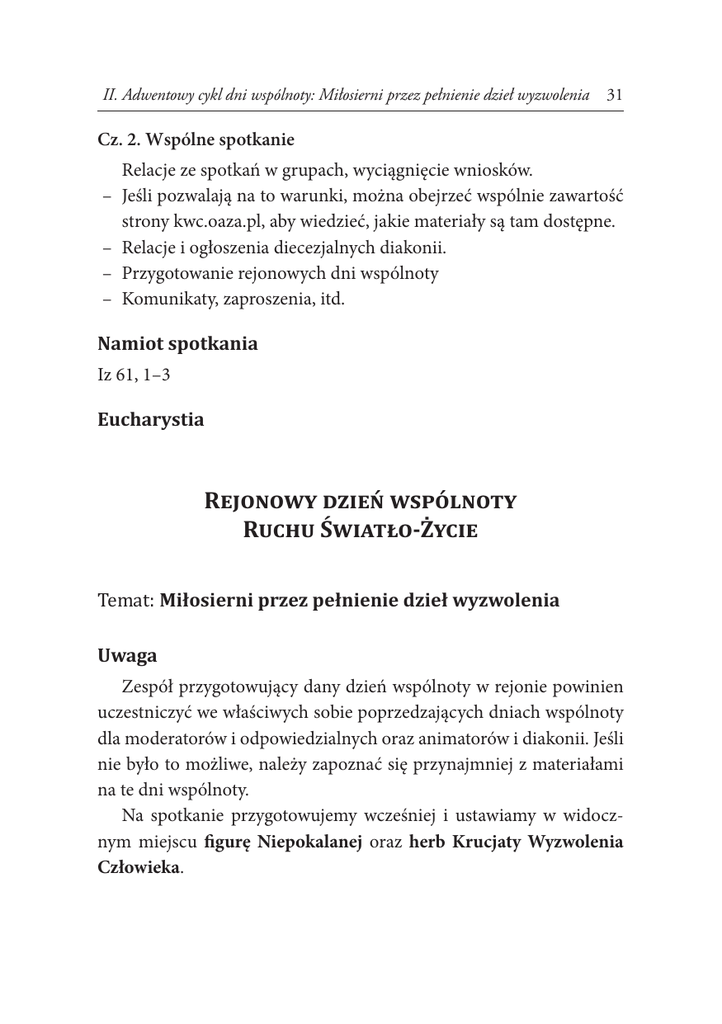 II. Adwentowy cykl dni wspólnoty: Miłosierni przez pełnienie dzieł wyzwolenia 31 Cz. 2. Wspólne spotkanie Relacje ze spotkań w grupach, wyciągnięcie wniosków. –– Jeśli pozwalają na to warunki, można obejrzeć wspólnie zawartość strony kwc.oaza.pl, aby wiedzieć, jakie materiały są tam dostępne. –– Relacje i ogłoszenia diecezjalnych diakonii. –– Przygotowanie rejonowych dni wspólnoty –– Komunikaty, zaproszenia, itd. Namiot spotkania Iz 61, 1–3 Eucharystia Rejonowy dzień wspólnoty Ruchu Światło-Życie Temat: Miłosierni przez pełnienie dzieł wyzwolenia Uwaga Zespół przygotowujący dany dzień wspólnoty w rejonie powinien uczestniczyć we właściwych sobie poprzedzających dniach wspólnoty dla moderatorów i odpowiedzialnych oraz animatorów i diakonii. Jeśli nie było to możliwe, należy zapoznać się przynajmniej z materiałami na te dni wspólnoty. Na spotkanie przygotowujemy wcześniej i ustawiamy w widocznym miejscu figurę Niepokalanej oraz herb Krucjaty Wyzwolenia Człowieka. 32 Miłosierni jak Ojciec. Dni wspólnoty Ruchu Światło-Życie w roku 2016/2017 Przebieg Zawiązanie wspólnoty Katecheza wprowadzająca w temat RDW –– Trwanie w wolności („Ku wolności wyswobodził nas Chrystus” Ga 5, 1) jest oczywistym dążeniem chrześcijanina. Także miłosierne spojrzenie na drugiego człowieka tkwiącego w różnorakich niewolach, wyzwalanie z lęku, ukazywanie Chrystusa, który ma moc wyzwalać. –– Pokazanie Krucjaty Wyzwolenia Człowieka jako czynienia miłosierdzia (Materiały źródłowe: Podręcznik KWC, Abstynenckie credo, Wolni i wyzwalający). –– Niepokalana jako wzór nowego człowieka, całkowicie wolnego, oddanego Chrystusowi (można wykorzystać tu np. homilię ks. F. Blachnickiego Tajemnica serca ze zbioru Oto Matka Twoja (seria Szkoła Modlitwy), gdzie omówiony jest związek między wolnością, oddaniem a miłością w postawie Maryi). Spotkania w grupach a) Dzielenie się życiem Każdy opowiada, w jaki sposób doświadczył Bożego miłosierdzia w ostatnim tygodniu (chodzi o to, aby umieć dostrzegać objawianie się Boga w zwykłych, codziennych wydarzeniach). b)Dzielenie się słowem Bożym Ku wolności wyswobodził nas Chrystus. A zatem trwajcie w niej i nie poddawajcie się na nowo pod jarzmo niewoli! (Ga 5, 1). Co znaczą dla mnie te słowa? Czy wierzę w to, że Chrystus mnie wyzwolił? W jakich sytuacjach doświadczam wolności? II. Adwentowy cykl dni wspólnoty: Miłosierni przez pełnienie dzieł wyzwolenia 33 Godzina świadectwa Dobrze by było, aby przynajmniej 2 osoby (maksymalnie 4) dały świadectwo dotyczące tematu wyzwolenia z niewoli (lęku, grzechu itp.). Na zakończenie zapraszamy do wspólnej modlitwy zawierzenia KWC: Niepokalana, Matko Kościoła! Wpatrując się w Ciebie, jako wzór człowieka w pełni odkupionego i wyzwolonego i dlatego przez miłość bezgranicznie oddanego w Duchu Świętym Chrystusowi, uświadamiamy sobie wieloraką niewolę, w której są uwikłane nasze serca. Pragnąc w pełni wyzwolić siebie i podać rękę naszym braciom oczekującym objawienia się w nich wolności synów Bożych, zbliżamy się do Ciebie i oddajemy się Tobie, aby wraz z Tobą, mocą tego samego Ducha, który bez przeszkód działał w Tobie, pełniej zrealizować swoją wolność w oddaniu się Chrystusowi a przez Niego – Ojcu. W Twoje ręce składamy przyrzeczenie abstynencji od alkoholu i postanowienie całkowitego uniezależnienia się od niego, abyśmy mogli swoją wolnością wyzwalać naszych braci, którzy nie mogą już wyzwolić się o własnych siłach. Pragniemy przez ten czyn miłości podać rękę i służyć naszym bliźnim, tak jak Chrystus, który z miłości ku nam uniżył samego siebie, przyjąwszy postać sługi. Oddajemy Ci całe dzieło Krucjaty Wyzwolenia Człowieka, pragnąc, aby było ono Twoim dziełem i narzędziem w Twoim ręku dla wyzwolenia narodu. Chcemy wraz z Tobą i z oddanym Ci całkowicie Świętym Janem Pawłem II stanąć pod krzyżem Chrystusa, wyznając, iż tylko zjednoczenie z Nim w miłości, której wyrazem jest ofiara, może wyzwolić życiodajną i macierzyńską moc dla ratowania tych, którzy stali się niewolnikami dlatego, że utracili zdolność miłowania czyli posiadania siebie w dawaniu siebie. Święty Stanisławie, biskupie i męczenniku, patronie Krucjaty Wyzwolenia Człowieka, natchnij nas odwagą w dawaniu świadectwa i męstwem w obliczu trudności i prześladowań, abyśmy bez lęku pracowali nad odbudową ładu moralnego w naszej Ojczyźnie. Święty Maksymilianie Kolbe, naucz nas miłować braci kosztem ofiary z siebie. Amen. 34 Miłosierni jak Ojciec. Dni wspólnoty Ruchu Światło-Życie w roku 2016/2017 Wariant (zamiast godziny świadectwa) Godzina odpowiedzialności i misji/ nabożeństwo KWC Można zaadaptować schematy zawarte w teczkach roku) ze świadectwami i składaniem deklaracji przez nowych członków. Namiot spotkania Ewangelia z dnia Eucharystia Agapa