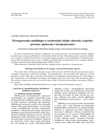Przegląd Medyczny Uniwersytetu Rzeszowskiego i Narodowego Instytutu Leków w Warszawie Rzeszów 2010, 3, 364–376 © Wydawnictwo UR 2010 ISSN 2082-369X Ludwika Sadowska, Sławomir Kańczuła Występowanie mobbingu w środowisku służby zdrowia (Aspekty prawne, społeczne i terapeutyczne) Z Instytutu Fizjoterapii Wydziału Medycznego Uniwersytetu Rzeszowskiego W pracy przedstawiono aktualne wiadomości na temat przyczyn i powstawania zjawiska nękania psychicznego zwanego mobbingiem w środowisku służby zdrowia. Scharakteryzowano zjawisko mobbingu w relacji do sytuacji kryzysowych oraz sposoby diagnozowania i przeciwdziałania w kontekście Konstytucji PR, istniejącego prawa pracy i kodeksu etyki lekarskiej. Przedstawiono role i zadania Ogólnopolskiego Stowarzyszenia Antymobbingowego (OSA) w Polsce. Słowa kluczowe: mobbing, służba zdrowia, aspekty prawne, społeczne i terapeutyczne Mobbing in the Health service (Legal, social and therapeutic aspects) The article deals with the present-day causes of the existence within the health care personal of psychological harassment called the mobbing. This phenomenon was described with reference to crisis situations. At the same time, it presents the methods of its diagnosis and preventing of it in the light of the Constitution of the Republic of Poland, the binding labor law and of the Code of medical ethics. The authors bring up also the role and the tasks of the all-Polish anti-mobbing Association (OSA) in our country. Key words: mobbing, (national) health service, legal, social and therapeutic aspects mobbing wynika z nieumiejętności kierowania ludźmi lub ze złej woli przełożonych. Pracownik poddany presji psychicznej najczęściej nie wie, jak może się bronić, do kogo zwrócić się o pomoc. Zadręcza sam siebie, swoich najbliższych lub bezskutecznie szuka pomocy – nawet u lekarza. Mobbing to coś więcej niż tylko zła atmosfera w pracy, coś o wiele gorszego niż okazjonalne niesprawiedliwe traktowanie czy złośliwa plotka. Zjawisko to opisywane jest także rzadziej jako harassment (nękanie), bullying (tyranizowanie) lub ganging up on someone (sprzysięganie się przeciwko komuś). Pojęcie bullying zawiera w sobie elementy gróźb i przemocy fizycznej. Mobbing to rodzaj terroru psychicznego, stosowanego przez jedną lub kilka osób przeciwko 1. DEFINICJE I ROZRÓŻNIENIE TERMINÓW MOBBING I KRYZYS 1.1. Definicja pojęcia mobbingu Mobbing jest to bezpodstawne, uporczywe i powtarzające się dręczenie pracownika przez przełożonych lub współpracowników; wywieranie na niego przemocy psychicznej lub społecznej. Mobbing jest stosowany zwykle wobec jednostki, rzadko wobec grupy pracowników, co powoduje u osoby prześladowanej poczucie osamotnienia, bezsilności i odrzucenia przez grupę. Uprawianiu mobbingu sprzyja niezrównoważony rynek pracy, istnienie wielkiego bezrobocia oraz tzw. przerosty zatrudnienia, kiedy pracodawca, nie mogąc zwolnić pracownika z przyczyn formalnych, ucieka się do stosowania wobec niego presji psychicznej, aby sam usunął się z pracy. Najczęściej jednak 364 przeważnie jednej osobie. Represjonowanie pokrzywdzonej osoby, rzadziej grupy osób trwa długo, miesiące, a nawet lata. Maltretowanie psychiczne powtarza się systematycznie, zaś osoba maltretowana pozbawiona jest możliwości obrony. W tej sytuacji bezradności i bezsilności pozostaje tak długo, jak długo utrzymują się działania mobbingowe w jej kierunku. Samo słowo mobbing pochodzi od angielskiego mob – tłum, motłoch, tłuszcza i oznacza tyle co napadać na kogoś, zaczepiać, nagabywać, atakować. W nowym znaczeniu użył go szwedzki lekarz i psycholog Heinz Leymann, od wielu lat zajmujący się problemem przemocy psychicznej w miejscy pracy. Pojęcie bullying Leymann proponuje zarezerwować dla opisania zjawisk przemocy w szkole, w grupach dzieci i młodzieży, gdzie poza agresją psychiczną występują akty przemocy fizycznej, która w przypadku mobbingu jest spotykana bardzo rzadko [1, 2, 3, 4, 5]. Z przemocą psychiczną mamy do czynienia tam, gdzie ludzie przebywają ze sobą w grupie przez dłuższy czas – w szkole, wyższej uczelni, w miejscu pracy, w stowarzyszeniach i wspólnotach, a także w rodzinie. Celem sprawcy jest zepsucie opinii ofiary i zaszkodzenie jej w sposób, który pozwoli wyeliminować ją z pozycji, jaką zajmuje. Stopniowo niszczy się jej reputację, zaburza i niszczy się jej stosunki interpersonalne, wpływa się negatywnie na jakość wykonywanej przez nią pracy. Trwający długo spór powoduje wreszcie zaburzenia zdrowotne i prowadzi do różnych chorób. Jest to proces, który przebiega etapami, a w fazach bardziej zaawansowanych nie daje poszkodowanemu żadnych szans aby sam, bez fachowej i życzliwej pomocy mógł wydostać się z błędnego koła szykan i prześladowań. Narzędzia, jakimi posługuje się mobbing, to szykany, zwodzenie, podstęp i intryga, kłamstwa, plotki, oszczerstwa, zachowania sadystyczne. Ich wystąpieniu sprzyja taka organizacja pracy, gdzie osobę traktuje się instrumentalnie; tam, gdzie popełnia się błąd kapitalizmu pierwotnego – kiedy człowiek zostaje potraktowany jak jeden ze środków produkcji, jako narzędzie, a nie – jak to odpowiada właściwej godności jego pracy – jako podmiot i sprawca. Pracownik nie ma tu nic do powiedzenia, przełożony nie liczy się z jego opinią, zaś wartość podwładnego ocenia co najwyżej na podstawie wydajności pracy [6, 7, 8]. 1.2. Rozróżnienie terminów mobbing i konflikt U podstaw mobbingu leży zawsze konflikt. W życiu zawodowym, tak jak i w życiu prywatnym, konflikty są na porządku dziennym. Pod pojęciem konfliktu rozumie się wszelkie zderzenie sprzecznych dążeń zbiorowych lub indywidualnych prowadzące bądź do ich uzgodnienia, bądź do unicestwienia jednego z tych dążeń. Do zaistnienia konfliktu wystarczy też przekonanie stron o istnieniu takiej sprzeczności i o tym, 