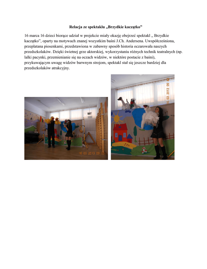 Relacja ze spektaklu „Brzydkie kaczątko” 16 marca 16 dzieci biorące udział w projekcie miały okazję obejrzeć spektakl „ Brzydkie kaczątko”, oparty na motywach znanej wszystkim baśni J.Ch. Andersena. Uwspółcześniona, przeplatana piosenkami, przedstawiona w zabawny sposób historia oczarowała naszych przedszkolaków. Dzięki świetnej grze aktorskiej, wykorzystaniu różnych technik teatralnych (np. lalki pacynki, przemienianie się na oczach widzów, w niektóre postacie z baśni), przykuwającym uwagę widzów barwnym strojom, spektakl stał się jeszcze bardziej dla przedszkolaków atrakcyjny.