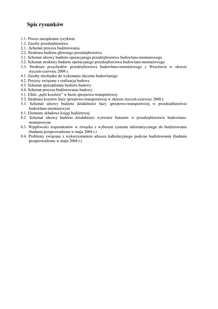 Spis rysunków 1.1. Proces zarządzania ryzykiem 1.2. Zasoby przedsiębiorstwa 2.1...Schemat procesu budżetowania 2.2. Struktura budżetu głównego przedsiębiorstwa 3.1. Schemat ideowy budżetu operacyjnego przedsiębiorstwa budowlano-montażowego 3.2. Schemat struktury budżetu operacyjnego przedsiębiorstwa budowlano-montażowego 3.3. Struktura przychodów przedsiębiorstwa budowlano-montażowego z Wrocławia w okresie styczeń-czerwiec 2008 r. 4.1. Zasoby niezbędne do wykonania zlecenia budowlanego 4.2. Procesy związane z realizacją budowy 4.3. Schemat sporządzania budżetu budowy 4.4. Schemat procesu budżetowania budowy 5.1. Efekt ,,pętli kosztów” w bazie sprzętowo-transportowej 5.2. Struktura kosztów bazy sprzętowo-transportowej w okresie styczeń-czerwiec 2008 r. 5.3. Schemat ideowy budżetu działalności bazy sprzętowo-transportowej w przedsiębiorstwie budowlano-montażowym 8.1. Elementy składowe księgi budżetowej 8.2. Schemat ideowy budżetu działalności wytwórni betonów w przedsiębiorstwie budowlanomontażowym 8.3. Wątpliwości respondentów w związku z wyborem systemu informatycznego do budżetowania (badania przeprowadzone w maju 2004 r.) 8.4. Problemy związane z wykorzystaniem arkusza kalkulacyjnego podczas budżetowania (badania przeprowadzone w maju 2004 r.) Spis tabel 1.1. 1.2. 1.3. Podział obiektów budowlanych Obszary odpowiedzialności, procesy i miejsca powstawania kosztów w przedsiębiorstwie budowlano-montażowym Wybrane problemy funkcjonowania budżetowania w przedsiębiorstwach budowlano-montażowych 1.4. Pracownicy odpowiedzialni za tworzenie budżetu 2.1. Odstępstwa od klasycznej struktury budżetu głównego w zakresie kosztów Charakterystyka współczesnego budżetowania 2.2. 3.1. Budżet przychodów ze sprzedaży przedsiębiorstwa budowlano-montażowego 3.2. Budżet kosztów przedsiębiorstwa budowlanomontażowego według układu rodzajowego 3.3. Układ budżetu kosztów przedsiębiorstwa budowlano-montażowego według obszarów jego działalności 3.4. Budżet kosztów przedsiębiorstwa budowlanomontażowego z uwzględnieniem istotnych procesów i miejsc powstania kosztów (mpk) 3.5. Budżet kosztów przedsiębiorstwa budowlanomontażowego z uwzględnieniem procesów i miejsc powstania kosztów (mpk) w wersji rozszerzonej 3.6. Budżet wpływów przedsiębiorstwa budowlanomontażowego 3.7. Budżet wydatków przedsiębiorstwa budowlanomontażowego 3.8. 3.9. Budżet kosztów realizacji budów Budżet wydatków budowy 4.1. Przykładowy budżet kosztów działu kosztorysowania i ofertowania 4.2. Budżet budowy 4.3. Koszty zużycia materiałów 4.4. 4.5. Koszty zakupu materiałów Koszty osobowe na budowie 4.6. Koszty usług sprzętowych 4.7. Koszty usług pozostałych podwykonawców 4.8. Koszty ogólne budowy 4.9. Koszty ogólne budowy z uwzględniem 4.10. Koszty ogólne budowy z uwzględnieniem kosztów utrzymania zaplecza i kosztów usług dotyczących budowy 4.11. Budżet kosztów budowy z uwzględnieniem harmonogramu robót 4.12. Budżet kosztów budowy dotyczący robót drogowych 4.13. Układ budżetu kosztów budowy budynku mieszkalnego 4.14. Zadania do wykonania w ramach elementu robót stolarka i ślusarka 4.15. Budżet kosztów budowy z uwzględnieniem obiektów i rodzaju robót 4.16. Koszty robót mostowych z uwzględnieniem zadań w ramach obiektu 4.17. Harmonogram robót budowlanych na budowie 4.18. Wykonanie budżetu budowy 4.19. Wykonanie budżetu z uwzględnieniem obiektów 4.20. 4.21. Budżet budowy na różnych etapach realizacji Konta zespołu 5 Koszty budowy 4.22. Dekretacja związana z kosztami zużycia materiałów 4.23. Wykonanie budżetu wraz z zaangażowaniem środków 4.24. Ewidencja kosztów obszaru budowlanego 4.25. Rachunek wyników działalności budowlanej 5.1. Karta zlecenia usługi sprzętowej 5.2. Kalkulacja kosztów usług sprzętu 5.3. Koszty wynajęcia jednostki transportowej 5.4. Budżet bazy sprzętowo-transportowej 5.5. Arkusz kosztów utrzymania i eksploatacji jednostek transportowych 5.6. Koszty zarządzania bazą sprzętowo-transportową 5.7. Rachunek wyników bazy sprzętowo-transportowej 5.8. Układ kont zespołu 5 na potrzeby ewidencji kosztów bazy sprzętowo- -transportowej 5.9. 5.10. 5.11. Harmonogram pracy sprzętu budowlanego Zestawienie planowanego wykorzystania sprzętu budowlanego z celem do osiągnięcia Poziom wykonania zadań z założonym celem 6.1. Budżet kosztów zaopatrzenia i magazynowania 6.2. Koszty obsługi magazynu 6.3. Koszty utrzymania budynku magazynu 6.4. Konta zespołu 5 – Koszty według typów działalności i ich rozliczenie, dotyczącego kosztów zaopatrzenia i magazynowania 6.5. Budżet kosztów działu księgowości 6.6. Budżet kosztów ogólnych działalności przedsiębiorstwa 6.7. Porównanie kosztów rzeczywistych i planowanych w obszarze kosztów obsługi przedsiębiorstwa 6.8. Porównanie kosztów rzeczywistych z budżetem działu księgowości 6.9. Ewidencja kosztów ogólnych przedsiębiorstwa 7.1. Przykładowy rachunek wyników przedsiębiorstwa budowlano-montażowego 7.2. Rachunek wyników przedsiębiorstwa z uwzględnieniem rozliczenia kosztów pośrednich 7.3. Koszty pośrednie i podstawa ich rozliczeń 7.4. Rachunek wyników przedsiębiorstwa bez uwzględnienia rozliczeń kosztów pośrednich 7.5. Wykonanie budżetu budowy – zużycie materiałów bezpośrednich 8.1. Rodzaje ryzyka przy wdrażaniu systemu budżetowania 8.2. Harmonogram wdrożenia systemu budżetowania 8.3. Przykładowe założenia budżetowe na rok 2013 8.4. Formularze budżetu działalności bazy sprzętowotransportowej