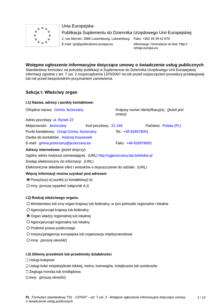 Unia Europejska Publikacja Suplementu do Dziennika Urzędowego Unii Europejskiej 2, rue Mercier, 2985 Luxembourg, Luksemburg Faks: +352 29 29 42 670 E-mail: [email protected] Informacje i formularze on-line: http:// simap.europa.eu Wstępne ogłoszenie informacyjne dotyczące umowy o świadczenie usług publicznych Standardowy formularz na potrzeby publikacji w Suplemencie do Dziennika Urzędowego Unii Europejskiej informacji zgodnie z art. 7 ust. 2 rozporządzenia 1370/2007 na rok przed rozpoczęciem procedury przetargowej lub rok przed bezpośrednim przyznaniem zamówienia. Sekcja I: Właściwy organ I.1) Nazwa, adresy i punkty kontaktowe: Krajowy numer identyfikacyjny: (jeżeli jest znany) _____ Oficjalna nazwa: Gmina Jeziorzany Adres pocztowy: ul. Rynek 22 Miejscowość: Jeziorzany Kod pocztowy: 21-146 Punkt kontaktowy: Urząd Gminy Jeziorzany Państwo: Polska (PL) Tel.: +48 818578001 Osoba do kontaktów: Andrzej Koszewski E-mail: [email protected] Faks: +48 818578002 Adresy internetowe: (jeżeli dotyczy) Ogólny adres instytucji zamawiającej: (URL) http://ugjeziorzany.bip.lubelskie.pl Dostęp elektroniczny do informacji: (URL) _____ Elektroniczne składanie ofert i wniosków o dopuszczenie do udziału: (URL) _____ Więcej informacji można uzyskać pod adresem Powyższy(-e) punkt(-y) kontaktowy(-e) Inny (proszę wypełnić załącznik A.I) I.2) Rodzaj właściwego organu Ministerstwo lub inny organ krajowy lub federalny, w tym jednostki regionalne i lokalne Agencja/urząd krajowy lub federalny Organ władzy regionalnej lub lokalnej Agencja/urząd regionalny lub lokalny Podmiot prawa publicznego Instytucja/agencja europejska lub organizacja międzynarodowa Inna: (proszę określić) I.3) Główny przedmiot lub przedmioty działalności Usługi kolejowe Usługi kolei miejskiej/kolei lekkiej, metra, tramwajów, trolejbusów lub autobusów Żegluga morska lub śródlądowa Inny: (proszę określić) PL Formularz standardowy T01 - 1370/07 – art. 7 ust. 2 - Wstępne ogłoszenie informacyjne dotyczące umowy o świadczenie usług publicznych 1 / 12 gminne przewozy pasażerskie o charakterze użyteczności publicznej I.4) Udzielenie zamówienia w imieniu innych właściwych organów Właściwy organ dokonuje zakupu w imieniu innych właściwych organów: tak nie (jeżeli tak, więcej informacji o tych właściwych organach można podać w załączniku A.II) PL Formularz standardowy T01 - 1370/07 – art. 7 ust. 2 - Wstępne ogłoszenie informacyjne dotyczące umowy o świadczenie usług publicznych 2 / 12 Sekcja II: Przedmiot zamówienia II.1) Opis: II.1.1) Nazwa nadana zamówieniu: Ogloszenie o zamiarze bezpośredniego zawarcia umowy o świadczenie usług w zakresie publicznego transportu zbiorowego na terenie gminy Jeziorzany II.1.2) Rodzaj zamówienia, dziedzina(-y), której(-ych) dotyczą usługi transportu publicznego: Kategoria usług: nr: T-05 (Zob. kategorie usług w załączniku B) Dziedziny, których dotyczą usługi transportu publicznego: Gminne przewozy pasażerskie Kod NUTS: PL315 II.1.3) Krótki opis zamówienia: Przedmiotem umowy będzie świadczenie usług w zakresie publicznego transportu zbiorowego na terenie gminy Jeziorzany w 2017r. Usługi będą obejmowały transport drogowy o charakterze użyteczności publicznej wyłącznie na terenie gminy Jeziorzany.Gmina jako organizator zamierza zawrzeć umowę z przewoźnikiem na podstawie art. 22 ust. 1 ustawy z dnia 16 grudnia 2010r. o publicznym transporcie zbiorowym. Transport publiczny realizowany będzie na liniach komunikacyjnych: 1) Drewnik - Jeziorzany - Przytoczno (szkoła); 2) Blizocin - Przytoczno (szkoła); 3) Stoczek Kocki - Krępa - Przytoczno (szkoła0; 4) Walentynów - Wojciechów (sad) - Wola Blizocka - Przytoczno (szkoła); 5) Przytoczno (szkoła) - Jeziorzany - Drewnik - Blizocin; 6) Przytoczno (szkoła) - Krepa - Stoczek Kocki - Wola Blizocka - Wojciechów (sad) - Walentynów; Świadczenie usług w zakresie publicznego transportu zbiorowego na terenie gminy Jeziorzany w 2017r. dotyczy tych usług w wymiarze poniżej 50 tys. km rocznie. II.1.4) Wspólny Słownik Zamówień (CPV) Główny przedmiot Słownik główny 60112000 Słownik uzupełniający (jeżeli dotyczy) II.1.5) Informacje na temat podwykonawstwa Przewidywane jest zlecenie podwykonawstwa: tak nie (jeżeli tak) Wartość lub część zamówienia, które prawdopodobnie będzie zlecone stronom trzecim: minimalny procent: _____ (%), maksymalny procent: _____ (%) wartości zamówienia albo Nieznana Krótki opis wartości/części zamówienia, które będzie zlecone podwykonawcom: _____ II.2) Ilość i/lub wartość usług Opis: _____ km usług publicznych w zakresie transportu pasażerskiego: _____ Szacunkowy koszt bez VAT: (proszę podać wyłącznie dane liczbowe) _____ albo Zakres: między _____ i _____ Waluta: Waluta: II.3) Planowana data rozpoczęcia i czas trwania zamówienia lub termin realizacji Rozpoczęcie: 01/01/2017 (dd/mm/rrrr) PL Formularz standardowy T01 - 1370/07 – art. 7 ust. 2 - Wstępne ogłoszenie informacyjne dotyczące umowy o świadczenie usług publicznych 3 / 12 Okres w miesiącach: 12 albo w dniach: _____ (od udzielenia zamówienia) PL Formularz standardowy T01 - 1370/07 – art. 7 ust. 2 - Wstępne ogłoszenie informacyjne dotyczące umowy o świadczenie usług publicznych 4 / 12 Sekcja III: Informacje o charakterze prawnym, ekonomicznym, finansowym i technicznym III.1) Warunki dotyczące zamówienia: III.1.1) Parametry kosztów w celu obliczenia rekompensaty: _____ III.1.2) Informacje o wyłącznych prawach: Przyznano wyłączne prawa tak nie (jeżeli tak) Wyszczególnienie przyznanych wyłącznych praw: _____ III.1.3) Podział przychodów ze sprzedaży biletów: Odsetek przydzielony podmiotowi świadczącemu usługi publiczne: _____ (%) (uznaje się, że pozostała część jest przyznawana właściwemu organowi) III.1.4) Standardy socjalne: (przejęcie personelu zgodnie z dyrektywą 2001/23/WE) Wykaz wymaganych stand