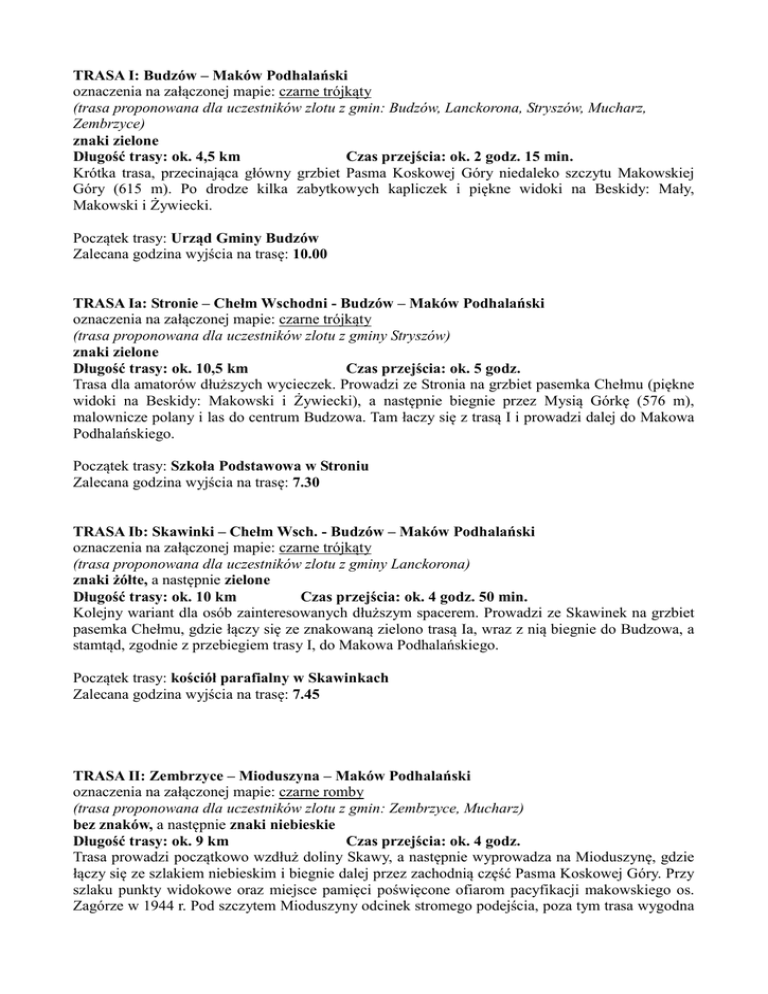 TRASA I: Budzów – Maków Podhalański oznaczenia na załączonej mapie: czarne trójkąty (trasa proponowana dla uczestników zlotu z gmin: Budzów, Lanckorona, Stryszów, Mucharz, Zembrzyce) znaki zielone Długość trasy: ok. 4,5 km Czas przejścia: ok. 2 godz. 15 min. Krótka trasa, przecinająca główny grzbiet Pasma Koskowej Góry niedaleko szczytu Makowskiej Góry (615 m). Po drodze kilka zabytkowych kapliczek i piękne widoki na Beskidy: Mały, Makowski i Żywiecki. Początek trasy: Urząd Gminy Budzów Zalecana godzina wyjścia na trasę: 10.00 TRASA Ia: Stronie – Chełm Wschodni - Budzów – Maków Podhalański oznaczenia na załączonej mapie: czarne trójkąty (trasa proponowana dla uczestników zlotu z gminy Stryszów) znaki zielone Długość trasy: ok. 10,5 km Czas przejścia: ok. 5 godz. Trasa dla amatorów dłuższych wycieczek. Prowadzi ze Stronia na grzbiet pasemka Chełmu (piękne widoki na Beskidy: Makowski i Żywiecki), a następnie biegnie przez Mysią Górkę (576 m), malownicze polany i las do centrum Budzowa. Tam łaczy się z trasą I i prowadzi dalej do Makowa Podhalańskiego. Początek trasy: Szkoła Podstawowa w Stroniu Zalecana godzina wyjścia na trasę: 7.30 TRASA Ib: Skawinki – Chełm Wsch. - Budzów – Maków Podhalański oznaczenia na załączonej mapie: czarne trójkąty (trasa proponowana dla uczestników zlotu z gminy Lanckorona) znaki żółte, a następnie zielone Długość trasy: ok. 10 km Czas przejścia: ok. 4 godz. 50 min. Kolejny wariant dla osób zainteresowanych dłuższym spacerem. Prowadzi ze Skawinek na grzbiet pasemka Chełmu, gdzie łączy się ze znakowaną zielono trasą Ia, wraz z nią biegnie do Budzowa, a stamtąd, zgodnie z przebiegiem trasy I, do Makowa Podhalańskiego. Początek trasy: kościół parafialny w Skawinkach Zalecana godzina wyjścia na trasę: 7.45 TRASA II: Zembrzyce – Mioduszyna – Maków Podhalański oznaczenia na załączonej mapie: czarne romby (trasa proponowana dla uczestników zlotu z gmin: Zembrzyce, Mucharz) bez znaków, a następnie znaki niebieskie Długość trasy: ok. 9 km Czas przejścia: ok. 4 godz. Trasa prowadzi początkowo wzdłuż doliny Skawy, a następnie wyprowadza na Mioduszynę, gdzie łączy się ze szlakiem niebieskim i biegnie dalej przez zachodnią część Pasma Koskowej Góry. Przy szlaku punkty widokowe oraz miejsce pamięci poświęcone ofiarom pacyfikacji makowskiego os. Zagórze w 1944 r. Pod szczytem Mioduszyny odcinek stromego podejścia, poza tym trasa wygodna i łagodna. Początek trasy: Rynek w Zembrzycach Zalecana godzina wyjścia na trasę: 8.15 TRASA IIa: Sucha Beskidzka – Mioduszyna – Maków Podhalański oznaczenia na załączonej mapie: czarne romby (trasa proponowana dla uczestników zlotu z gmin: Sucha Beskidzka, Stryszawa, Koszarawa) bez znaków, a następnie znaki niebieskie Długość trasy: ok. 8,5 km Czas przejścia: ok. 3 godz 45 min. Trasa prowadzi początkowo przez os. Garce i Śpiwle, łączy się z trasą II, wraz z nią wyprowadza na Mioduszynę (odcinek stromego podejścia) i dalej biegnie szlakiem niebieskim do Makowa Podhalańskiego. Uwaga! Istnieje możliwość, aby z Suchej Beskidzkiej iść na Mioduszynę cały czas szlakiem niebieskim, przez os. Dział Makowski i w ten sposób ominąć odcinek najostrzejszego podejścia, jednak szlak ten na pewnym odcinku jest obecnie bardzo zarośnięty i niewygodny. Początek trasy: Rynek w Suchej Beskidzkiej Zalecana godzina wyjścia na trasę: 8.30 TRASA III: Zawoja Przysłop – Ostra Góra – Grzechynia – Maków Podhalański oznaczenia na załączonej mapie: czarne kwadraty (trasa proponowana dla uczestników zlotu z gmin: Zawoja, Stryszawa, Koszarawa, Bystra-Sidzina, m. Jordanów, Jabłonka, Lipnica Wielka) znaki czerwone, a następnie niebieskie Długość trasy: ok. 10 km Czas przejścia: ok. 4 godz. 15 min. Piękna, nietrudna, a równocześnie bardzo widokowa trasa. Prowadzi z położonej na styku gmin: Zawoja, Stryszawa i Maków Podhalański grupy osiedli Przysłop, początkowo wschodnimi stokami Magurki (872 m), a następnie wzdłuż grzbietu Ostrej Góry (565 m) i przez wieś Grzechynię. Po drodze wspaniałe panoramy – najpierw na Babią Górę, Pasmo Polic i Pasmo Jałowieckie, a następnie – Beskidy: Mały i Makowski oraz dolinę Skawy z Suchą Beskidzką i Makowem Podhalańskim. Początek trasy: Skrzyżowanie przy remizie OSP Zawoja Przysłop, w pobliżu szkoły podstawowej Zalecana godzina wyjścia na trasę: 8.00 TRASA IIIa: Sucha Beskidzka – Ostra Góra – Grzechynia – Maków Podhalański oznaczenia na załączonej mapie: czarne kwadraty (trasa proponowana dla uczestników zlotu z gmin: Sucha Beskidzka, Stryszawa, Koszarawa) bez znaków, a następnie znaki czerwone i niebieskie Długość trasy: ok. 10,5 km Czas przejścia: ok. 4 godz. 30 min. Trasa prowadzi z centrum Suchej Beskidzkiej do os. Górne Podksięże, gdzie łączy się ze szlakiem czerwonym, który doprowadza z kolei do szlaku niebieskiego na stoku Magurki (872 m). Tu połączenie z trasą III, która dalej prowadzi wzdłuż grzbietu Ostrej Góry (565 m) i przez wieś Grzechynię do Makowa Podhalańskiego. Początek trasy: Rynek w Suchej Beskidzkiej Zalecana godzina wyjścia na trasę: 7.45 TRASA IV (spacerowa): Sucha Beskidzka – Maków Podhalański oznaczenia na załączonej mapie: czarne kółka (trasa proponowana dla uczestników zlotu z wszystkich gmin) bez znaków Długość trasy: ok. 6,5 km Czas przejścia: ok. 2 godz. 45 min. Spacerowa trasa, prowadząca lokalną drogą asfaltową wzdłuż doliny Skawy, po jej płd. stronie. Dogodna dla każdego, kto – z różnych względów – nie zdecyduje się na którąkolwiek z tras górskich. Początek trasy: Rynek w Suchej Beskidzkiej Zalecana godzina wyjścia na trasę: 9.45