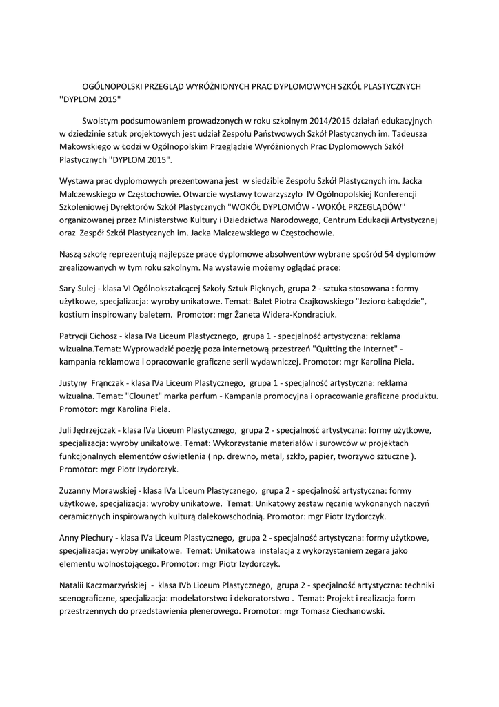 OGÓLNOPOLSKI PRZEGLĄD WYRÓŻNIONYCH PRAC DYPLOMOWYCH SZKÓŁ PLASTYCZNYCH ''DYPLOM 2015" Swoistym podsumowaniem prowadzonych w roku szkolnym 2014/2015 działań edukacyjnych w dziedzinie sztuk projektowych jest udział Zespołu Państwowych Szkół Plastycznych im. Tadeusza Makowskiego w Łodzi w Ogólnopolskim Przeglądzie Wyróżnionych Prac Dyplomowych Szkół Plastycznych "DYPLOM 2015". Wystawa prac dyplomowych prezentowana jest w siedzibie Zespołu Szkół Plastycznych im. Jacka Malczewskiego w Częstochowie. Otwarcie wystawy towarzyszyło IV Ogólnopolskiej Konferencji Szkoleniowej Dyrektorów Szkół Plastycznych "WOKÓŁ DYPLOMÓW - WOKÓŁ PRZEGLĄDÓW" organizowanej przez Ministerstwo Kultury i Dziedzictwa Narodowego, Centrum Edukacji Artystycznej oraz Zespół Szkół Plastycznych im. Jacka Malczewskiego w Częstochowie. Naszą szkołę reprezentują najlepsze prace dyplomowe absolwentów wybrane spośród 54 dyplomów zrealizowanych w tym roku szkolnym. Na wystawie możemy oglądać prace: Sary Sulej - klasa VI Ogólnokształcącej Szkoły Sztuk Pięknych, grupa 2 - sztuka stosowana : formy użytkowe, specjalizacja: wyroby unikatowe. Temat: Balet Piotra Czajkowskiego "Jezioro Łabędzie", kostium inspirowany baletem. Promotor: mgr Żaneta Widera-Kondraciuk. Patrycji Cichosz - klasa IVa Liceum Plastycznego, grupa 1 - specjalność artystyczna: reklama wizualna.Temat: Wyprowadzić poezję poza internetową przestrzeń "Quitting the Internet" kampania reklamowa i opracowanie graficzne serii wydawniczej. Promotor: mgr Karolina Piela. Justyny Frąnczak - klasa IVa Liceum Plastycznego, grupa 1 - specjalność artystyczna: reklama wizualna. Temat: "Clounet" marka perfum - Kampania promocyjna i opracowanie graficzne produktu. Promotor: mgr Karolina Piela. Juli Jędrzejczak - klasa IVa Liceum Plastycznego, grupa 2 - specjalność artystyczna: formy użytkowe, specjalizacja: wyroby unikatowe. Temat: Wykorzystanie materiałów i surowców w projektach funkcjonalnych elementów oświetlenia ( np. drewno, metal, szkło, papier, tworzywo sztuczne ). Promotor: mgr Piotr Izydorczyk. Zuzanny Morawskiej - klasa IVa Liceum Plastycznego, grupa 2 - specjalność artystyczna: formy użytkowe, specjalizacja: wyroby unikatowe. Temat: Unikatowy zestaw ręcznie wykonanych naczyń ceramicznych inspirowanych kulturą dalekowschodnią. Promotor: mgr Piotr Izydorczyk. Anny Piechury - klasa IVa Liceum Plastycznego, grupa 2 - specjalność artystyczna: formy użytkowe, specjalizacja: wyroby unikatowe. Temat: Unikatowa instalacja z wykorzystaniem zegara jako elementu wolnostojącego. Promotor: mgr Piotr Izydorczyk. Natalii Kaczmarzyńskiej - klasa IVb Liceum Plastycznego, grupa 2 - specjalność artystyczna: techniki scenograficzne, specjalizacja: modelatorstwo i dekoratorstwo . Temat: Projekt i realizacja form przestrzennych do przedstawienia plenerowego. Promotor: mgr Tomasz Ciechanowski. Klaudii Sierant - klasa IVb Liceum Plastycznego, grupa 2 - specjalność artystyczna: techniki scenograficzne, specjalizacja : modelatorstwo i dekoratorstwo . Temat : Projekt rekwizytu teatralno filmowego inspirowanego witrażem. Promotor: mgr Tomasz Ciechanowski. Miło nam stwierdzić, że prezentowane prace naszych absolwentów spotkały się z niezwykle ciepłym przyjęciem oglądających wystawę przedstawicieli Ministerstwa Kultury i Dziedzictwa Narodowego, Centrum Edukacji Artystycznej, Dyrektorów Szkół Plastycznych , pedagogów i uczniów. Cieszymy się z możliwości ekspozycji i prezentacji dyplomów, przybliżenia specyfiki i specjalizacji naszej szkoły oraz okazji do wymiany poglądów, myśli artystycznych, projektowych oraz konfrontacji z innymi placówkami w Polsce. Pragniemy podziękować organizatorom za wszelką pomoc przy realizacji naszej prezentacji. Autorami aranżacji wystawy są promotorzy - mgr Karolina Piela i mgr Tomasz Ciechanowski.
