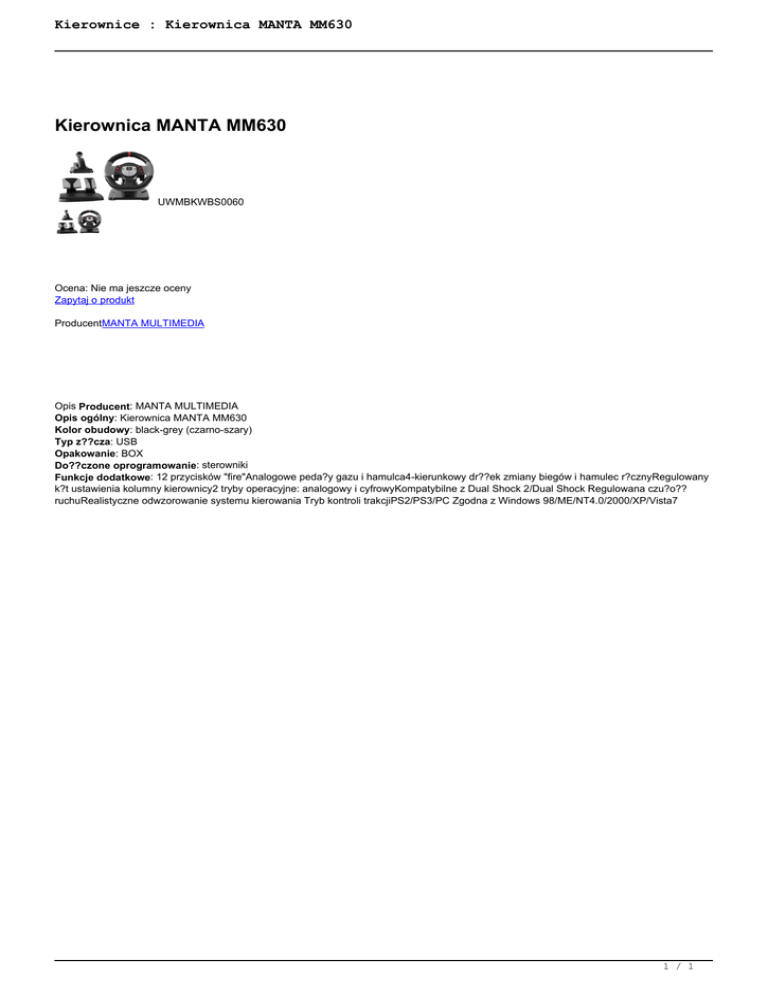 Kierownice : Kierownica MANTA MM630 Kierownica MANTA MM630 UWMBKWBS0060 Ocena: Nie ma jeszcze oceny Zapytaj o produkt ProducentMANTA MULTIMEDIA Opis Producent: MANTA MULTIMEDIA Opis ogólny: Kierownica MANTA MM630 Kolor obudowy: black-grey (czarno-szary) Typ z??cza: USB Opakowanie: BOX Do??czone oprogramowanie: sterowniki Funkcje dodatkowe: 12 przycisków "fire"Analogowe peda?y gazu i hamulca4-kierunkowy dr??ek zmiany biegów i hamulec r?cznyRegulowany k?t ustawienia kolumny kierownicy2 tryby operacyjne: analogowy i cyfrowyKompatybilne z Dual Shock 2/Dual Shock Regulowana czu?o?? ruchuRealistyczne odwzorowanie systemu kierowania Tryb kontroli trakcjiPS2/PS3/PC Zgodna z Windows 98/ME/NT4.0/2000/XP/Vista7 1 / 1 Powered by TCPDF (www.tcpdf.org)