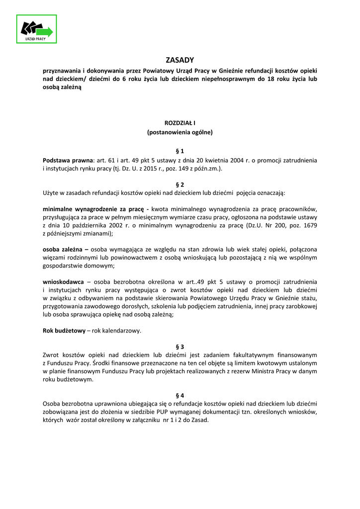 ZASADY przyznawania i dokonywania przez Powiatowy Urząd Pracy w Gnieźnie refundacji kosztów opieki nad dzieckiem/ dziećmi do 6 roku życia lub dzieckiem niepełnosprawnym do 18 roku życia lub osobą zależną ROZDZIAŁ I (postanowienia ogólne) §1 Podstawa prawna: art. 61 i art. 49 pkt 5 ustawy z dnia 20 kwietnia 2004 r. o promocji zatrudnienia i instytucjach rynku pracy (tj. Dz. U. z 2015 r., poz. 149 z późn.zm.). §2 Użyte w zasadach refundacji kosztów opieki nad dzieckiem lub dziećmi pojęcia oznaczają: minimalne wynagrodzenie za pracę - kwota minimalnego wynagrodzenia za pracę pracowników, przysługująca za prace w pełnym miesięcznym wymiarze czasu pracy, ogłoszona na podstawie ustawy z dnia 10 października 2002 r. o minimalnym wynagrodzeniu za pracę (Dz.U. Nr 200, poz. 1679 z późniejszymi zmianami); osoba zależna – osoba wymagająca ze względu na stan zdrowia lub wiek stałej opieki, połączona więzami rodzinnymi lub powinowactwem z osobą wnioskującą lub pozostającą z nią we wspólnym gospodarstwie domowym; wnioskodawca – osoba bezrobotna określona w art..49 pkt 5 ustawy o promocji zatrudnienia i instytucjach rynku pracy występująca o zwrot kosztów opieki nad dzieckiem lub dziećmi w związku z odbywaniem na podstawie skierowania Powiatowego Urzędu Pracy w Gnieźnie stażu, przygotowania zawodowego dorosłych, szkolenia lub podjęciem zatrudnienia, innej pracy zarobkowej lub osoba sprawująca opiekę nad osobą zależną; Rok budżetowy – rok kalendarzowy. §3 Zwrot kosztów opieki nad dzieckiem lub dziećmi jest zadaniem fakultatywnym finansowanym z Funduszu Pracy. Środki finansowe przeznaczone na ten cel objęte są limitem kwotowym ustalonym w planie finansowym Funduszu Pracy lub projektach realizowanych z rezerw Ministra Pracy w danym roku budżetowym. §4 Osoba bezrobotna uprawniona ubiegająca się o refundacje kosztów opieki nad dzieckiem lub dziećmi zobowiązana jest do złożenia w siedzibie PUP wymaganej dokumentacji tzn. określonych wniosków, których wzór został określony w załączniku nr 1 i 2 do Zasad. ROZDZIAŁ II (zasady dokonywania refundacji kosztów opieki nad dzieckiem lub dziećmi) §5 1. Powiatowy Urząd Pracy w Gnieźnie dokonuje refundacji kosztów opieki nad dzieckiem lub dziećmi w wysokości nie wyższej niż połowa zasiłku dla bezrobotnych określonego w art. 72 ust.1 pkt 1 ustawy o promocji zatrudnienia i instytucjach rynku pracy na każde dziecko, na opiekę którego poniesiono koszty jeżeli bezrobotny został skierowany na staż, przygotowanie zawodowe dorosłych, szkolenie , podejmie zatrudnienie lub inną pracę zarobkową. 2. Okres przyznawania refundacji uzależniony jest od okresu odbywania stażu, przygotowania zawodowego dorosłych, szkolenia lub w przypadku podjęcia zatrudnienia lub innej pracy zarobkowej przyznawany jest na okres do 6 m-cy. 3. Refundacja kosztów opieki nad dzieckiem lub dziećmi wypłacana jest za okres odbywania stażu, przygotowania zawodowego dorosłych, szkolenia lub w przypadku podjęcia zatrudnienia lub innej pracy zarobkowej pod warunkiem osiągania miesięcznie przychodu nieprzekraczającego minimalnego wynagrodzenia za pracę. 4. Refundacja kosztów opieki nad dzieckiem lub dziećmi nie jest świadczeniem obligatoryjnym. Wnioski rozpatrzone negatywnie nie podlegają procedurze odwoławczej. 5. Wniosek (załącznik nr 1) należy złożyć do końca miesiąca, w którym następuje rozpoczęcie określonej formy aktywizacji. 6. Rozliczenie kosztów opieki nad dzieckiem lub dziećmi następuje po złożeniu wniosku (załącznik nr 2) do Zasad. Bezrobotny uprawniony ma obowiązek złożyć ww. wniosek do 15 –go dnia kalendarzowego następującego po miesiącu, którego koszty dotyczą. 7. Do rozliczenia należy dołączyć: a/ rachunki/ faktury potwierdzające wysokość poniesionych kosztów z tytułu opieki nad dzieckiem lub dziećmi b/kopia aktu urodzenia do wglądu c/ inne dodatkowe dokumenty niezbędne do rozpatrzenia rozliczenia na żądanie Urzędu. 8. O przyznaniu lub odmowie refundacji kosztów opieki nad dzieckiem lub dziećmi Powiatowy Urząd Pracy w Gnieźnie zawiadamia wnioskodawcę pisemnie w terminie 30 dni od dnia złożenia wniosku. 9. W przypadku refundacji za niepełny miesiąc, kwota refundacji naliczona jest proporcjonalnie do okresu, za który przysługuje refundacja. Kwotę refundacji ustala się dzieląc wysokość refundacji przez 30 i mnożąc przez liczbę dni kalendarzowych, za które przysługuje refundacja 10.W przypadku braku środków w zakreślonym terminie, PUP zastrzega możliwość wypłaty refundacji w terminie późniejszym bez odsetek. Refundacja dokonywana jest na rachunek osobisty wnioskodawcy. 11.Bezrobotny zobowiązany jest do zwrotu wypłaconej refundacji w związku z poniesionymi kosztami opieki nad dzieckiem w przypadku przerwania z własnej winy stażu, przygotowania zawodowego dorosłych, szkolenia. 12. Wzory wniosków dostępne w pok.13 parter Powiatowego Urzędu Pracy w Gnieźnie lub stronie internetowej urzędu ( www.pup-gniezno.pl). 13.Wnioski wraz z kompletem dokumentów składa się w punkcie informacyjnym Powiatowego Urzędu Pracy w Gnieźnie. §6 Refundacja kosztów opieki nad osobą zależną następuje na zasadach określonych w §1-5.