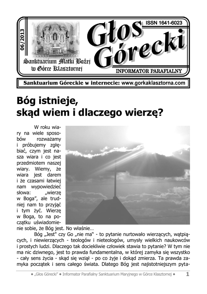 06/2013 Bóg istnieje, skąd wiem i dlaczego wierzę? W roku wiary na wiele sposobów rozważamy i próbujemy zgłębiać, czym jest nasza wiara i co jest przedmiotem naszej wiary. Wiemy, że wiara jest darem i że czasami łatwiej nam wypowiedzieć słowa: „wierzę w Boga”, ale trudniej nam to przyjąć i tym żyć. Wierzę w Boga, to na początku uświadomienie sobie, że Bóg jest. No właśnie… Bóg „Jest" czy Go „nie ma“ - to pytanie nurtowało wierzących, wątpiących, i niewierzących - teologów i nieteologów, umysły wielkich naukowców i prostych ludzi. Dlaczego tak dociekliwie człowiek stawia to pytanie? W tym nie ma nic dziwnego, jest to prawda fundamentalna, w której zamyka się wszystko - cały sens życia - skąd się wziął - po co żyje i dokąd zmierza. Ta prawda zamyka początek i sens całego świata. Dlatego Bóg jest najistotniejszym pyta• „Głos Górecki” • Informator Parafialny Sanktuarium Maryjnego w Górce Klasztornej • 1 niem człowieka, bo to pytanie staje się zarazem odpowiedzią na wszystkie inne pytania, jakie człowiek sobie stawia. I bez pozytywnej odpowiedzi na pytanie o Boga sam człowiek pozostanie dla siebie pytaniem bez odpowiedzi. Wtedy sens życia w ogóle, a zwłaszcza w trudnych chwilach, ostateczny cel człowieka pozostaje bez odpowiedzi. Alternatywą chrześcijańskiego wyznania: „Wierzę w Boga Ojca Wszechmogącego...“ jest „wyznanie wiary“, które leży u podstaw ateizmu: „Wierzę, że Boga nie ma...“. Ostatecznie człowiek „niewierzący w Boga" wierzy na swój sposób, ale dla niego bogiem mogą być pieniądze, sława, kariera, uroda, zdrowie… Na jakich drogach człowiek nie znajdzie Boga? Widzę, słyszę, dotykam, liczę, odmierzam, odczuwam... podziwiam. Oto całe bogactwo poznania zmysłowego, które ubogaca duchowo człowieka, wprawia w zdumienie, przestrach i zachwyt. Człowiek podziwia przyrodę i boi się przyrody. Ma jakiś naturalny szacunek przed jej potęgą i tajemnicą. Poznanie przez doświadczenie, przez nasze zmysły, może prowadzić do zdumienia i nawet zachwytu, ale nie może przebić zasłony, którą jest świat widzialny. Nawet gdyby człowiek wzniósł się ponad zasłonę ziemskiej atmosfery i znalazł się w „przestworzach niebieskich“ kosmosu, nie zobaczy i nie spotka tam Boga. „Byłem w niebie i nie spotkałem tam Pana Boga“ - miał powiedzieć triumfalnie kosmonauta radziecki J. Gagarin po powrocie z kosmosu. Z tego rodzaju poznania i zachwytu zmysłowego zrodził się później ateizm a nie wiara w jednego Boga, Stworzyciela nieba i ziemi! Boga nie można zobaczyć przez najpotężniejsze nawet teleskopy, usłyszeć przez najnowocześniejsze aparaty nasłuchowe, łowiące wszelkie fale z głębin wszechświata, nie można spotkać Go w kosmicznym niebie... Człowiek, który poznaje tajniki przyrody i zaczyna panować nad żywiołami nie buduje im już posągów, ani świątyń, bo to nie są już bogowie, a oprócz nich nie znalazł nigdzie Boga. Nie można więc Boga poznać na drodze poznania zmysłowego - widzę, dotykam, czuję, ważę, ponieważ poznanie zmysłowe jest tak dalece nieadekwatne do poznania Boga, jakby ktoś przyłożył palec do kwitnącej róży i dotykiem chciał stwierdzić, że kwiat pachnie. Nie można również udowodnić istnienia Boga w sensie dowodzenia, z jakim mamy do czynienia w naukach empirycznych. Bo jeśli w życiu ludzkim są wartości (jak np. miłość, prawdomówność, wierność, piękno, poczucie odpowiedzialności), które nie są możliwe do przyrodniczego pomiaru, zmierzenia i dowodzenia to tym bardziej wartości i istoty duchowe, jakim jest sam Bóg. cdn Ks. Kazimierz Świderski MSF Proboszcz 2 • „Głos Górecki” • Informator Parafialny Sanktuarium Maryjnego w Górce Klasztornej • Sprzątanie kościoła WIKTORÓWKO – 07 czerwca, godz. 13.00: Krawczyk, Stachowiak, Piskuła i Ciepłuch. 14 czerwca , godz. 13.00: Białczyk, Polachowski, Łabenta i Kotarak. 21 czerwca, godz. 13.00: Wagner Jerzy, Wagner Piotr, Pietrykowski i Marlewski. PIESNO 28 czerwca, godz. 13.00: Kisiel, Wunsz, Piszczek i Fąs. Ogłoszenia duszpasterskie 1. W sobotę rozpoczynamy miesiąc czerwiec - miesiąc poświęcony czci Najświętszego Serca Pana Jezusa. W naszej świątyni nabożeństwa do Najświętszego Serca Pana Jezusa odprawiane będą codziennie o godz. 18.00, a po nich wieczorna Msza św. 2. 1 czerwca przeżywać będziemy pierwszą sobotę miesiąca. W tym dniu kontynuujemy praktykę modlitw wynagradzających Niepokalanemu Sercu Maryi. Czuwanie rozpocznie Msza wieczorna o godz. 18.00, a zakończy je Apel Maryjny. Zapraszamy do licznego udziału w tej modlitwie wynagradzającej. 3. 1 czerwca przypada także Międzynarodowy Dzień Dziecka. W tym dniu w sposób szczególny chcemy w naszych modlitwach pamiętać o dzieciach, by nie brakło im miłości i ciepła rodzicielskiego serca, by mogły wzrastać w pokoju i bezpieczeństwie. 4. Dnia 5 czerwca w liturgii wspominamy św. Bonifacego, biskupa i męczennika. • „Głos Górecki” • Informator Parafialny Sanktuarium Maryjnego w Górce Klasztornej • 3 5. Do 6 czerwca, czyli do I czwartku miesiąca trwać będzie Oktawa Bożego Ciała. W tych dniach wieczorem o 18.00 Litania do Serca Pana Jezusa, procesja wokół studzienki a następnie Msza św. Natomiast na zakończenie Oktawy, czyli w czwartek będzie procesja po gaju i poświęcenie wianków. 6. W piątek, 7 czerwca, obchodzić będziemy Uroczystość Najświętszego Serca Pana Jezusa. Za pobożne i publiczne odmówienie w tym dniu Aktu Wynagrodzenia Najświętszemu Sercu Pana Jezusa można dostąpić odpustu zupełnego pod zwykłymi warunkami. Jest to również Światowy Dzień Modlitw o Uświęcenie Kapłanów. Tego dnia nie obowiązuje wstrzemięźliwość od potraw mięsnych i zakaz udziału w zabawach hucznych. 7. W I piątkek miesiąca od godziny 8.00 odwiedzimy chorych z posługą sakramentalną. 8. W sobot