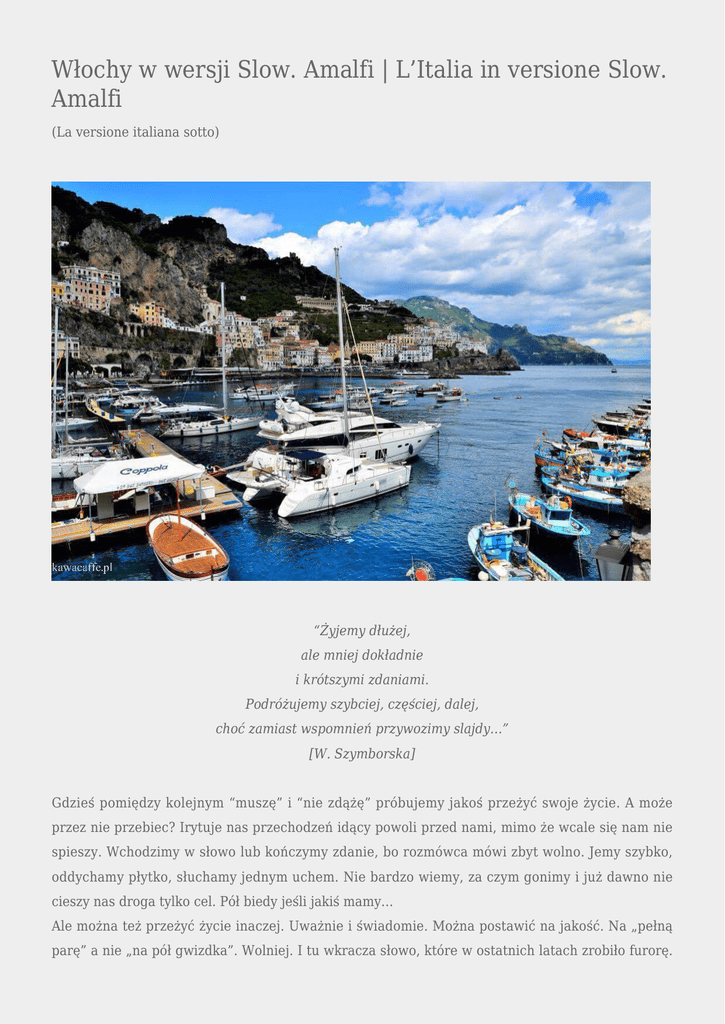 Włochy w wersji Slow. Amalfi | L’Italia in versione Slow. Amalfi (La versione italiana sotto) “Żyjemy dłużej, ale mniej dokładnie i krótszymi zdaniami. Podróżujemy szybciej, częściej, dalej, choć zamiast wspomnień przywozimy slajdy…” [W. Szymborska] Gdzieś pomiędzy kolejnym “muszę” i “nie zdążę” próbujemy jakoś przeżyć swoje życie. A może przez nie przebiec? Irytuje nas przechodzeń idący powoli przed nami, mimo że wcale się nam nie spieszy. Wchodzimy w słowo lub kończymy zdanie, bo rozmówca mówi zbyt wolno. Jemy szybko, oddychamy płytko, słuchamy jednym uchem. Nie bardzo wiemy, za czym gonimy i już dawno nie cieszy nas droga tylko cel. Pół biedy jeśli jakiś mamy… Ale można też przeżyć życie inaczej. Uważnie i świadomie. Można postawić na jakość. Na „pełną parę” a nie „na pół gwizdka”. Wolniej. I tu wkracza słowo, które w ostatnich latach zrobiło furorę. Slow. Wszystko zaczęło się od powstałego we Włoszech ruchu Slow Food. Jego zwolennicy stawiają na zdrowe jedzenie przygotowywane od podstaw z lokalnych produktów, na spożywanie posiłków w spokoju, celebrowanie chwili z najbliższymi. Pomysł dotyczący jedzenia przeniósł się z czasem na inne dziedziny- podróże, edukację, modę. Mało kto wie, że Italia to nie tylko ojczyzna ruchu Slow Food, ale także Cittàslow czyli Międzynarodowej Sieci Miast Dobrego Życia powstałej w 1999 roku. Cittàslow zrzesza miasta liczące mniej niż 50 tys. mieszkańców, spełniające określone kryteria dotyczące ochrony środowiska, infrastruktury, ochrony lokalnych produktów i poszanowania tradycji. Jak piszą sami członkowie „Życie w jednym z miast SLOW to danie sobie czasu na stworzenie jakości we wszystkich dziedzinach życia miejskiego, spowolnienie rytmu życia i zredukowanie napięć, aby uzmysłowić sobie teraz i na zawsze wartość smaków, kolorów, zapachów miasta i świata”. Co powiecie na to, by, przy okazji kolejnego wyjazdu do Włoch, wstąpić do jednego z takich miast? A może stworzycie własną trasę po Miastach Dobrego Życia? Jest w czym wybierać, bo aktualnie na włoskiej liście znajduje się 80 miejsc. Co jak co, ale Italia nadaje się doskonale do ćwiczenia uważności i celebrowania chwil;) Mimo że „cudze” chwalimy to „swoje” też chcemy znać, dlatego nie możemy nie wspomnieć, że ruch Cittàslow działa też w Polsce i obecnie zrzesza 25 miast. Jeśli więc Włochy Wam nie po drodze, pomyślcie o odkrywaniu zakątków naszego kraju. Strona Cittàslow: http://www.cittaslow.org/index.php?lng=1 Na koniec zapraszamy Was do Amalfi, jednego z miast Cittàslow w regionie Kampania: L’Italia in versione Slow. Amalfi Da qualche parte, tra un “devo” e un “non ho tempo”, proviamo a vivere la nostra vita. O forse solo corriamo attraverso il percorso della nostra vita? Ci fa arrabbiare un pedone che cammina lentamente davanti a noi anche se non andiamo di fretta. Interrompiamo o finiamo la sua frase solo perché il nostro interlocutore parla troppo piano. Mangiamo velocemente, respiriamo leggermente, ascoltiamo senza attenzione. Non sappiamo che cosa vogliamo seguire e da molto tempo ci piace perseguire solo il nostro scopo e non ci interessa il modo per raggiungerlo, sempre se ne abbiamo uno di scopo… Però si può vivere la vita in modo diverso. Con attenzione e consapevolezza. Si può scegliere la qualità, vivendo bene e non in modo mediocre. Più lentamente. E qua ci viene in mente una parola molto famosa negli ultimi anni: Slow. Tutto è cominciato dal movimento Slow Food creato in Italia. I suoi amanti scelgono il cibo sano preparato in base a prodotti locali, mangiano con calma e celebrano il tempo trascorso con gli altri commensali. L’idea legata al cibo si è diffusa in campi diversi- i viaggi, l’educazione, la moda. Non tutti sanno che l’Italia non è solo la patria del movimento Slow Food, ma anche di Cittàslow, cioè della Rete internazionale delle città del buon vivere creata nel 1999. Cittàslow raggruppa le città con meno di 50 mila di abitanti in base ad alcuni criteri legati alla protezione dell’ambiente, le infrastrutture, la protezione dei prodotti locali e il rispetto per la tradizione. Come scrivono i suoi membri: „Vivere in una città SLOW vuol dire donare il proprio tempo per favorire la qualità in tutti i campi della vita cittadina, rallentare il trantran della vita quotidiana e ridurre le tensioni per capire ora e per sempre la qualità dei sapori, dei colori, dei profumi delle città e del mondo”. Che ne dite di visitare una di queste città quando sarete in Italia la prossima volta? Farete il vostro programma „sulle tracce delle città del buon vivere”? La scelta è abbondante perché per ora nella lista italiana ci sono 80 posti. L’Italia è un paese perfetto per praticare l’attenzione e celebrate l’attimo, vero? ;) Anche se lodiamo i posti degli altri paesi, vogliamo conoscere anche i nostri posti: per questo motivo dobbiamo dire che il movimento Cittàslow è presente anche in Polonia e per ora raggruppa 25 città. Se non potete allora andare in Italia, pensate a scoprire dei posti nuovi nel nostro paese. Il sito di Cittàslow: http://www.cittaslow.org/index.php?lng=1 Per finire vi invitiamo a Amalfi, una delle città slow in Campania: