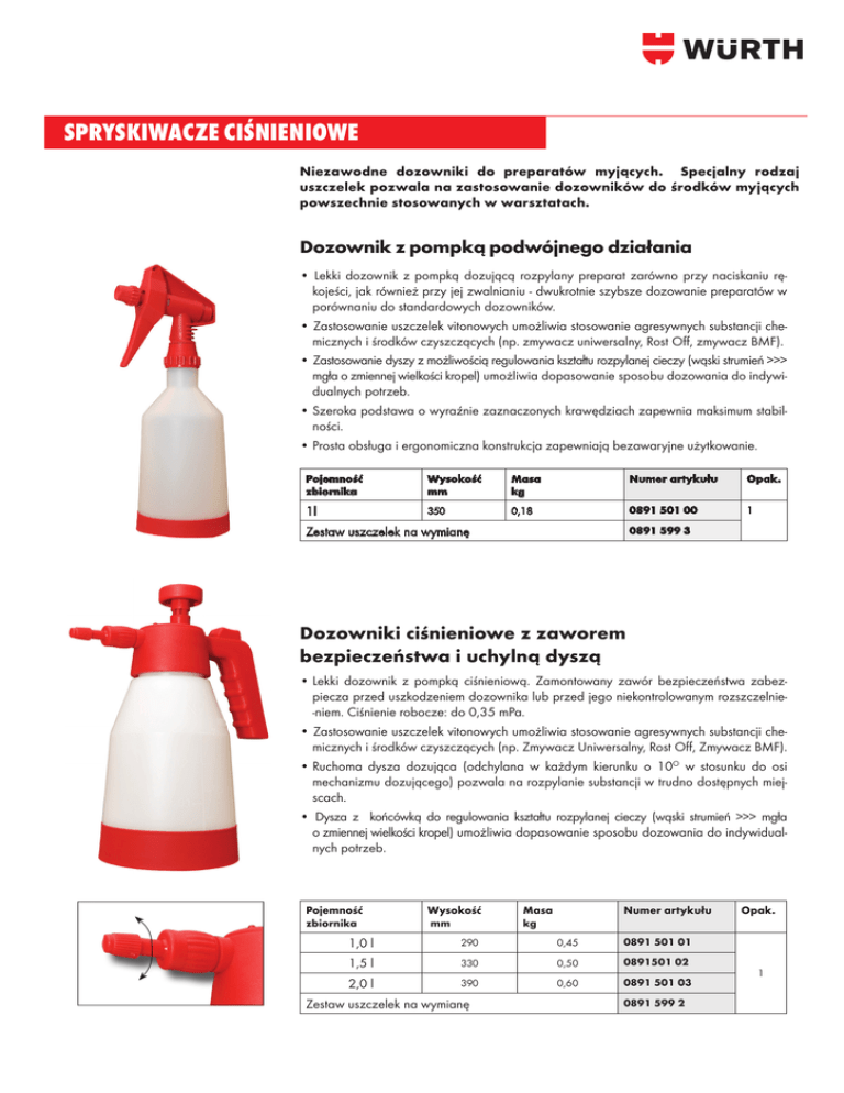 SPRYSKIWACZE CIŚNIENIOWE Niezawodne dozowniki do preparatów myjących. Specjalny rodzaj uszczelek pozwala na zastosowanie dozowników do środków myjących powszechnie stosowanych w warsztatach. Dozownik z pompką podwójnego działania • Lekki dozownik z pompką dozującą rozpylany preparat zarówno przy naciskaniu rękojeści, jak również przy jej zwalnianiu - dwukrotnie szybsze dozowanie preparatów w porównaniu do standardowych dozowników. • Zastosowanie uszczelek vitonowych umożliwia stosowanie agresywnych substancji chemicznych i środków czyszczących (np. zmywacz uniwersalny, Rost Off, zmywacz BMF). • Zastosowanie dyszy z możliwością regulowania kształtu rozpylanej cieczy (wąski strumień >>> mgła o zmiennej wielkości kropel) umożliwia dopasowanie sposobu dozowania do indywidualnych potrzeb. • Szeroka podstawa o wyraźnie zaznaczonych krawędziach zapewnia maksimum stabilności. • Prosta obsługa i ergonomiczna konstrukcja zapewniają bezawaryjne użytkowanie. Pojemność zbiornika Wysokość mm Masa kg Numer artykułu Opak. 1l 350 0,18 0891 501 00 1 Zestaw uszczelek na wymianę 0891 599 3 Dozowniki ciśnieniowe z zaworem bezpieczeństwa i uchylną dyszą • Lekki dozownik z pompką ciśnieniową. Zamontowany zawór bezpieczeństwa zabezpiecza przed uszkodzeniem dozownika lub przed jego niekontrolowanym rozszczelnie-niem. Ciśnienie robocze: do 0,35 mPa. • Zastosowanie uszczelek vitonowych umożliwia stosowanie agresywnych substancji chemicznych i środków czyszczących (np. Zmywacz Uniwersalny, Rost Off, Zmywacz BMF). • Ruchoma dysza dozująca (odchylana w każdym kierunku o 10O w stosunku do osi mechanizmu dozującego) pozwala na rozpylanie substancji w trudno dostępnych miejscach. • Dysza z końcówką do regulowania kształtu rozpylanej cieczy (wąski strumień >>> mgła o zmiennej wielkości kropel) umożliwia dopasowanie sposobu dozowania do indywidualnych potrzeb. Pojemność zbiornika Wysokość mm Masa kg Numer artykułu 1,0 l 290 0,45 0891 501 01 1,5 l 330 0,50 0891501 02 2,0 l 390 0,60 0891 501 03 Zestaw uszczelek na wymianę 0891 599 2 Opak. 1
