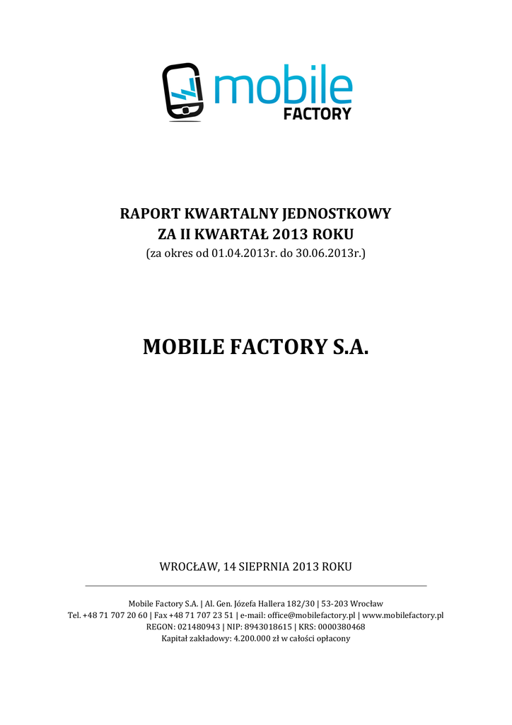 RAPORT KWARTALNY JEDNOSTKOWY ZA II KWARTAŁ 2013 ROKU (za okres od 01.04.2013r. do 30.06.2013r.) MOBILE FACTORY S.A. WROCŁAW, 14 SIEPRNIA 2013 ROKU Mobile Factory S.A. | Al. Gen. Józefa Hallera 182/30 | 53-203 Wrocław Tel. +48 71 707 20 60 | Fax +48 71 707 23 51 | e-mail: [email protected] | www.mobilefactory.pl REGON: 021480943 | NIP: 8943018615 | KRS: 0000380468 Kapitał zakładowy: 4.200.000 zł w całości opłacony SPIS TREŚCI: 1 Wstęp................................................................................................................................................................................ 3 2 Podstawowe dane o Emitencie ......................................................................................................................................... 3 Tabela: Podstawowe dane o Emitencie ..................................................................................................................................... 3 3 Kapitał zakładowy ............................................................................................................................................................. 4 4 Informacja o strukturze akcjonariatu emitenta, ze wskazaniem akcjonariuszy posiadających, na dzień publikacji raportu, co najmniej 5% głosów na Walnym Zgromadzeniu ...................................................................................................... 4 Tabela: Struktura akcjonariatu ................................................................................................................................................... 4 Wykres: Struktura akcjonariatu .................................................................................................................................................. 5 5 Wybrane dane finansowe z bilansu oraz rachunku zysków i strat.................................................................................... 5 Tabela: Wybrane dane z bilansu ................................................................................................................................................ 6 Tabela: Wybrane dane z rachunku zysków i strat ...................................................................................................................... 6 6 Dodatkowe dane, jeżeli ich uwzględnienie w raporcie kwartalnym jest konieczne dla przedstawienia aktualnej sytuacji majątkowej i finansowej emitenta w sposób rzetelny i kompletny .............................................................................................. 7 7 Komentarz Zarządu na temat czynników i zdarzeń, które miały wpływ na osiągnięte wyniki finansowe ......................... 7 8 Informacja Zarządu na temat aktywności, jaką podejmował w okresie objętym raportem, w obszarze rozwoju prowadzonej działalności ........................................................................................................................................................... 8 9 Stanowisko Zarządu Mobile Factory S.A. odnośnie możliwości realizowania publikowanych prognoz wyników na dany rok w świetle wyników zaprezentowanych w danym raporcie kwartalnym............................................................................... 11 10 Wskazanie jednostek wchodzących w skład grupy kapitałowej emitenta na ostatni dzień okresu objętego raportem kwartalnym ............................................................................................................................................................................... 11 11 W przypadku gdy Emitent tworzy Grupę Kapitałową i nie sporządza skonsolidowanych sprawozdań finansowych – wskazanie przyczyn niesporządzania takich sprawozdań ....................................................................................................... 12 12 Podsumowanie i oświadczenie Zarządu......................................................................................................................... 12 Mobile Factory S.A. Raport Kwartalny 2013Q2 Strona 2 1 Wstęp Przedstawione w niniejszym raporcie okresowym za II kwartał 2013 r. poniższe dane finansowe obejmują: okres od 01 kwietnia 2013 r. do 30 czerwca 2013 r., dane porównywalne za analogiczny okres 2012 r. 2 Podstawowe dane o Emitencie Tabela: Podstawowe dane o Emitencie Firma Mobile Factory S.A. Forma prawna Spółka Akcyjna Kraj Polska Siedziba Wrocław Adres Al. Gen. Józefa Hallera 182/30 | 53-203 Wrocław Numer KRS 0000380468 Oznaczenie Sądu Sąd Rejonowy dla Wrocławia-Fabrycznej VI Wydział Gospodarczy Krajowego Rejestru Sądowego REGON 021480943 NIP 8943018615 Telefon +48 71 707 20 60 Fax +48 71 707 23 51 E-mail [email protected] Strona internetowa www.mobilefactory.pl Źródło: Emitent Aktualny skład Zarządu: Katarzyna Czub – Członek Zarządu Mobile Factory S.A. Raport Kwartalny 2013Q2 Strona 3 Aktualny skład Rady Nadzorczej: Patryk Prelewicz - Przewodniczący Rady Nadzorczej Anna Mamrowicz - Wiceprzewodnicząca Rady Nadzorczej Michał Łączykowski - Członek Rady Nadzorczej Rafał Harasimowicz – Członek Rady Nadzorczej Mariusz Witkowski – Członek Rady Nadzorczej 3 Kapitał zakładowy Kapitał zakładowy Spółki składa się z 42.000.000 (słownie: czterdzieści dwa miliony) akcji, o wartości nominalnej 0,10 zł (słownie: dziesięć groszy) każda, w tym: a) 1.000.000 (słownie: milion) akcji zwykłych na okaziciela serii A, b) 200.000 (słownie: dwieście tysięcy) akcji zwykłych na okaziciela serii B, c) 200.000 (słownie: dwieście tysięcy) akcji zwykłych na okaziciela serii C, d) 150.000 (słownie: sto pięćdziesiąt tysięcy) akcji zwykłych na okaziciela serii D, e) 40.450.000 (słownie: czterdzieści milionów czterysta pięćdziesiąt tysięcy) akcji zwykłych na okaziciela serii E. 4 Informacja o strukturze akcjonariatu emitenta, ze wskazaniem akcjonariuszy posiadających, na dzień publikacji raportu, co najmniej 5% głosów na Walnym Zgromadzeniu Ta