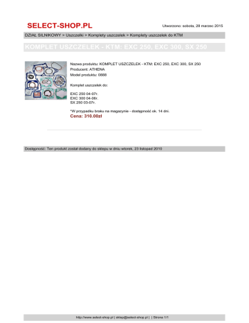 SELECT-SHOP.PL Utworzono: sobota, 28 marzec 2015 DZIAŁ SILNIKOWY > Uszczelki > Komplety uszczelek > Komplety uszczelek do KTM KOMPLET USZCZELEK - KTM: EXC 250, EXC 300, SX 250 Nazwa produktu: KOMPLET USZCZELEK - KTM: EXC 250, EXC 300, SX 250 Producent: ATHENA Model produktu: 0888 Komplet uszczelek do: EXC 250 04-07r. EXC 300 04-06r. SX 250 03-07r. *W przypadku braku na magazynie - dostępność ok. 14 dni. Cena: 310.00zł Dostępność: Ten produkt został dodany do sklepu w dniu wtorek, 23 listopad 2010 http://www.select-shop.pl | [email protected] | | Strona 1/1