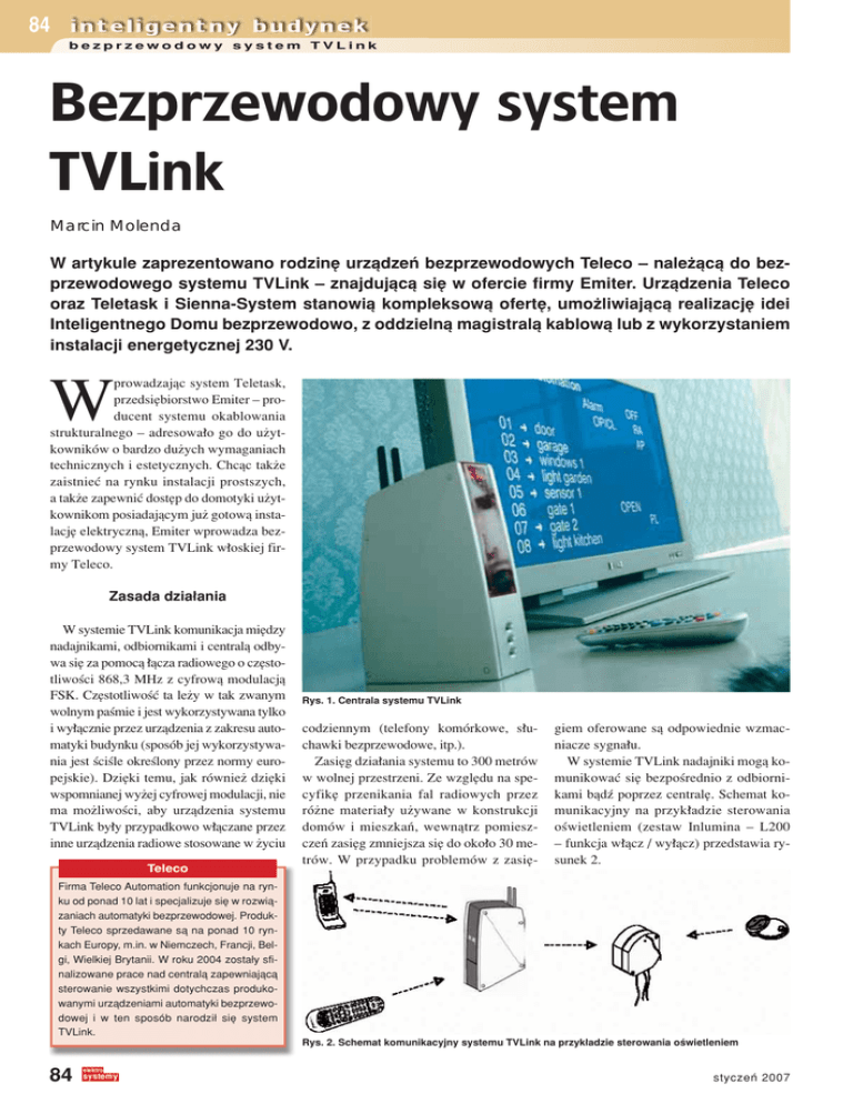 84 bezprzewodowy system TVLink Bezprzewodowy system TVLink Marcin Molenda W artykule zaprezentowano rodzinÍ urzπdzeÒ bezprzewodowych Teleco ñ naleøπcπ do bezprzewodowego systemu TVLink ñ znajdujπcπ siÍ w ofercie firmy Emiter. Urzπdzenia Teleco oraz Teletask i Sienna-System stanowiπ kompleksowπ ofertÍ, umoøliwiajπcπ realizacjÍ idei Inteligentnego Domu bezprzewodowo, z oddzielnπ magistralπ kablowπ lub z wykorzystaniem instalacji energetycznej 230 V. prowadzajπc system Teletask, przedsiÍbiorstwo Emiter ñ producent systemu okablowania strukturalnego ñ adresowa≥o go do uøytkownikÛw o bardzo duøych wymaganiach technicznych i estetycznych. Chcπc takøe zaistnieÊ na rynku instalacji prostszych, a takøe zapewniÊ dostÍp do domotyki uøytkownikom posiadajπcym juø gotowπ instalacjÍ elektrycznπ, Emiter wprowadza bezprzewodowy system TVLink w≥oskiej firmy Teleco. W Zasada dzia≥ania W systemie TVLink komunikacja miÍdzy nadajnikami, odbiornikami i centralπ odbywa siÍ za pomocπ ≥πcza radiowego o czÍstotliwoúci 868,3 MHz z cyfrowπ modulacjπ FSK. CzÍstotliwoúÊ ta leøy w tak zwanym wolnym paúmie i jest wykorzystywana tylko i wy≥πcznie przez urzπdzenia z zakresu automatyki budynku (sposÛb jej wykorzystywania jest úciúle okreúlony przez normy europejskie). DziÍki temu, jak rÛwnieø dziÍki wspomnianej wyøej cyfrowej modulacji, nie ma moøliwoúci, aby urzπdzenia systemu TVLink by≥y przypadkowo w≥πczane przez inne urzπdzenia radiowe stosowane w øyciu Teleco Rys. 1. Centrala systemu TVLink codziennym (telefony komÛrkowe, s≥uchawki bezprzewodowe, itp.). ZasiÍg dzia≥ania systemu to 300 metrÛw w wolnej przestrzeni. Ze wzglÍdu na specyfikÍ przenikania fal radiowych przez rÛøne materia≥y uøywane w konstrukcji domÛw i mieszkaÒ, wewnπtrz pomieszczeÒ zasiÍg zmniejsza siÍ do oko≥o 30 metrÛw. W przypadku problemÛw z zasiÍ- giem oferowane sπ odpowiednie wzmacniacze sygna≥u. W systemie TVLink nadajniki mogπ komunikowaÊ siÍ bezpoúrednio z odbiornikami bπdü poprzez centralÍ. Schemat komunikacyjny na przyk≥adzie sterowania oúwietleniem (zestaw Inlumina ñ L200 ñ funkcja w≥πcz / wy≥πcz) przedstawia rysunek 2. Firma Teleco Automation funkcjonuje na rynku od ponad 10 lat i specjalizuje siÍ w rozwiπzaniach automatyki bezprzewodowej. Produkty Teleco sprzedawane sπ na ponad 10 rynkach Europy, m.in. w Niemczech, Francji, Belgi, Wielkiej Brytanii. W roku 2004 zosta≥y sfinalizowane prace nad centralπ zapewniajπcπ sterowanie wszystkimi dotychczas produkowanymi urzπdzeniami automatyki bezprzewodowej i w ten sposÛb narodzi≥ siÍ system TVLink. Rys. 2. Schemat komunikacyjny systemu TVLink na przyk≥adzie sterowania oúwietleniem 84 styczeÒ 2007 bezprzewodowy system TVLink Rys. 3. Nadajniki systemu TVLink, od lewej: bezprzewodowy termostat, piloty, nadajnik úcienny z wyúwietlaczem i zegarem Produkty Teleco oferuje szeroki zakres produktÛw dla ca≥kowitej integracji urzπdzeÒ elektrycznych i systemÛw w domu. Elementy systemu moøna podzieliÊ na cztery grupy: ï nadajniki, ï odbiorniki, ï centrale, ï urzπdzenia pomocnicze. Nadajniki to wszelkiego rodzaju bezprzewodowe w≥πczniki klawiszowe, piloty, bezprzewodowe termostaty do zdalnego sterowania i pomiaru temperatury, bezprzewodowe czujki PIR, kontaktrony i detektory gazu. Odbiorniki to z kolei grupa urzπdzeÒ wykonawczych, na ktÛrπ sk≥adajπ siÍ aparaty do sterowania oúwietleniem montowane w puszkach podtynkowych lub w rozdzielniach elektrycznych, odbiorniki sterujπce bramami i drzwiami, sterowniki rolet, markiz i øaluzji, odbiorniki do sterowania klimatyzacjπ i ogrzewaniem. Warto zauwaøyÊ, øe czeúÊ z nadajnikÛw i odbiornikÛw jest przystosowana do umieszczania na zewnπtrz budynkÛw ze wzglÍdu na podwyøszony poziom ochrony IP54. Urzπdzenia pomocnicze to z kolei wzmacniacze sygna≥u, bπdü tzw. nadajniko-obiorniki s≥uøπce do potwierdzania wykonania za86 dania. M A L K E R System TVLink kierowany jest zarÛwno do nowych, jak i istniejπcych instalacji. SzczegÛlnie dobrze sprawdza siÍ w domach i mieszkaniach, gdzie nie ma moøliwoúci instalowania nowego systemu magistralowego lub jest to k≥opotliwe bπdü nieop≥acalne. Zaletπ systemu jest teø jego modu≥owoúÊ. Koncepcja ta sprawia, øe instalacjÍ moøna przystosowaÊ do aktualnych moøliwoúci finansowych klienta i rozpoczπÊ budowÍ systemu z minimalnπ kontrolπ i integracjπ, a kiedy wymagania techniczne wzrosnπ, zmiana polegaÊ bÍdzie jedynie na dodawaniu kolejnych urzπdzeÒ realizujπcych nowe funkcje. Prostota instalacji i obs≥ugi to kolejna zaleta, ktÛra w po≥πczeniu z moøliwoúciπ sterowania z dowolnego miejsca na úwiecie za poúrednictwem telefonu komÛrkowego oraz wizualizacji na ekranie telewizora w domu, pozwala nadaÊ instalacji øπdanπ inteligencjÍ. Uøytkownik systemu TVLink ma kontrolÍ nad wszystkim co dzieje siÍ jego domu. WymieniÊ naleøy tutaj nastÍpujπce obszary: ï sterowanie oúwietleniem budynku i otoczenia, ï zarzπdzanie ogrzewaniem i klimatyzacjπ, ï sterowanie roletami, øaluzjami i markizami, ï sterowanie bramami, ï funkcje alarmowe. Warto takøe podkreúliÊ unikalne zastosowania, takie jak np. kontrola szczelnoúci instalacji gazowej. A Koncepcja 86 bezprzewodowy system TVLink Rys. 4. Odbiorniki systemu TVLink, od lewej: miniaturowy odbiornik sterujπcy obciπøeniem do 1000 W montowany w puszce podtynkowej, odbiornik do sterowania oúwietleniem montowany na szynie TH, gniazdo do lamp Centrala 85 Sercem systemu TVLink jest centrala pod≥πczana do telewizora za pomocπ z≥πcza typu Scart. Firma Teleco oferuje trzy rodzaje central rÛøniπcych siÍ miÍdzy innymi moøliwoúciπ programowania czasowego (wbudowany zegar), wyposaøeniem w modu≥ GSM i wyposaøeniem w bateriÍ. Charakterystyczne cechy najmocniejszej wersji to: ï 32 wyjúcia (kontrolowane odbiorniki), ï 64 wejúcia (kana≥y nadajnik