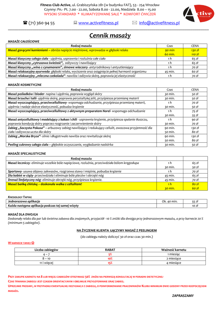 Fitness Club Active, ul. Grabiszyńska 281 (w budynku FAT), 53 - 254 Wrocław Czynny: Pn.- Pt. 7.00 - 22.00, Sobota 8.00 - 22.00, Niedziela 8.00 – 15.00 WYSOKI STANDARD * KLIMATYZOWANE SALE * KOMFORT ĆWICZEŃ (71) 360 94 55 www.activefitness.pl [email protected] __________________________________________________________________________________________________ Cennik masaży MASAŻE CAŁOŚCIOWE Rodzaj masażu Masaż gorącymi kamieniami – obniża napięcie mięśniowe, wprowadza w głęboki relaks Masaż klasyczny całego ciała - ujędrnia, usprawnia i rozluźnia całe ciało Masaż klasyczny „cytrusowa świeżość”, odżywczy i nawilżający Masaż klasyczny „wino z cynamonem”, zimowe wieczory- antyrodnikowy i antyutleniający Masaż relaksacyjny ayurweda- głęboki relaks, wyciszenie oraz osiągnięcie pełnej harmonii organizmu Masaż relaksacyjny „mleczna czekolada”- nawilża i odżywia skórę, poprawia jej elastyczność Czas 90 min 60 min. 1h 1h 1h 45 min. 1h CENA 130 zł 110 zł 65 zł 65 zł 70 zł 60 zł 70 zł Czas 30 min. 30 min. 1h 30 min. 1h 30 min. 1h 30 min. 90 min. 50 min. 90 min. 50 min. 30 min. CENA 50 zł 50 zł 70 zł 50 zł 75 zł 55 zł 90 zł 70 zł 130 zł 80 zł 130 zł 80 zł 50 zł 1h 30 min. 1h 45 min. 45 min. 1h 30 min. 65 zł 50 zł 70 zł 65 zł 70 zł 80 zł 60 zł Ok. 40 min. 55 zł 10 zł MASAŻE KOSMETYCZNE Rodzaj masażu Masaż pośladków i bioder- napina i ujędrnia, poprawia wygląd skóry Masaż brzucha i talii- ujędrnia skórę, poprawia perystaltykę jelit, przyśpiesza przemianę materii Masaż wyszczuplający, przeciwcellulitowy- wspomaga odchudzanie, przyśpiesza przemianę materii, ujędrnia i nadaje skórze elastyczność, pobudza krążenie Masaż wyszczuplający, przeciwcellulitowy z aktywnym preparatem Norel- wspomaga odchudzanie Masaż antycellulitowy i modelujący z kakao i chili - usprawnia krążenie, przyśpiesza spalanie tłuszczu, poprawia kondycję skóry poprzez rozgrzanie i zaczerwienienie skóry Zabieg „Soczysta Pokusa” – arbuzowy zabieg nawilżający i redukujący cellulit, owocowa przyjemność dla ciała i odżywcza uczta dla skóry Zabieg „Morska Bryza”- silnie i długotrwale nawilża oraz rewitalizuje skórę Peeling cukrowy całego ciała – głębokie oczyszczanie, wygładzanie naskórka MASAŻE SPECJALISTYCZNE Rodzaj masażu Masaż leczniczy- eliminuje wszelkie bóle napięciowe, rozluźnia, przeciwdziała bólom kręgosłupa Sportowy- usuwa objawy zakwasów, rozgrzewa stawy i mięśnie, pobudza krążenie Dla kobiet w ciąży- przeciwdziała i eliminuje bóle pleców i obrzęki nóg Drenaż limfatyczny nóg- eliminuje obrzęki nóg, przyśpiesza krążenie. Masaż bańką chińską – doskonała walka z cellulitem! KNESIOLOGY TAPING Jednorazowa aplikacja Każda następna aplikacja podczas tej samej wizyty MASAŻ DLA DWOJGA Doskonały relaks dla par lub świetna zabawa dla znajomych, przyjaciół - 10 % zniżki dla dwojga przy jednorazowym masażu, a przy karnecie 20 % (minimum 5 zabiegów). NA ŻYCZENIE KLIENTA ŁĄCZYMY MASAŻ Z PEELINGIEM (do zabiegu należy doliczyć 30 zł oraz czas 30 min.) W KARNECIE TANIEJ Liczba zabiegów 4–7 8 – 10 11 i więcej RABAT 5% 10% 15% Ważność karnetu 1 miesiąc 2 miesiące 4 miesiące PRZY ZAKUPIE KARNETU NA 8 LUB WIĘCEJ ZABIEGÓW OTRZYMASZ 50% ZNIŻKI NA PIERWSZĄ KONSULTACJĘ W PORADNI DIETETYCZNEJ CZAS TRWANIA ZABIEGU JEST CZASEM ORIENTACYJNYM I OBEJMUJE PRZYGOTOWANIE ORAZ ZABIEG. UPRZEJMIE PROSIMY, W PRZYPADKU EWENTUALNEJ REZYGNACJI Z ZABIEGU, O POINFORMOWANIE PRACOWNIKÓW KLUBU MINIMUM DWIE GODZINY PRZED ROZPOCZĘCIEM MASAŻU. ZAPRASZAMY