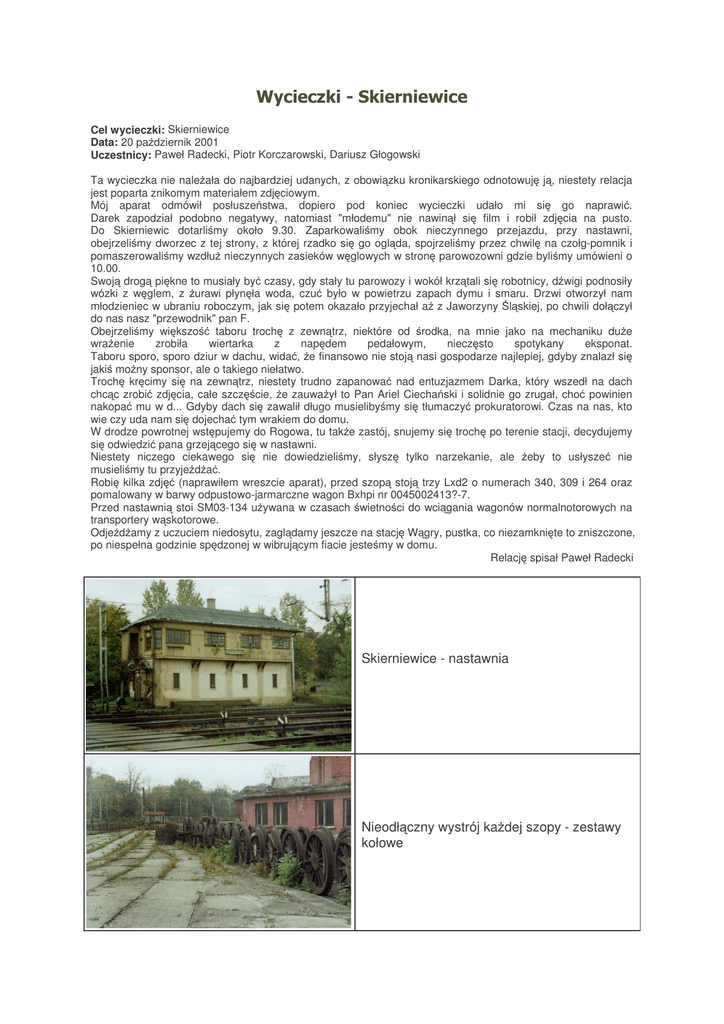 Cel wycieczki: Skierniewice Data: 20 pa dziernik 2001 Uczestnicy: Paweł Radecki, Piotr Korczarowski, Dariusz Głogowski Ta wycieczka nie nale ała do najbardziej udanych, z obowi zku kronikarskiego odnotowuj j , niestety relacja jest poparta znikomym materiałem zdj ciowym. Mój aparat odmówił posłusze stwa, dopiero pod koniec wycieczki udało mi si go naprawi . Darek zapodział podobno negatywy, natomiast "młodemu" nie nawin ł si film i robił zdj cia na pusto. Do Skierniewic dotarli my około 9.30. Zaparkowali my obok nieczynnego przejazdu, przy nastawni, obejrzeli my dworzec z tej strony, z której rzadko si go ogl da, spojrzeli my przez chwil na czołg-pomnik i pomaszerowali my wzdłu nieczynnych zasieków w glowych w stron parowozowni gdzie byli my umówieni o 10.00. Swoj drog pi kne to musiały by czasy, gdy stały tu parowozy i wokół krz tali si robotnicy, d wigi podnosiły wózki z w glem, z urawi płyn ła woda, czu było w powietrzu zapach dymu i smaru. Drzwi otworzył nam młodzieniec w ubraniu roboczym, jak si potem okazało przyjechał a z Jaworzyny l skiej, po chwili doł czył do nas nasz "przewodnik" pan F. Obejrzeli my wi kszo taboru troch z zewn trz, niektóre od rodka, na mnie jako na mechaniku du e wra enie zrobiła wiertarka z nap dem pedałowym, niecz sto spotykany eksponat. Taboru sporo, sporo dziur w dachu, wida , e finansowo nie stoj nasi gospodarze najlepiej, gdyby znalazł si jaki mo ny sponsor, ale o takiego niełatwo. Troch kr cimy si na zewn trz, niestety trudno zapanowa nad entuzjazmem Darka, który wszedł na dach chc c zrobi zdj cia, całe szcz cie, e zauwa ył to Pan Ariel Ciecha ski i solidnie go zrugał, cho powinien nakopa mu w d... Gdyby dach si zawalił długo musieliby my si tłumaczy prokuratorowi. Czas na nas, kto wie czy uda nam si dojecha tym wrakiem do domu. W drodze powrotnej wst pujemy do Rogowa, tu tak e zastój, snujemy si troch po terenie stacji, decydujemy si odwiedzi pana grzej cego si w nastawni. Niestety niczego ciekawego si nie dowiedzieli my, słysz tylko narzekanie, ale eby to usłysze nie musieli my tu przyje d a . Robi kilka zdj (naprawiłem wreszcie aparat), przed szop stoj trzy Lxd2 o numerach 340, 309 i 264 oraz pomalowany w barwy odpustowo-jarmarczne wagon Bxhpi nr 0045002413?-7. Przed nastawni stoi SM03-134 u ywana w czasach wietno ci do wci gania wagonów normalnotorowych na transportery w skotorowe. Odje d amy z uczuciem niedosytu, zagl damy jeszcze na stacj W gry, pustka, co niezamkni te to zniszczone, po niespełna godzinie sp dzonej w wibruj cym fiacie jeste my w domu. Relacj spisał Paweł Radecki Skierniewice - nastawnia Nieodł czny wystrój ka dej szopy - zestawy kołowe Obrotnica przed szop Tendry przerobione na zbiorniki przeciwpo arowe Widok dworca od strony lokomotywowni Widok dworca od strony peronów Dworzec po zako czeniu remontu w roku 2003