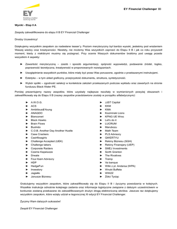 EY Financial Challenger XI Wyniki - Etap II A Zespoły zakwalifikowane do etapu II B EY Financial Challenger Drodzy Uczestnicy! Dziękujemy wszystkim zespołom za nadesłane teaser’y. Poziom merytoryczny był bardzo wysoki, jesteśmy pod wrażeniem Waszej wiedzy oraz kreatywności. Niestety, nie możemy Was wszystkich zaprosić do Etapu II B i jak co roku przyszedł moment, kiedy z niektórymi musimy się pożegnać. Przy ocenie Waszych dokumentów braliśmy pod uwagę przede wszystkim 4 aspekty: ► Zawartość merytoryczną – zasób i sposób argumentacji, spójność wypowiedzi, podawanie źródeł, logika, poprawność teoretyczna, kreatywność w proponowanych rozwiązaniach. ► Uwzględnienie wszystkich punktów, które miały być przez Was poruszone, zgodnie z przekazanymi instrukcjami. ► Estetyka – w tym układ graficzny, przejrzystość dokumentu, struktura, syntetyczność. ► Wybór spółki – zgodność selekcji w kontekście założeń przekazanych podczas wykładu oraz zawartych na stronie funduszu Black Water PE. Poniżej prezentujemy nazwy zespołów, które uzyskały najlepsze rezultaty w wymienionych powyżej obszarach i zakwalifikowały się do Etapu II B (nazwy zespołów przedstawione zostały w porządku alfabetycznym): ► ► ► ► ► ► ► ► ► ► ► ► ► ► ► ► ► ► ► ► ► ► A.W.O.G. ACS Ambitious&Young ANAGDO Bianconeri Black Hawks Brain Flows Bushido C.O.B. Another Day Another Hustle Case Crackers Cashflowgirls Challenge Accepted (UEK) Challenge takers Corporate Raiders Czarne Kapelusze Drwale Four-foam Advisory HDP HedgeFun Inwestory Jagiełło Janusze Biznesu ► ► ► ► ► ► ► ► ► ► ► ► ► ► ► ► ► ► ► ► ► ► JJST Capital KKM KMA Kozminski Lions KPNG UE Wroc Let's do it LUCRUM Marubozu Math Team PLS Advisory QWERTYU Rekiny Biznesu (SGH) Rekiny Finansjery (UEP) SMEJ Investments Sorth Granton The Rivatives Tramp Va banque Wilki z pl. Andersa (WPA) Wnuki Buffeta WWZZ Żółci Tysiąc Gratulujemy wszystkim zespołom, które zakwalifikowały się do Etapu II B i życzymy powodzenia w kolejnych. Wszelkie instrukcje odnośnie kolejnego zadania oraz informacje logistyczne związane z dalszym uczestnictwem w konkursie zostaną przekazane do zakwalifikowanych drużyn drogą elektroniczną wkrótce. Jeszcze raz dziękujemy wszystkim zespołom, które wzięły udział w tegorocznej XI edycji EY Financial Challenger. Życzmy Wam dalszych sukcesów! Zespół EY Financial Challenger