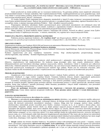 REGULAMIN KONKURSU „NA WSPÓLNEJ ZIEMI”– HISTORIA I KULTURA ŻYDÓW POLSKICH DLA UCZNIÓW SZKÓŁ PODSTAWOWYCH I GIMNAZJÓW – VIII EDYCJA Żydzi przybywali na ziemie polskie już we wczesnym średniowieczu. Na gościnnej polskiej ziemi znajdowali schronienie przed prześladowaniami w Europie zachodniej. Byli wspómieszkańcami Polski, współorganizatorami jej życia gospodarczego, mieli swój wkład w rozwój kultury polskiej. Kultywowali swoje tradycje i obyczaje. Budzili zainteresowanie, ciekawość, a czasem niechęć motywowaną strachem przed „obcym” i nieznanym. W wyniku Zagłady Żydów dokonanej przez okupantów niemieckich w latach II wojny światowej i powojennych migracji świat Żydów polskich przestał istnieć. Ślad po nim przetrwał głównie w szczątkach kultury materialnej, zapisach literackich oraz, co szczególnie ważne, w pamięci starszego pokolenia Polaków – babć i dziadków naszych uczniów. Proponujemy młodzieży odszukanie śladów pozostawionych przez żydowskich mieszkańców ich rodzinnych stron lub innych, wybranych miejsc, do których uczniowie dotarli, wydobycie z zapomnienia świadectw obecności żydowskiej, odświeżenie pamięci tych ludzi, którzy jeszcze pamiętają swych żydowskich przyjaciół dziecinnych zabaw. Mamy nadzieję, że forma konkursu będzie ciekawa i inspirująca dla uczniów. Pozwoli im odkryć i poznać świat Żydów mieszkających kiedyś w najbliższym otoczeniu – w mieście, miasteczku, wsi, regionie lub w innych miejscach Polski. PODSTAWA PRAWNA PRZEPROWADZENIA KONKURSU Podstawą prawną organizacji konkursu „Na wspólnej ziemi” jest Rozporządzenie MENiS z dn. 29.01.2002 r. w sprawie organizacji oraz sposobu przeprowadzania konkursów, turniejów i olimpiad (Dz.U. z dn.18.02.2002r., Nr 13, poz. 125). ORGANIZATORZY Organizatorem konkursu jest Fundacja SHALOM pod honorowym patronatem Ministerstwa Edukacji Narodowej Patronat naukowy nad tematyką i przebiegiem konkursu obejmują: Instytut Historyczny Uniwersytetu Warszawskiego; Instytut Judaistyki Uniwersytetu Jagiellońskiego, Żydowski Instytut Historyczny oraz Muzeum Historii Żydów Polskich POLIN. Konkurs organizowany jest przy współpracy kuratoriów oświaty. Etap szkolny/regionalny przeprowadzają komisje szkolne/regionalne, etap centralny – Komitet Organizacyjny konkursu. UCZESTNICY Uczestnikami konkursu mogą być uczniowie szkół podstawowych i gimnazjów indywidualnie lub tworzący zespoły (klasowy, międzyklasowy lub międzyszkolny). Do konkursu mogą przystąpić także inne zespoły młodzieżowe (kilku-, kilkunastoosobowe) pod kierunkiem dorosłego opiekuna (nauczyciela, rodzica, instruktora). Udział w konkursie jest całkowicie dobrowolny. Zadaniem placówki oświatowej (szkoły, domu kultury, itp.) jest motywowanie młodzieży do udziału w konkursie przez ukazywanie poznawczych, kształcących i wychowawczych walorów tego zadania. Ważne jest też wskazanie znaczenia, jakie uzyskana wiedza ma dla zrozumienia przeszłości i współczesności oraz podkreślenie jej wpływu na kształtowanie przyszłości. PROGRAM KONKURSU Zasadniczym celem konkursu jest poznanie bogatej historii i tradycji Żydów polskich, ich wkładu i miejsca w dziejach społeczności lokalnych w ciągu wieków wspólnej historii. Tematyka konkursu dotyczy dziejów regionalnych społeczności żydowskich w miejscu zamieszkania uczestników konkursu (lub innym, wybranym miejscu, doktórego uczeń dotarł). Uczestnicy wykonują prace samodzielnie, wykazując w nich zarówno posiadaną wiedzę, umiejętności oraz emocjonalny stosunek do tematyki projektu. Opiekun grupy powinien udzielać wszechstronnej pomocy w takich sprawach jak: określenie tematu projektu, formy jego realizacji i sposobu prezentacji, dobór literatury przedmiotu i innych źródeł wiadomości, oraz prowadzić systematyczne konsultacje merytoryczne. Prace nie spełniające kryteriów samodzielności (np. skopiowane z internetu lub przepisane z książek) będą dyskwalifikowane. Cytaty należy opatrzeć przypisami źródłowymi. Prace pisemne należy nadsyłać w wersji elektronicznej i papierowej. ZADANIA KONKURSOWE: Uczestnikom Konkursu proponujemy do wyboru dwa zadania. • Pierwsze to sporządzenie przewodnika po nieistniejącym mieście (dzielnicy, wsi, gminie). Uczniowie mieliby odtworzyć plan swego miejsca zamieszkania lub innego, wybranego miejsca, do którego uczeń dotarł, ze wskazaniem, gdzie mieściły się ważne dla dawnych żydowskich mieszkańców instytucje i miejsca. Mogą nimi być synagogi, mykwy, domy modlitw, dzielnica/ulica zamieszkała przede wszystkim przez Żydów, cmentarz. Liczymy na to, że w oparciu o dawne plany, stare przewodniki, fotografie, spisane historie okolic czy dzięki pamięci żyjących jeszcze świadków dawnych czasów, uda się sporządzić taki plan/przewodnik, może nawet odnaleźć dawne zdjęcia czy sztychy. Byłoby oczywiście niezwykle interesujące gdybyśmy również mogli się dowiedzieć, co się stało z tym nieistniejącym miastem. Czy i na ile zostało zniszczone? Kiedy? Czy nadal istnieje synagoga i co się w niej teraz mieści? Czy domy należące kiedyś do żydowskich krawców, szewców lub kupców jeszcze stoją, czy w tych domach widać ślad obecności niegdysiejszych mieszkańców? Być może uda się dotrzeć do żydowskich nazw ulic, placów, miast, rzek. Gdyby udało się zebrać jak najwięcej takich lokalnych przewodników będziemy być może mogli wydać duży, obejmujący wiele regionów Polski wspólny przewodnik. To byłaby z pewnością niezwykła lektura. • Drugie zadanie ma również charakter badawczy. Na podstawie relacji osób pamiętających czasy przed - i wojenne, czasem może i powojenne, proponujemy odtworzenie obyczajów, życia codziennego, zawodów, znaczenia dla regionu ich żydowskich mieszkańców. Taki rodzaj materiałów nazywa się historią ustną. W ten sposób zebrane materiały (relacje)