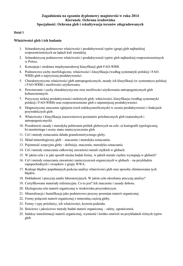 Zagadnienia na egzamin dyplomowy magisterski w roku 2014 Kierunek: Ochrona środowiska Specjalność: Ochrona gleb i rekultywacja terenów zdegradowanych Dział 1 Właściwości gleb i ich badanie 1. Scharakteryzuj podstawowe właściwości i produktywność typów (grup) gleb najbardziej rozprzestrzenionych na lądach kuli ziemskiej. 2. Scharakteryzuj podstawowe właściwości i produktywność typów gleb najbardziej rozprzestrzenionych w Polsce. 3. Koncepcja i struktura międzynarodowej klasyfikacji gleb FAO-WRB. 4. Podstawowe cechy morfologiczne, właściwości i klasyfikacja (według systematyki polskiej i FAOWRB) gleb o najwyższej produktywności. 5. Charakterystyczne właściwości gleb antropogenicznych, zasady ich klasyfikacji (w systematyce polskiej i FAO-WRB) i możliwości użytkowania. 6. Powstawanie i cechy charakterystyczne oraz możliwości użytkowania antropogenicznych gleb kulturoziemnych. 7. Przyczyny niskiej produktywności niektórych gleb; właściwości, klasyfikacja (według systematyki polskiej i FAO-WRB) oraz rozprzestrzenienie gleb o najmniejszej produktywności. 8. Diagnostyczne znaczenie oglejenia (rech redoksymorficznych) w ocenie produktywności i funkcjach przyrodniczych gleb. 9. Właściwości i klasyfikacja (nazewnictwo) poziomów próchnicznych gleb (naturalnych i antropogenicznych). 10. Przedstawić zasady i metodykę pobierania próbek glebowych na cele: a) kartografii typologicznej, b) monitoringu i oceny stanu zanieczyszczenia gleb. 11. Cel i metody oznaczania składu granulometrycznego gleby. 12. Skład mineralogiczny gleb – znaczenie i metodyka oznaczania. 13. Pojemność sorpcyjna gleby - definicja, znaczenie, metodyka oznaczania 14. Cel i metody oznaczania całkowitej zawartości metali ciężkich w glebach. 15. W jakim celu i w jaki sposób można badań formy, w jakich metale ciężkie występują w glebach? 16. Cel i metody oznaczania zawartości zanieczyszczeń organicznych w glebach – na przykładzie ropopochodnych i związków z grupy WWA. 17. Rodzaje błędów popełnianych podczas analizy właściwości gleb oraz sposoby eliminowania tych błędów. 18. Dokładność i precyzja analiz laboratoryjnych. W jakim celu określamy precyzję analizy? 19. Certyfikowane materiały referencyjne. Co to jest? Ich znaczenie i zasady doboru. 20. Ekologiczna rola materii organicznej w środowisku przyrodniczym. 21. Mineralizacja i humifikacja jako podstawowe procesy przemian materii organicznej. 22. Formy połączeń materii organicznej z mineralną częścią gleby. 23. Formy i typy próchnicy, ich właściwości, kryteria podziału. 24. Ilościowe i jakościowe metody badań materii organicznej – zalety, ograniczenia. 25. Indeksy transformacji materii organicznej, wymienić i krótko omówić na przykładach różnych typów gleb. Dział 2 Zagrożenia, ochrona i rekultywacja gleb 1. Główne czynniki określające wielkość strat glebowych w modelu USLE i ich charakterystyka. 2. Wymień i krótko opisz podstawowe zabiegi przeciwerozyjne. 3. Potencjalne zagrożenie gleb Polski erozja wodną i wietrzną. 4. Klasyfikacja zjawisk erozyjnych w geograficznych warunkach Polski. 5. Przyrodnicze i ekonomiczne znaczenie erozji wodnej i wietrznej. 6. Metody pomiaru erozji wodnej i spływu powierzchniowego. 7. Formy geomechanicznej degradacji gleb na obszarach odkrywkowej i podziemnej eksploatacji kopalin 8. Najważniejsze regulacje prawne dotyczące rekultywacji terenów górniczych 9. Decyzje w sprawie rekultywacji i zagospodarowania terenów górniczych. Czego dotyczą, kto je wydaje i jakie są procedury ich uzyskiwania (w świetle przepisów polskiego prawa)? 10. Kierunki zagospodarowania zwałowisk i wyrobisk górniczych. Czynniki decydujące o wyborze kierunku zagospodarowania, przykłady. 11. Przyczyny powstawania zalewisk na terenach górnictwa węgla kamiennego. Kierunki i zasady zagospodarowania zalewisk. 12. Zasady i metody formowania oraz umacniania skarp zwałowisk i wyrobisk 13. Regulacje prawne dotyczące rekultywacji gleb zanieczyszczonych 14. Czynniki kształtujące zawartości metali ciężkich w glebach. Przykłady naturalnego i antropogenicznego wzbogacenia gleb w metale ciężkie. 15. Zasady oceny stanu zanieczyszczenia gleb metalami ciężkimi oraz oceny ryzyka ekologicznego związanego z tym zanieczyszczeniem 16. Zasady rekultywacji gleb zanieczyszczonych metalami ciężkimi. Metody immobilizacji metali i oczyszczania gleb. 17. Metody fitostabilizacji w rekultywacji gleb zanieczyszczonych metalami ciężkimi. Założenia i zasadność stosowania tych metod. 18. Metody fitoekstrakcji w rekultywacji gleb zanieczyszczonych metalami ciężkimi. Przykłady i ocena efektywności tych metod. 19. Przykłady rejonów zanieczyszczonych metalami ciężkimi w Polsce oraz zastosowanych zabiegów rekultywacyjnych 20. Faza rekultywacji wstępnej gleb zanieczyszczonych substancjami organicznymi. 21. Porównaj metody ex-situ rekultywacji gleb: metodę spalania oraz desorpcji termicznej. 22. Usuwanie próżniowe zanieczyszczeń z gleby (ex situ) – przebieg procesu. 23. Porównaj metodę wentylacji i biowentylacji gruntów. 24. Biodegradacja zanieczyszczeń organicznych w glebach oraz czynniki decydujące o procesie biodegradacji. 25. Na czym polega metoda pryzmowania, a na czym metoda rolnicza rekultywacji gleb zanieczyszczonych związkami organicznymi?