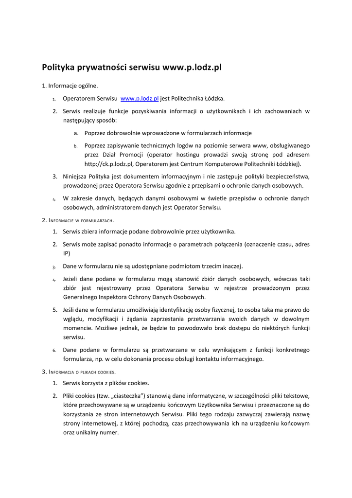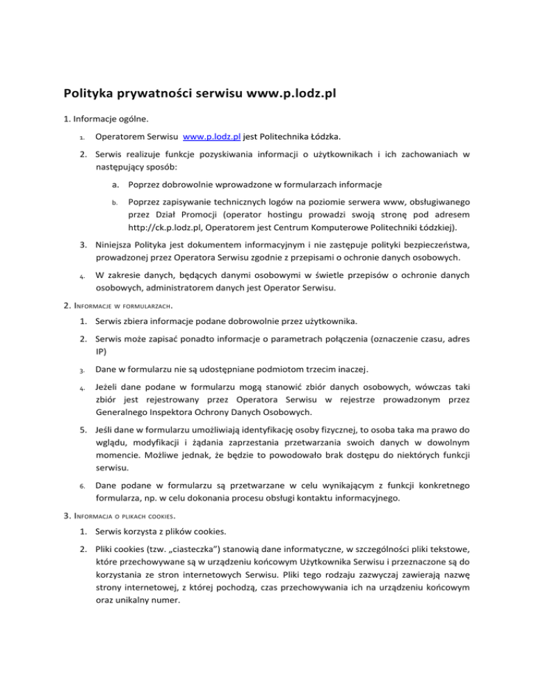Polityka prywatności serwisu www.p.lodz.pl 1. Informacje ogólne. 1. Operatorem Serwisu www.p.lodz.pl jest Politechnika Łódzka. 2. Serwis realizuje funkcje pozyskiwania informacji o użytkownikach i ich zachowaniach w następujący sposób: a. Poprzez dobrowolnie wprowadzone w formularzach informacje b. Poprzez zapisywanie technicznych logów na poziomie serwera www, obsługiwanego przez Dział Promocji (operator hostingu prowadzi swoją stronę pod adresem http://ck.p.lodz.pl, Operatorem jest Centrum Komputerowe Politechniki Łódzkiej). 3. Niniejsza Polityka jest dokumentem informacyjnym i nie zastępuje polityki bezpieczeństwa, prowadzonej przez Operatora Serwisu zgodnie z przepisami o ochronie danych osobowych. 4. W zakresie danych, będących danymi osobowymi w świetle przepisów o ochronie danych osobowych, administratorem danych jest Operator Serwisu. 2. INFORMACJE W FORMULARZACH. 1. Serwis zbiera informacje podane dobrowolnie przez użytkownika. 2. Serwis może zapisać ponadto informacje o parametrach połączenia (oznaczenie czasu, adres IP) 3. Dane w formularzu nie są udostępniane podmiotom trzecim inaczej. 4. Jeżeli dane podane w formularzu mogą stanowić zbiór danych osobowych, wówczas taki zbiór jest rejestrowany przez Operatora Serwisu w rejestrze prowadzonym przez Generalnego Inspektora Ochrony Danych Osobowych. 5. Jeśli dane w formularzu umożliwiają identyfikację osoby fizycznej, to osoba taka ma prawo do wglądu, modyfikacji i żądania zaprzestania przetwarzania swoich danych w dowolnym momencie. Możliwe jednak, że będzie to powodowało brak dostępu do niektórych funkcji serwisu. 6. Dane podane w formularzu są przetwarzane w celu wynikającym z funkcji konkretnego formularza, np. w celu dokonania procesu obsługi kontaktu informacyjnego. 3. I NFORMACJA O PLIKACH COOKIES. 1. Serwis korzysta z plików cookies. 2. Pliki cookies (tzw. „ciasteczka”) stanowią dane informatyczne, w szczególności pliki tekstowe, które przechowywane są w urządzeniu końcowym Użytkownika Serwisu i przeznaczone są do korzystania ze stron internetowych Serwisu. Pliki tego rodzaju zazwyczaj zawierają nazwę strony internetowej, z której pochodzą, czas przechowywania ich na urządzeniu końcowym oraz unikalny numer. 3. Podmiotem zamieszczającym na urządzeniu końcowym Użytkownika Serwisu pliki cookies oraz uzyskującym do nich dostęp jest operator Serwisu lub podmioty z nim współpracujące. 4. Pliki cookies wykorzystywane są w następujących celach: a. tworzenia statystyk, które pomagają zrozumieć, w jaki sposób Użytkownicy Serwisu korzystają ze stron internetowych, co umożliwia ulepszanie ich struktury i zawartości; 5. Oprogramowanie do przeglądania stron internetowych (przeglądarka internetowa) zazwyczaj domyślnie dopuszcza przechowywanie plików cookies w urządzeniu końcowym Użytkownika. Użytkownicy Serwisu mogą dokonać zmiany ustawień w tym zakresie. Przeglądarka internetowa umożliwia usunięcie plików cookies. Możliwe jest także automatyczne blokowanie plików cookies Szczegółowe informacje na ten temat zawiera pomoc lub dokumentacja przeglądarki internetowej. 6. Ograniczenia stosowania plików cookies mogą wpłynąć na niektóre funkcjonalności dostępne na stronach internetowych Serwisu. 7. Pliki cookies zamieszczane w urządzeniu końcowym Użytkownika Serwisu i wykorzystywane mogą być również przez współpracujących z operatorem Serwisu reklamodawców oraz partnerów, a także operatorów płatności. 8. Zalecamy przeczytanie polityki ochrony prywatności tych firm, aby poznać zasady korzystania z plików cookie wykorzystywane w statystykach: Polityka ochrony prywatności Google Analytics 9. W zakresie informacji o preferencjach użytkownika gromadzonych przez sieć reklamową Google użytkownik może przeglądać i edytować informacje wynikające z plików cookies przy pomocy narzędzia: https://www.google.com/ads/preferences/ 4. LOGI SERWERA. 1. Informacje o niektórych zachowaniach użytkowników podlegają logowaniu w warstwie serwerowej. Dane te są wykorzystywane wyłącznie w celu administrowania serwisem oraz w celu zapewnienia jak najlepszej obsługi świadczonych usług informacyjnych. 2. Przeglądane zasoby identyfikowane są poprzez adresy URL. Ponadto zapisowi mogą podlegać: a. czas nadejścia zapytania, b. czas wysłania odpowiedzi, c. nazwę stacji klienta – identyfikacja realizowana przez protokół HTTP, d. informacje o błędach jakie nastąpiły przy realizacji transakcji HTTP, e. adres URL strony poprzednio odwiedzanej przez użytkownika (referer link) – w przypadku gdy przejście do Serwisu nastąpiło przez odnośnik, f. informacje o przeglądarce użytkownika, g. Informacje o adresie IP. 3. Dane powyższe nie są kojarzone z konkretnymi osobami przeglądającymi strony. 5. UDOSTĘPNIENIE I POWIERZENIE PRZETWARZANIA DANYCH. 1. Dane podlegają udostępnieniu podmiotom zewnętrznym wyłącznie w granicach prawnie dozwolonych. 2. Operator może mieć obowiązek udzielania informacji zebranych przez Serwis upoważnionym organom na podstawie zgodnych z prawem żądań w zakresie wynikającym z żądania. 6. ZARZĄDZANIE PLIKAMI COOKIES – JAK W PRAKTYCE WYRAŻAĆ I COFAĆ ZGODĘ? 1. Jeśli użytkownik nie chce otrzymywać plików cookies, może zmienić ustawienia przeglądarki. 2. W celu zarządzania ustawieniami cookies wybierz z listy poniżej przeglądarkę internetową/ system i postępuj zgodnie z instrukcjami: a. Internet Explorer b. Chrome c. Safari d. Firefox e. Opera f. Android g. Safari (iOS) h. Windows Phone i. Blackberry