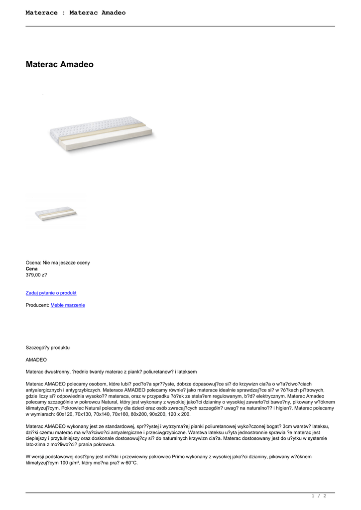 Materace : Materac Amadeo Materac Amadeo Ocena: Nie ma jeszcze oceny Cena 379,00 z? Zadaj pytanie o produkt Producent: Meble marzenie Szczegó?y produktu AMADEO Materac dwustronny, ?rednio twardy materac z piank? poliuretanow? i lateksem Materac AMADEO polecamy osobom, które lubi? pod?o?a spr??yste, dobrze dopasowuj?ce si? do krzywizn cia?a o w?a?ciwo?ciach antyalergicznych i antygrzybiczych. Materace AMADEO polecamy równie? jako materace idealnie sprawdzaj?ce si? w ?ó?kach pi?trowych, gdzie liczy si? odpowiednia wysoko?? materaca, oraz w przypadku ?ó?ek ze stela?em regulowanym, b?d? elektrycznym. Materac Amadeo polecamy szczególnie w pokrowcu Natural, który jest wykonany z wysokiej jako?ci dzianiny o wysokiej zawarto?ci bawe?ny, pikowany w?óknem klimatyzuj?cym. Pokrowiec Natural polecamy dla dzieci oraz osób zwracaj?cych szczególn? uwag? na naturalno?? i higien?. Materac polecamy w wymiarach: 60x120, 70x130, 70x140, 70x160, 80x200, 90x200, 120 x 200. Materac AMADEO wykonany jest ze standardowej, spr??ystej i wytrzyma?ej pianki poliuretanowej wyko?czonej bogat? 3cm warstw? lateksu, dzi?ki czemu materac ma w?a?ciwo?ci antyalergiczne i przeciwgrzybiczne. Warstwa lateksu u?yta jednostronnie sprawia ?e materac jest cieplejszy i przytulniejszy oraz doskonale dostosowuj?cy si? do naturalnych krzywizn cia?a. Materac dostosowany jest do u?ytku w systemie lato-zima z mo?liwo?ci? prania pokrowca. W wersji podstawowej dost?pny jest mi?kki i przewiewny pokrowiec Primo wykonany z wysokiej jako?ci dzianiny, pikowany w?óknem klimatyzuj?cym 100 g/m², który mo?na pra? w 60°C. 1 / 2 Materace : Materac Amadeo Materac AMADEO stanowi doskona?y i ekonomiczny wybór dla ca?ej rodziny. Zalety materaca: pianka poliuretanowa 8 cm lateks 3cm, jednostronnie antyalergiczny, przeciwgrzybiczy wysoko?? materaca ok. 12 cm W wersji podstawowej materac dost?pny w wersji Primo, pikowany w?óknem klimatyzuj?cym 150 g/m², nadaj?cy si? do prania w 60°C z zamkiem rozdzielczym 360°. Opinie Nikt jeszcze nie ocenia? tego produktu. 2 / 2 Powered by TCPDF (www.tcpdf.org)