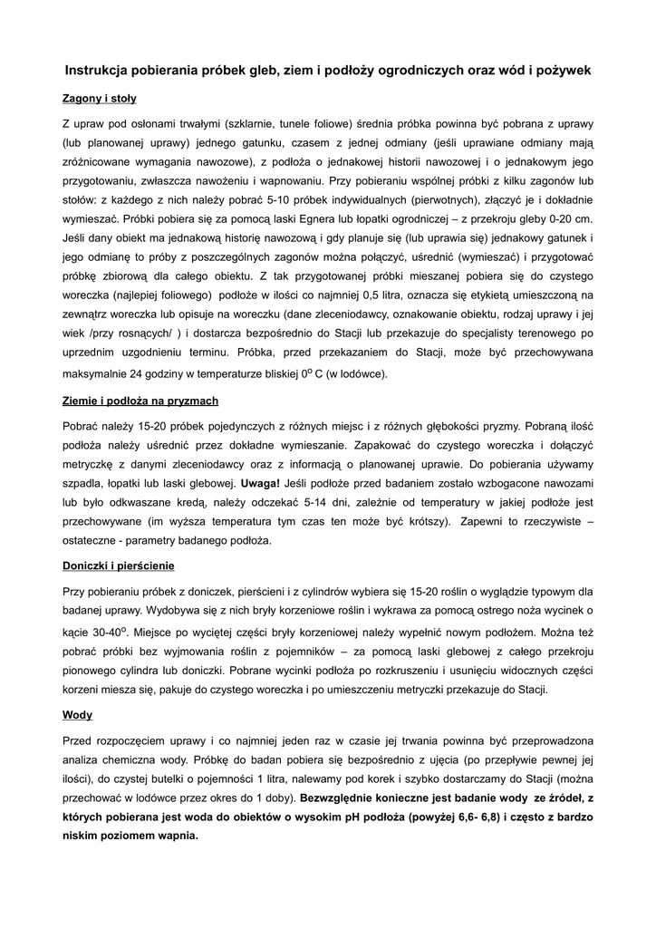 Instrukcja pobierania próbek gleb, ziem i podłoży ogrodniczych oraz wód i pożywek Zagony i stoły Z upraw pod osłonami trwałymi (szklarnie, tunele foliowe) średnia próbka powinna być pobrana z uprawy (lub planowanej uprawy) jednego gatunku, czasem z jednej odmiany (jeśli uprawiane odmiany mają zróżnicowane wymagania nawozowe), z podłoża o jednakowej historii nawozowej i o jednakowym jego przygotowaniu, zwłaszcza nawożeniu i wapnowaniu. Przy pobieraniu wspólnej próbki z kilku zagonów lub stołów: z każdego z nich należy pobrać 5-10 próbek indywidualnych (pierwotnych), złączyć je i dokładnie wymieszać. Próbki pobiera się za pomocą laski Egnera lub łopatki ogrodniczej – z przekroju gleby 0-20 cm. Jeśli dany obiekt ma jednakową historię nawozową i gdy planuje się (lub uprawia się) jednakowy gatunek i jego odmianę to próby z poszczególnych zagonów można połączyć, uśrednić (wymieszać) i przygotować próbkę zbiorową dla całego obiektu. Z tak przygotowanej próbki mieszanej pobiera się do czystego woreczka (najlepiej foliowego) podłoże w ilości co najmniej 0,5 litra, oznacza się etykietą umieszczoną na zewnątrz woreczka lub opisuje na woreczku (dane zleceniodawcy, oznakowanie obiektu, rodzaj uprawy i jej wiek /przy rosnących/ ) i dostarcza bezpośrednio do Stacji lub przekazuje do specjalisty terenowego po uprzednim uzgodnieniu terminu. Próbka, przed przekazaniem do Stacji, może być przechowywana maksymalnie 24 godziny w temperaturze bliskiej 0o C (w lodówce). Ziemie i podłoża na pryzmach Pobrać należy 15-20 próbek pojedynczych z różnych miejsc i z różnych głębokości pryzmy. Pobraną ilość podłoża należy uśrednić przez dokładne wymieszanie. Zapakować do czystego woreczka i dołączyć metryczkę z danymi zleceniodawcy oraz z informacją o planowanej uprawie. Do pobierania używamy szpadla, łopatki lub laski glebowej. Uwaga! Jeśli podłoże przed badaniem zostało wzbogacone nawozami lub było odkwaszane kredą, należy odczekać 5-14 dni, zależnie od temperatury w jakiej podłoże jest przechowywane (im wyższa temperatura tym czas ten może być krótszy). Zapewni to rzeczywiste – ostateczne - parametry badanego podłoża. Doniczki i pierścienie Przy pobieraniu próbek z doniczek, pierścieni i z cylindrów wybiera się 15-20 roślin o wyglądzie typowym dla badanej uprawy. Wydobywa się z nich bryły korzeniowe roślin i wykrawa za pomocą ostrego noża wycinek o kącie 30-40o. Miejsce po wyciętej części bryły korzeniowej należy wypełnić nowym podłożem. Można też pobrać próbki bez wyjmowania roślin z pojemników – za pomocą laski glebowej z całego przekroju pionowego cylindra lub doniczki. Pobrane wycinki podłoża po rozkruszeniu i usunięciu widocznych części korzeni miesza się, pakuje do czystego woreczka i po umieszczeniu metryczki przekazuje do Stacji. Wody Przed rozpoczęciem uprawy i co najmniej jeden raz w czasie jej trwania powinna być przeprowadzona analiza chemiczna wody. Próbkę do badan pobiera się bezpośrednio z ujęcia (po przepływie pewnej jej ilości), do czystej butelki o pojemności 1 litra, nalewamy pod korek i szybko dostarczamy do Stacji (można przechować w lodówce przez okres do 1 doby). Bezwzględnie konieczne jest badanie wody ze źródeł, z których pobierana jest woda do obiektów o wysokim pH podłoża (powyżej 6,6- 6,8) i często z bardzo niskim poziomem wapnia. Pożywki Próbki pożywek z upraw hydroponicznych lub torfowo-wodnych pobiera się po uprzednim uzupełnieniu roztworu nawozowego do zalecanej objętości i po dokładnym wymieszaniu. Objętość próbki do badań: 250300 ml roztworu. Próbkę roztworu pożywki z maty pobiera się strzykawką lub specjalnym urządzeniem przez cały okres z tych samych miejsc w zasięgu systemu korzeniowego roślin, zawsze o tej samej porze dnia oraz po upływie tego samego czasu od nawadniania – najlepiej rano przed lub po pierwszym nawadnianiu. Jeśli wzrost roślin jest wyrównany – próbkę wystarczy pobrać z kilku miejsc. Natomiast przy nieprawidłowościach miejscowych należy pobrać oddzielną próbkę (próbki) z tych miejsc i oddzielnie przekazać je do analiz.