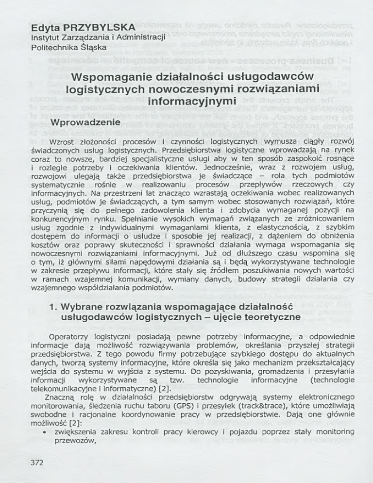 E d yta P R Z Y B Y L S K A Instytut Zarządzania i Administracji Politechnika Śląska Wspomaganie działalności usługodawców logistycznych nowoczesnymi rozwiązaniami informacyjnymi W prowadzenie Wzrost złożoności procesów i czynności logistycznych wymusza ciągły rozwój świadczonych usług logistycznych. Przedsiębiorstwa logistyczne wprowadzają na rynek coraz to nowsze, bardziej speqalistyczne usługi aby w ten sposób zaspokoić rosnące i rozległe potrzeby i oczekiwania klientów. Jednocześnie, wraz z rozwojem usług, rozwojowi ulegają także przedsiębiorstwa je świadczące - rola tych podmiotów systematycznie rośnie w realizowaniu procesów przepływów rzeczowych czy informacyjnych. Na przestrzeni lat znacząco wzrastają oczekiwania wobec realizowanych usług, podmiotów je świadczących, a tym samym wobec stosowanych rozwiązań, które przyczynią się do pełnego zadowolenia klienta i zdobycia wymaganej pozycji na konkurencyjnym rynku. Spełnianie wysokich wymagań związanych ze zróżnicowaniem usług zgodnie z indywidualnymi wymaganiami klienta, z elastycznością, z szybkim dostępem do informacji o usłudze i sposobie jej realizacji, z dążeniem do obniżenia kosztów oraz poprawy skuteczności i sprawności działania wymaga wspomagania się nowoczesnymi rozwiązaniami informacyjnymi. Już od dłuższego czasu wspomina się o tym, iż głównymi siłami napędowymi działania są i będą wykorzystywane technologie w zakresie przepływu informacji, które stały się źródłem poszukiwania nowych wartości w ramach wzajemnej komunikacji, wymiany danych, budowy strategii działania czy wzajemnego współdziałania podmiotów. 1. W ybrane rozwiązania w spom agające działalność usługodaw ców logistycznych - ujęcie teoretyczne Operatorzy logistyczni posiadają pewne potrzeby informacyjne, a odpowiednie informaq'e dają możliwość rozwiązywania problemów, określania przyszłej strategii przedsiębiorstwa. Z tego powodu firmy potrzebujące szybkiego dostępu do aktualnych danych, tworzą systemy informacyjne, które określa się jako mechanizm przekształcający wejścia do systemu w wyjścia z systemu. Do pozyskiwania, gromadzenia i przesyłania informacji wykorzystywane są tzw. technologie informacyjne (technologie telekomunikacyjne i informatyczne) [2]. Znaczną rolę w działalności przedsiębiorstw odgrywają systemy elektronicznego monitorowania, śledzenia ruchu taboru (GPS) i przesyłek (track&trace), które umożliwiają swobodne i racjonalne koordynowanie pracy w przedsiębiorstwie. Dają one głównie możliwość [2]: • zwiększenia zakresu kontroli pracy kierowcy i pojazdu poprzez stały monitoring przewozów, 372 • • bardziej efektywnego zarządzania innymi pracownikami, rozliczenia faktycznego czasu pracy pojazdu i przejechanej trasy w rzeczywistości (dzięki odpowiedniemu oprogramowaniu, zintegrowanemu z systemem GPS), • wydruku raportu danych z przejechanej trasy i sprawdzenia wiarygodności rozliczenia kierowcy, • uzyskania w dowolnej chwili informacji o: dacie, godzinie, prędkości przejazdu oraz czasie i miejscu pojazdu, • stałego optymalizowania działalności przewozowej: wytyczanie tras, organizacja kolejności za- i wyładunków, • sprawdzenia aktualnego stanu i liczby przewożonych przesyłek, informacji na temat nadania i odbioru przesyłki, magazynów, przez które przechodziła lub gdzie się znajduje. Podstawową wartością dostarczaną klientom jest poczucie bezpieczeństwa, a sposobem na jej osiągnięcie stał się system śledzenia drogi przepływu produktu i warunków realizacji tego przepływu w łańcuchu dostaw [12]. Za pomocą track&trace operator logistyczny posiada jasno określony system odpowiedzialności pracowników za ładunek i w każdej chwili uzyska informage gdzie znajduje się przesyłka. Natomiast klient w każdej chwili ma możliwość sprawdzenia, co dzieje się z przesyłką i może otrzymać informację, czy przesyłka dotarła [5]. Przedsiębiorstwa logistyczne korzystają także z możliwości jakie daje Internet. Przedsiębiorstwa z branży przesyłek ekspresowych oferują szeroki zakres usług przez sieć. Za pomocą przeglądarki internetowej klient sprawdza dostępne usługi, oblicza koszt usługi, wypełnia list przewozowy oraz zamawia kuriera [5]. Rozwój technologii internetowych stwarza możliwości do pojawienia się nowych struktur po stronie podaży rynku usług logistycznych np. tzw. wirtualni operatorzy logistyczni. Ponadto pojawił się na rynku nowy rodzaj przedsiębiorstwa wykorzystującego w swojej działalności zasoby internetowe - elektroniczne rynki, zwane giełdami elektronicznymi. Są to wirtualne przestrzenie rynkowe, w których sprzedawcy oferują określone usługi, a nabywcy poszukują informacji, wskazują na swoje potrzeby, składają zamówienia, używając do tego głównie Internetu [10]. Twój kotr.puHr Jch k om pićtr Rys. 1. Elektroniczna wymiana dokumentacji, a metody tradycyjne Źródło: [3, s. 169] Każdego dnia duże firmy posiadające wielu kooperantów i zawierające wiele międzynarodowych transakcji generują i przetwarzają ogromną ilość papierowych dokumentów [4]. Rozwiązaniem problemu dużej ilości dokumentów jest elektroniczna 373 wymiana dokumentacji, określana skrótem EDI [11]. Mówi się o wymianie dokumentów, ponieważ dane, które są przedmiotem elektronicznej wymiany są odpowiednikiem tradycyjnych handlowych dokumentów m.in. faktur, harmonogramów produkcyjnych itp. Biorąc pod uwagę definicję przyjmuje się, że przesyłanie danych w ramach EDI odbywa się przez elektroniczne łącza pomiędzy komputerami zamiast wymiennych nośników informacji [3], Różnicę między EDI a tradycyjnymi metodami zaprezentowano na rysunku 1. W dzisiejszych czasach dla poprawnego funkcjonowania przedsiębiorstwa logistycznego, podejmowania trudnych decyzji menedżerskich oraz wykonywania usług na wysokim poziomie