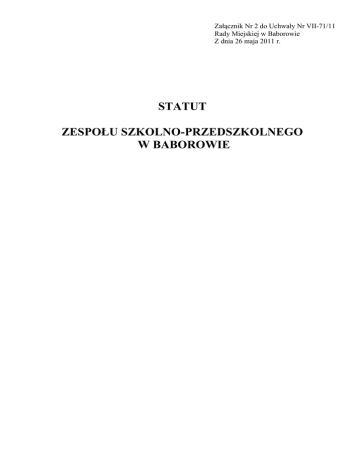 Załącznik Nr 2 do Uchwały Nr VII-71/11 Rady Miejskiej w Baborowie Z dnia 26 maja 2011 r. STATUT ZESPOŁU SZKOLNO-PRZEDSZKOLNEGO W BABOROWIE SPIS TREŚCI Nazwa i typ placówki …………………………………………..str. 3 Cele i zadania Zespołu……………………………………..……str.4 Organy Zespołu…………………………………………….……str.6 Prawa i Obowiązki ucznia ………………………………………str.10 System nagród i kar……………………………………………..str.12 Zasady współdziałania Organów Zespołu.……………………...str.13 Organizacja pracy Zespołu……………………………………...str.14 Organizacja zajęć ……………………………………………….str. 15 Świetlica Zespołu …………………………………………….…str. 18 Biblioteka szkolna …….………………………………….…….str. 18 Stołówka ………………………………………………….…….str. 19 Inni pracownicy Zespołu ………………………………….……str. 19 Zadania nauczycieli oraz innych pracowników Zespołu ……….str.20 Zasady rekrutacji uczniów………………………………………str.25 Wewnątrzszkolne ocenianie uczniów…………………………...str.28 Przepisy przejściowe i postanowienia końcowe ..………………str. 50 2 Rozdział 1 Nazwa i typ placówki. §1 1. Nazwa placówki brzmi: Zespół Szkolno-Przedszkolny w Baborowie. 2. W skład Zespołu Szkolno-Przedszkolnego wchodzą: - Publiczne Przedszkole w Baborowie z oddziałem zamiejscowym w Sułkowie, - Publiczna Szkoła Podstawowa im. Jana Pawła II w Baborowie, - Publiczne Gimnazjum z Oddziałami Integracyjnymi im. Jana Pawła II w Baborowie. 3. Siedzibą Zespołu Szkolno-Przedszkolnego jest budynek przy ulicy Wiejskiej 5a w Baborowie; Zespół funkcjonuje również w budynku przy ul. Opawskiej 17, ul. Powstańców 62 , ul. Krakowskiej 6 w Baborowie, oddział zamiejscowy mieści się w Sułkowie. 4. Zespół Szkolno-Przedszkolny, zwany dalej „Zespołem” jest placówką publiczną, ogólnodostępną. 5. Organem prowadzącym Zespół jest Gmina Baborów. 6. Nadzór pedagogiczny nad Zespołem sprawuje Opolski Kurator Oświaty. §2 1. W Zespole używa się pieczęci nagłówkowej wspólnej dla wszystkich placówek wchodzących w jego skład o treści: Zespół Szkolno-Przedszkolny w Baborowie 48-120 Baborów ul. Wiejska 5 a tel.77 – 4036950 W sprawach dotyczących zakresu działalności tylko danej placówki używa się pieczęci nagłówkowych zawierających nazwę Zespołu oraz nazwę placówki : Publiczne Przedszkole 48-120 Baborów Ul. Wiejska 5a tel.77-4036950 Publiczna Szkoła Podstawowa im. Jana Pawła II 48- 120 Baborów ul. Wiejska 5 a tel. 77 – 4036950 Publiczne Gimnazjum z Oddziałami Integracyjnymi im. Jana Pawła II 48- 120 Baborów ul. Wiejska 5 a tel. 77 – 4036950 2. Szkoły wchodzące w skład Zespołu używają pieczęci urzędowych właściwych dla tych placówek: - Szkoła Podstawowa używa metalowej pieczęci urzędowej, tłoczonej, o średnicy 36 mm zawierającej pośrodku wizerunek orła ustalony dla godła Rzeczypospolitej Polskiej, a w otoku napis: „Publiczna Szkoła Podstawowa im. Jana Pawła II w Baborowie”, 3 - Gimnazjum używa metalowej pieczęci urzędowej, tłoczonej, o średnicy 36 mm zawierającej pośrodku wizerunek orła ustalony dla godła Rzeczypospolitej Polskiej, a w otoku napis: „Publiczne Gimnazjum im. Jana Pawła II w Baborowie”. Rozdział 2 Cele i zadania Zespołu §3 Cele i zadania przedszkola Sposoby wykonywania zadań. 1. Celem wychowania przedszkolnego jest: - wspomaganie dzieci w rozwijaniu uzdolnień oraz kształtowanie umiejętności potrzebnych im w codziennych sytuacjach i w dalszej edukacji; - budowanie u dzieci systemu wartości uniwersalnych; - kształtowanie u dzieci odporności emocjonalnej, koniecznej do racjonalnego radzenia sobie w nowych i trudnych sytuacjach, w tym także do łagodnego znoszenia stresów i porażek; - rozwijanie umiejętności społecznych dzieci, niezbędnych w poprawnych relacjach z innymi dziećmi i dorosłymi; - stwarzanie warunków sprzyjających wspólnej, zgodnej zabawie i nauce dzieci o zróżnicowanych możliwościach fizycznych i intelektualnych; - troska o zdrowie dzieci i ich sprawność fizyczną; zachęcanie do uczestnictwa w zabawach i grach sportowych; - budowanie dziecięcej wiedzy o świecie społecznym, przyrodniczym i technicznym oraz rozwijanie umiejętności prezentowania swoich przemyśleń w sposób zrozumiały dla innych; - wprowadzenie dzieci w świat wartości estetycznych i rozwijanie umiejętności wypowiadania się poprzez muzykę, małe formy teatralne oraz sztuki plastyczne; - kształtowanie u dzieci poczucia przynależności społecznej (do rodziny, grupy rówieśniczej, i wspólnoty narodowej) oraz postawy patriotycznej; - zapewnienie dzieciom lepszych szans edukacyjnych poprzez wspieranie ich ciekawości, aktywności i samodzielności, a także kształtowanie tych widomości i umiejętności, które są ważne w edukacji szkolnej. 2. Do zadań przedszkola należy: - kształtowanie czynnej postawy dzieci wobec własnego zdrowia i bezpieczeństwa oraz rozwijanie ich sprawności ruchowej, - budzenie wrażliwości emocjonalnej i świadomości narodowej oraz wzmocnienie więzi uczuciowej z rodziną, - nabywanie przez dziecko kompetencji językowej, a w tym kształtowanie gotowości do nauki czytania, - integrowanie treści edukacyjnych, - wspomaganie indywidualnego rozwoju dziecka z wykorzystaniem własnej inicjatywy, - prowadzenie działalności diagnostycznej dotyczącej rozwoju wychowanka, - współpraca z poradnią Psychologiczno-Pedagogiczną w celu udzielania dziecku pomocy specjalistycznej, - zapewnienie opieki dzieciom o specjalnych potrzebach, - organizowanie, na wniosek rodziców, lekcji religii, a dzieciom nie uczęszczającym na 