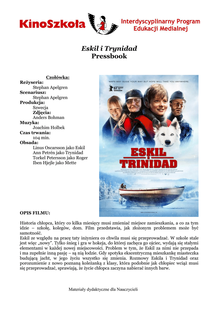 Eskil i Trynidad Pressbook Czołówka: Reżyseria: Stephan Apelgren Scenariusz: Stephan Apelgren Produkcja: Szwecja Zdjęcia: Anders Bohman Muzyka: Joachim Holbek Czas trwania: 104 min. Obsada: Linus Oscarsson jako Eskil Ann Petrén jako Trynidad Torkel Petersson jako Roger Iben Hjejle jako Mette OPIS FILMU: Historia chłopca, który co kilka miesięcy musi zmieniać miejsce zamieszkania, a co za tym idzie – szkołę, kolegów, dom. Film przedstawia, jak złożonym problemem może być samotność. Eskil ze względu na pracę taty inżyniera co chwila musi się przeprowadzać. W szkole stale jest więc „nowy”. Tylko śnieg i gra w hokeja, do której zachęca go ojciec, wydają się stałymi elementami w każdej nowej miejscowości. Problem w tym, że Eskil za nimi nie przepada i ma zupełnie inną pasję – są nią łodzie. Gdy spotyka ekscentryczną mieszkankę miasteczka budującą jacht, w jego życiu wszystko się zmienia. Rozmowy Eskila i Trynidad oraz porozumienie z nowo poznaną koleżanką z klasy, która podobnie jak chłopiec wciąż musi się przeprowadzać, sprawiają, że życie chłopca zaczyna nabierać innych barw. Materiały dydaktyczne dla Nauczycieli NAGRODY: Film był wyświetlany na wielu festiwalach w 2013 roku, między innymi na Berlinale i na Poznańskim Festiwalu Filmów Młodego Widza Ale Kino! Zdobył nagrodę Europejskiego Stowarzyszenia Filmów dla Dzieci (ECFA Award). O TWÓRCACH: Stephan Apelgren – reżyser (ur. 1954), absolwent szkoły teatralnej i basista jazzowy. Pracował jako dramaturg w jednym ze szwedzkich teatrów. Od 1991 roku zajmuje się reżyserią filmów dla dzieci i dorosłych. OPINIA PSYCHOLOGA: Eskil i Trynidad Analiza psychologiczna dla nauczycieli i rodziców, którzy chcą porozmawiać z dziećmi o filmie Film opowiada o chłopcu o imieniu Eskil, który często przeprowadza się z powodu pracy swojego taty. Ma trudności ze zbudowaniem przyjaźni, przeżywa tęsknotę za mamą, która min. z powodu depresji nie może mieszkać w Szwecji. Chłopiec interesuje się łodziami, ale stara się też spełniać oczekiwania taty o grze w hokeja. Tematy i pytania do poruszenia z dzieckiem: Spełnianie oczekiwań innych ludzi a realizowanie swoich pasji Dlaczego Eskil grał w hokeja, mimo że interesowały go łodzie? Tata Eskila w młodości grał w hokeja i marzył o karierze sportowej, co jednak przekreśliła kontuzja kolana. Ojciec wspierał syna w rozwijaniu tego hobby, z niechęcią odnosząc się do zainteresowań chłopca. Eskil najprawdopodobniej chciał uniknąć uwag ze strony ojca i rozczarowania go. Poza tym, było to coś, co miało ich łączyć (tata obiecywał chłopcu treningi, ale dopiero „jak dorośnie”). Trynidad także miała swoje pasje i marzenia, których nikt w miasteczku nie podzielał, a nawet wyśmiewał. Czy kobieta poddała się i zrezygnowała ze swoich marzeń? Trynidad było trudno realizować z kimś swoje marzenia, więc zdecydowała się na samodzielny rejs. Czasami trudno znaleźć akceptację innych dla naszych marzeń, ale nie warto z nich rezygnować, nawet jeśli jest to droga „pod prąd”. Czy Trynidad i Eskil byliby szczęśliwi, gdyby zrezygnowali ze swoich zainteresowań i spełniali oczekiwania innych? Samotność Który z bohaterów filmu czuł się samotny i dlaczego? Samotnością dotknięty był Eskil często zmieniał miejsce zamieszka, dużo czasu spędzał sam po szkole. Także ojciec chłopca, z powodu rozstania z żoną – matką Eskila. Trynidad doświadczała samotności z powodu braku akceptacji przez ludzi z miasteczka, dla jej odmiennych zainteresowań i marzeń. Jak chłopiec poradził sobie z samotnością? Znalazł osobę, która ma podobne zainteresowania. Miłość do łodzi zbudowała przyjazną relację między chłopcem a Trynidad. Depresja W filmie pobocznym tematem jest depresja, którą dotknięta była mama Eskila. Czym jest depresja? Jak wyjaśnić ją dzieciom? Kiedy ktoś zachoruje na depresję, czuje się przez długi czas bardzo smutny, często rozdrażniony i nie ma siły aby robić rzeczy które dotychczas sprawiały przyjemność. Wtedy trzeba po prostu udać się do lekarza - tak jak wtedy, kiedy zachorujemy na grypę. Literatura polecana: Materiały dydaktyczne dla Nauczycieli O pasjach: „Marek – chłopiec który miał marzenia”, M. Kamiński, wyd. GWP; O byciu odmiennym / innym: „Jedno oko na Maroko”, T. Kwaśniewski, A. Bedyńska, wyd. Czarna Owieczka; Na temat depresji rodzica: „Włosy mamy” Gro Dahle, wyd. Eneduerabe. Opracowała: Joanna Giereło http://www.nhef.pl/edukacja/film.do?id=8204&ind=tytul%3deskil#d_1 [dostęp: 11.08.2016 r.] Na podstawie materiałów: http://www.filmweb.pl/film/Eskil+i+Trynidad-2013-677748 http://www.nhef.pl/edukacja/film.do?id=8204&ind=tytul%3deskil#opis [dostęp: 11.08.2016 r.] Materiały dydaktyczne dla Nauczycieli